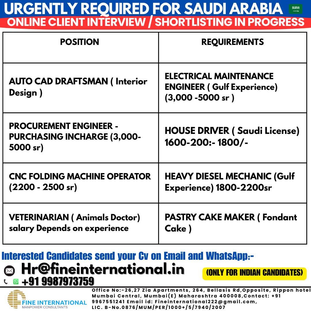 URGENTLY REQUIRED FOR SAUDI ARABIA
