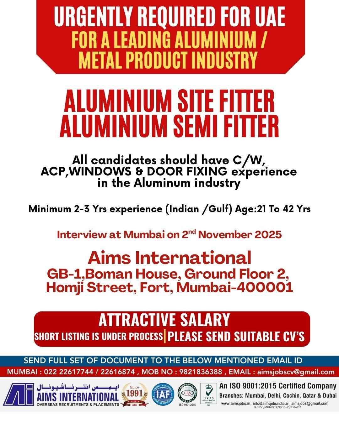 URGENTLY REQUIRED FOR UAE FOR A LEADING ALUMINIUM /METAL PRODUCT INDUSTRY