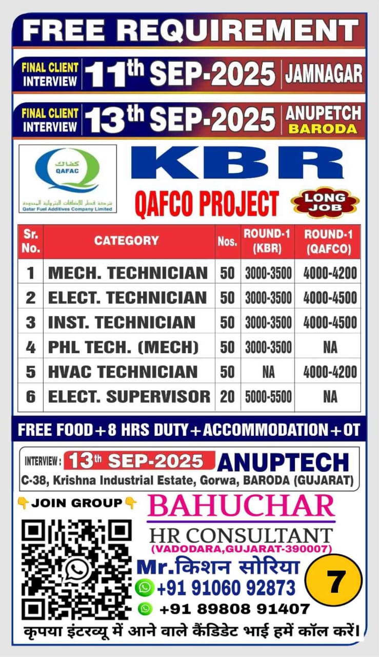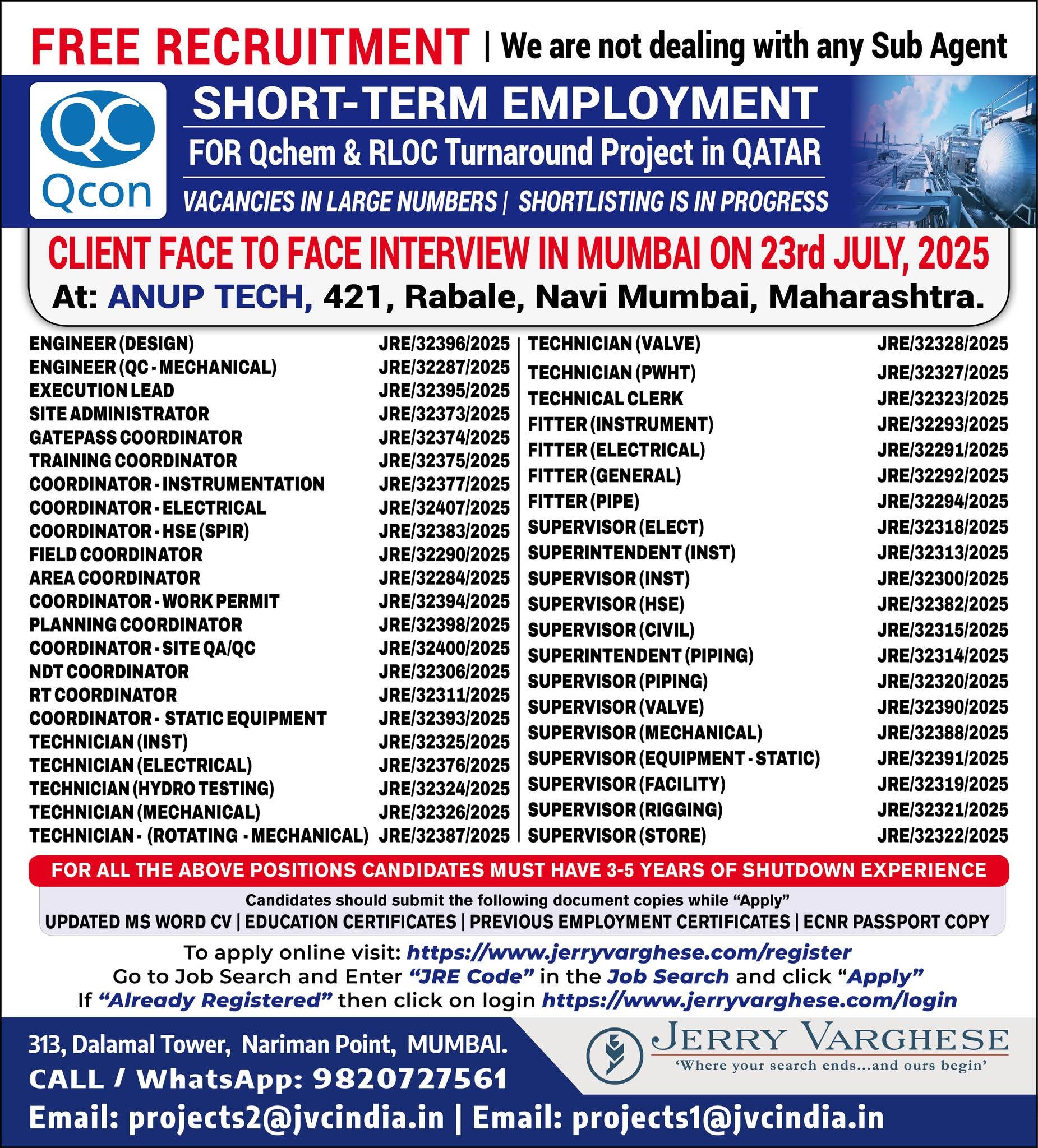 Free Recruitment SHUTDOWN MANPOWER REQUIREMENT FOR QCHEM & RLOC TURNAROUND PROJECT
