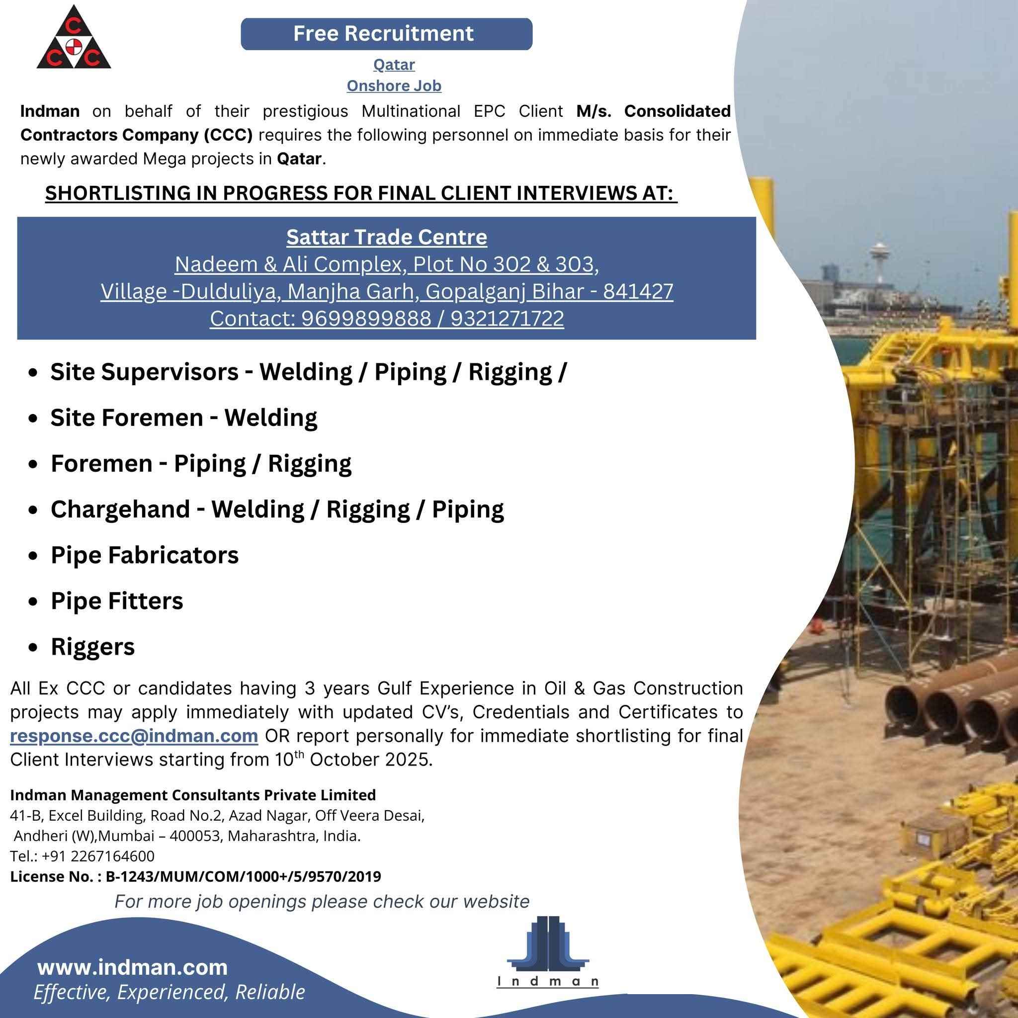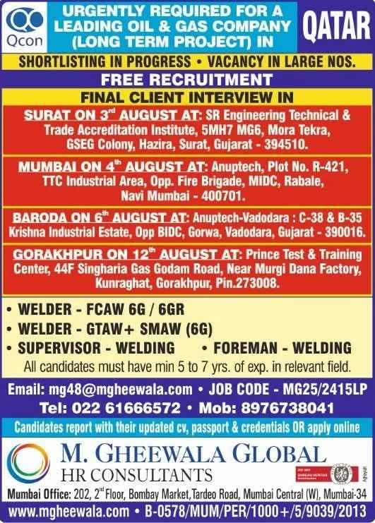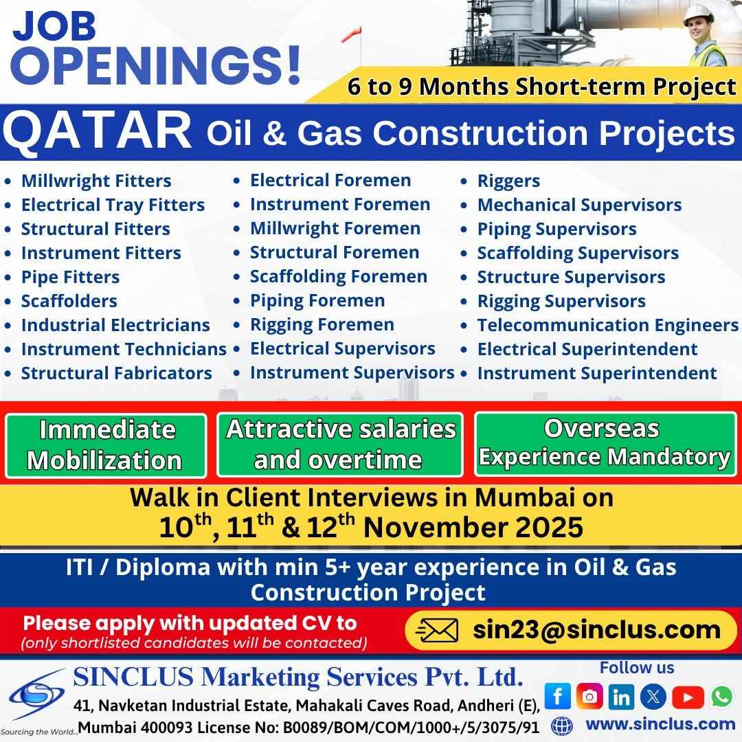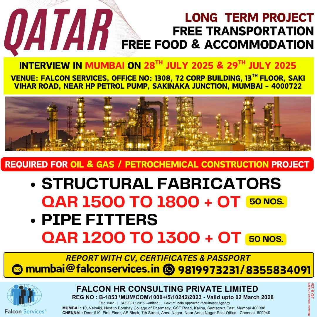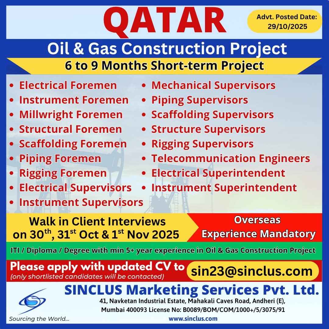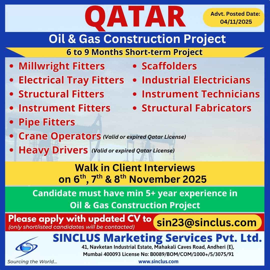 Urgent Requirement For Qatar Oil & gas construction