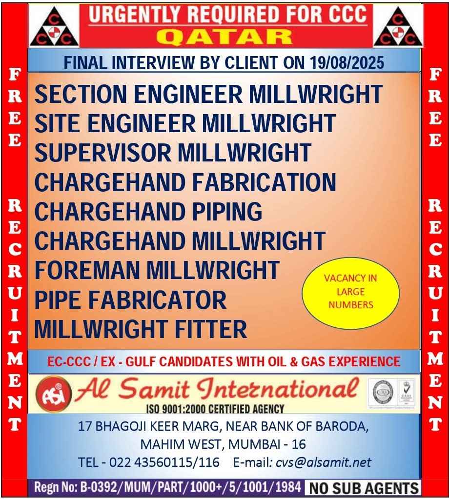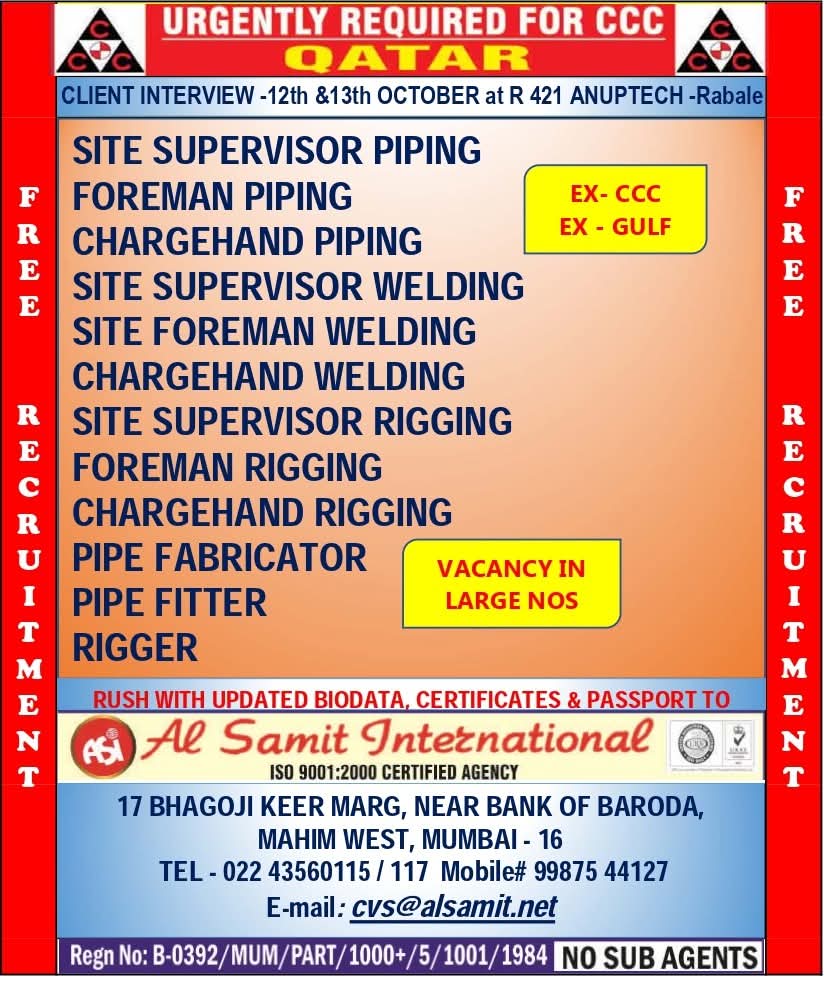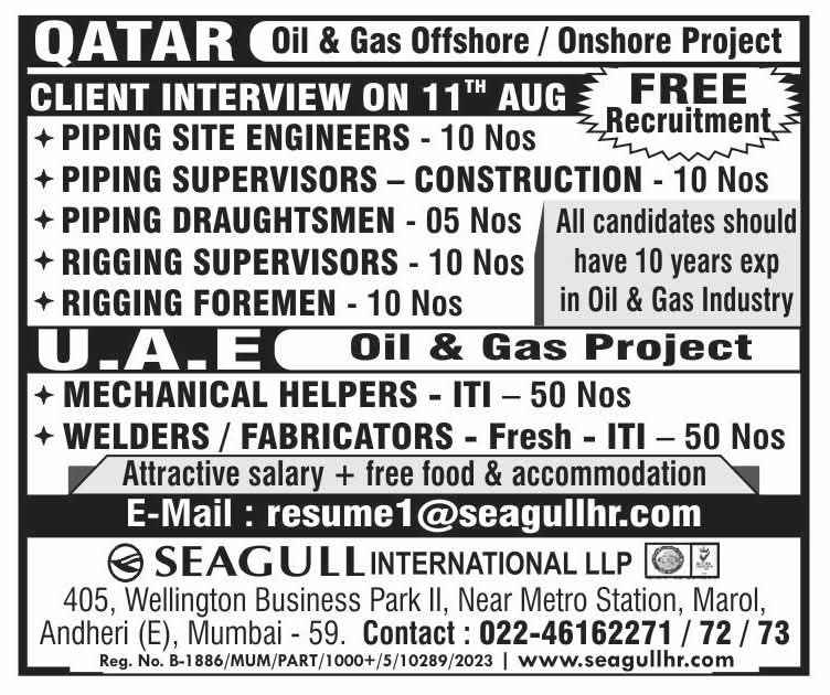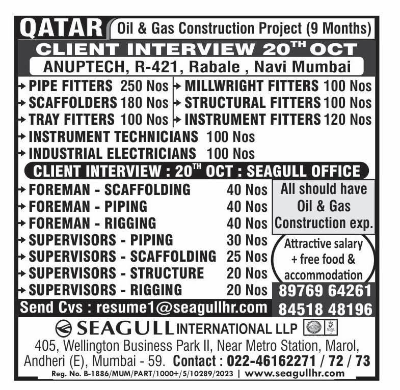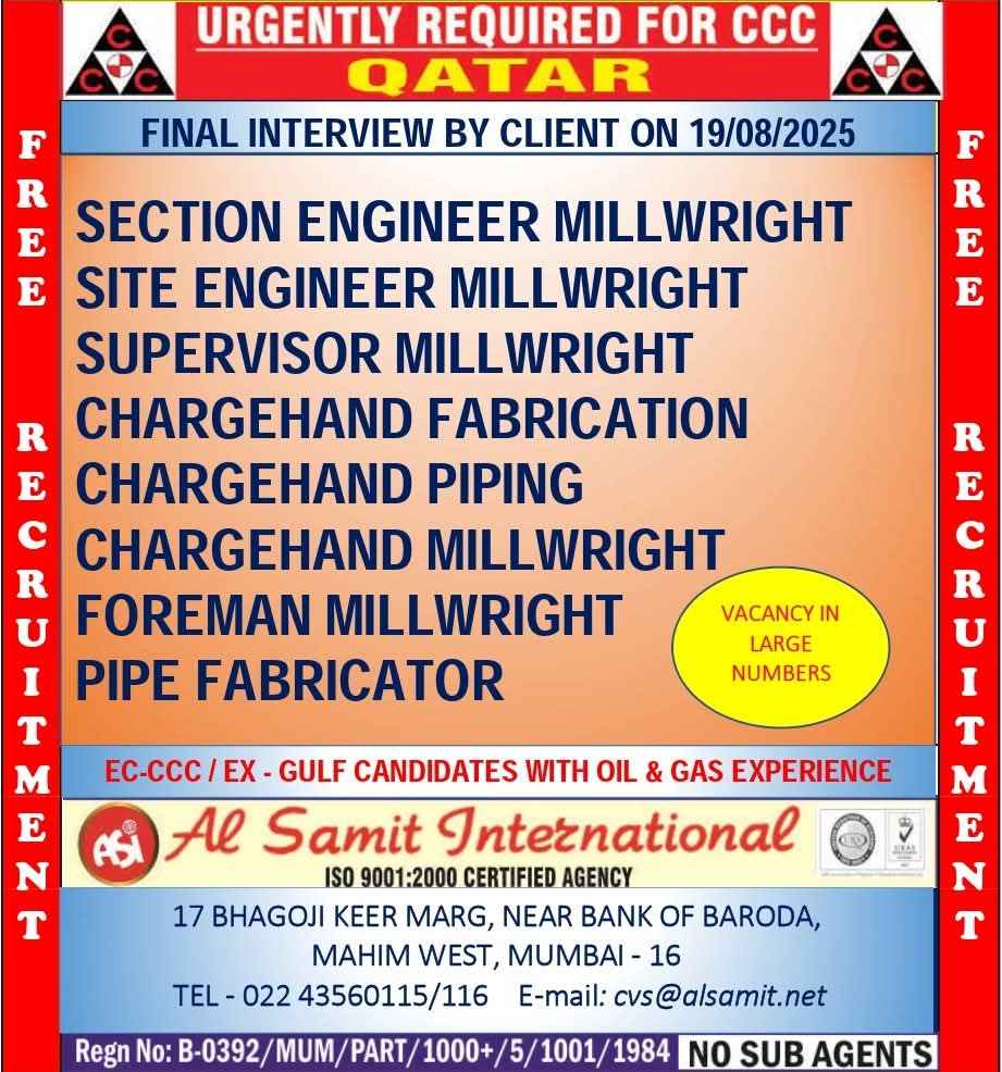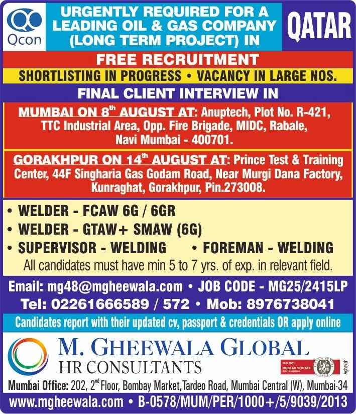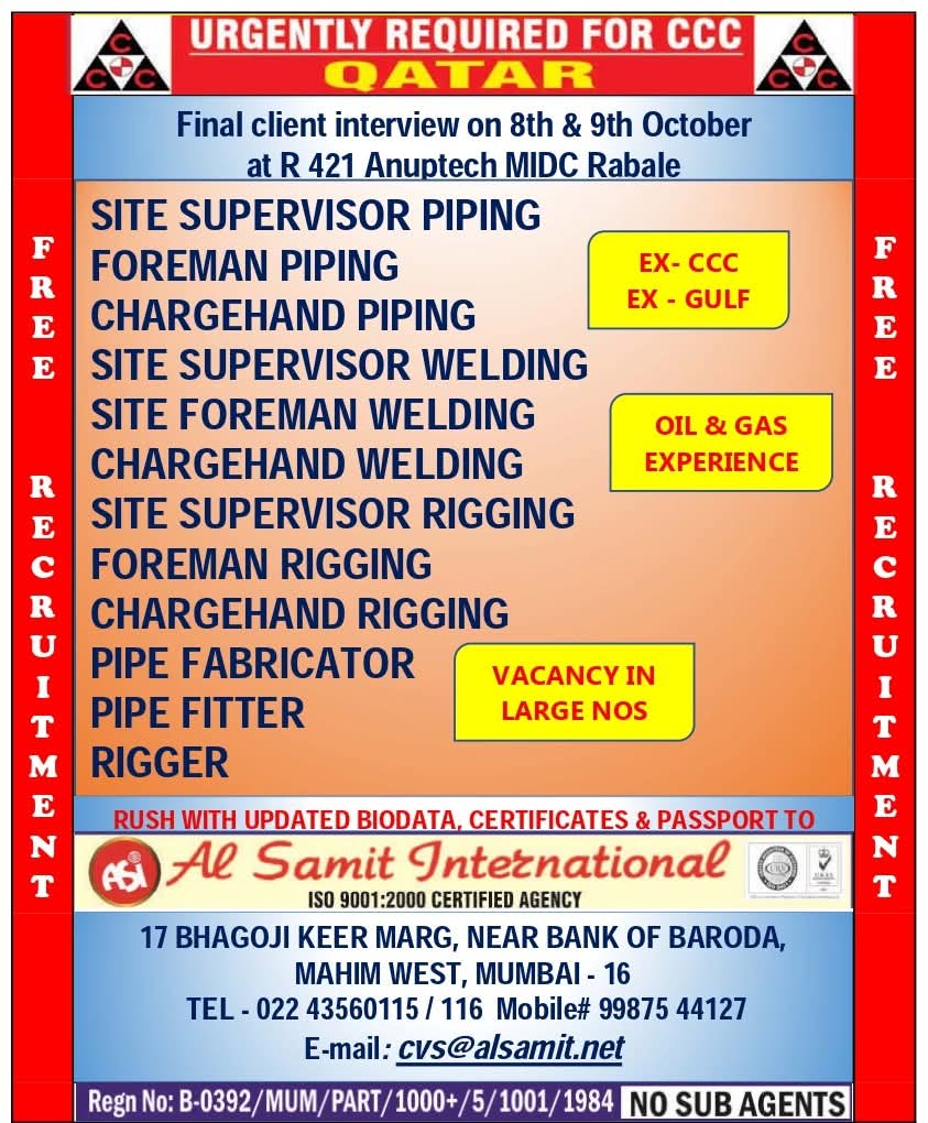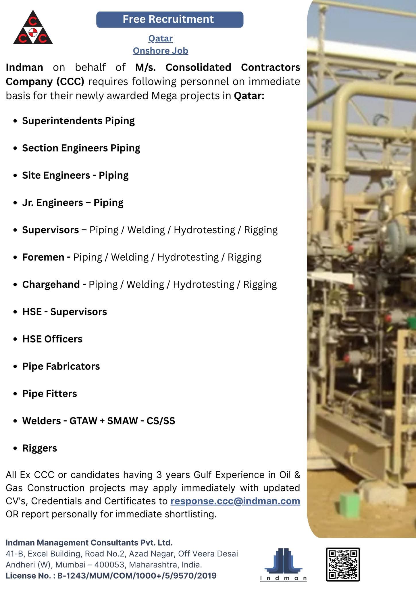 Urgent Requirement For Qatar Oil & gas construction