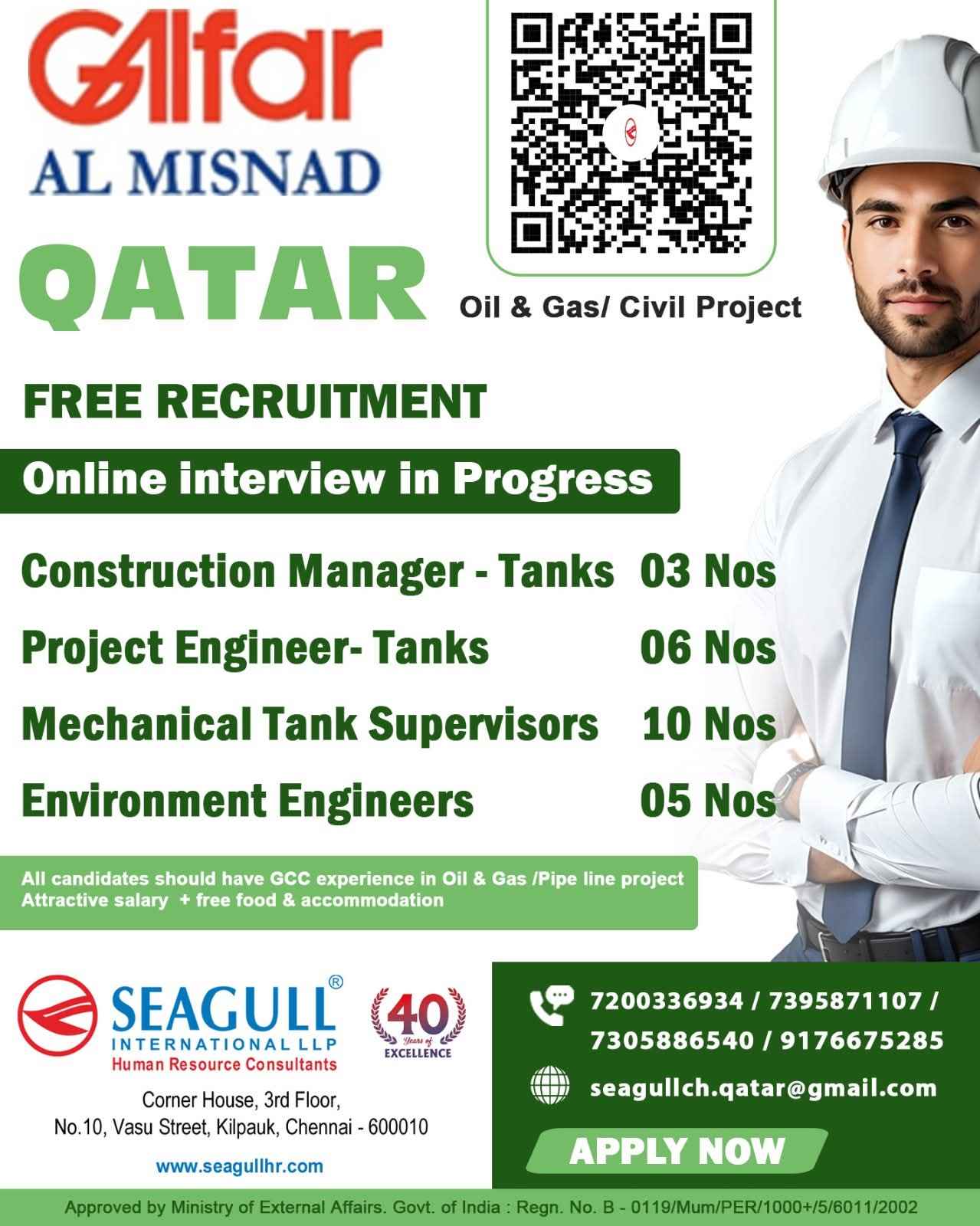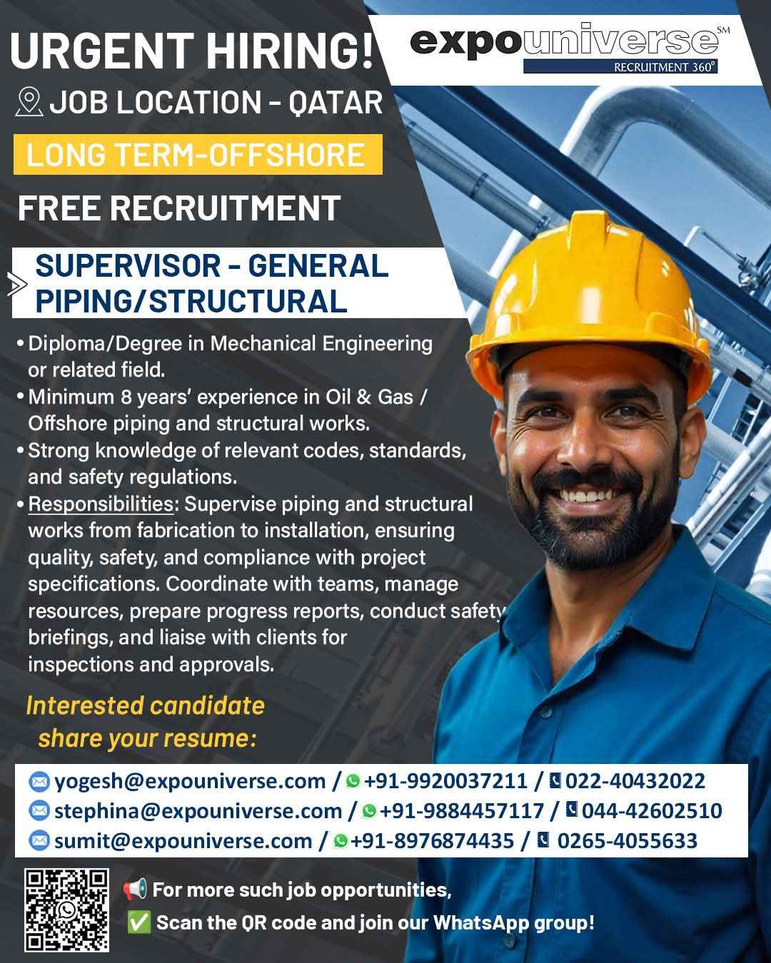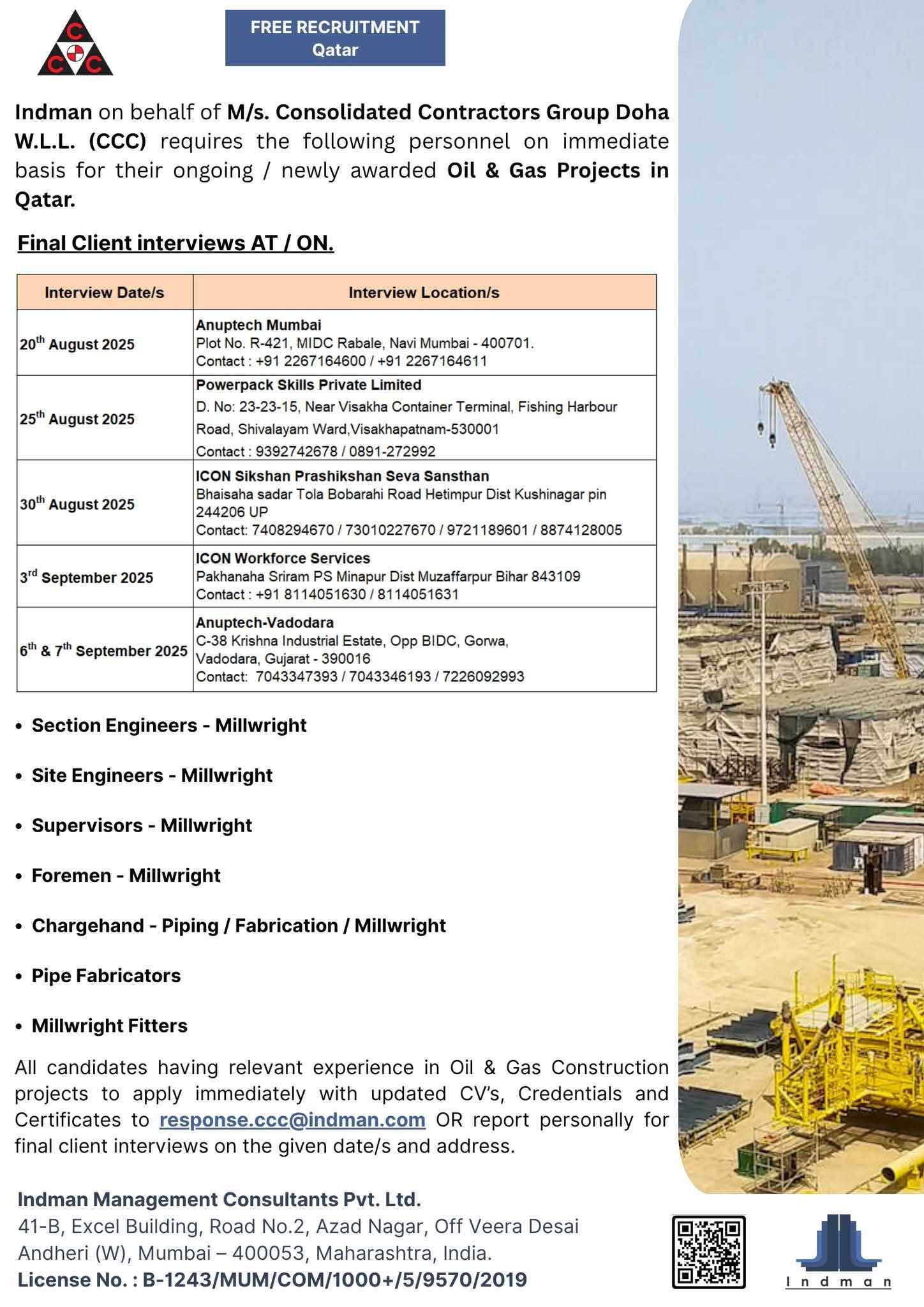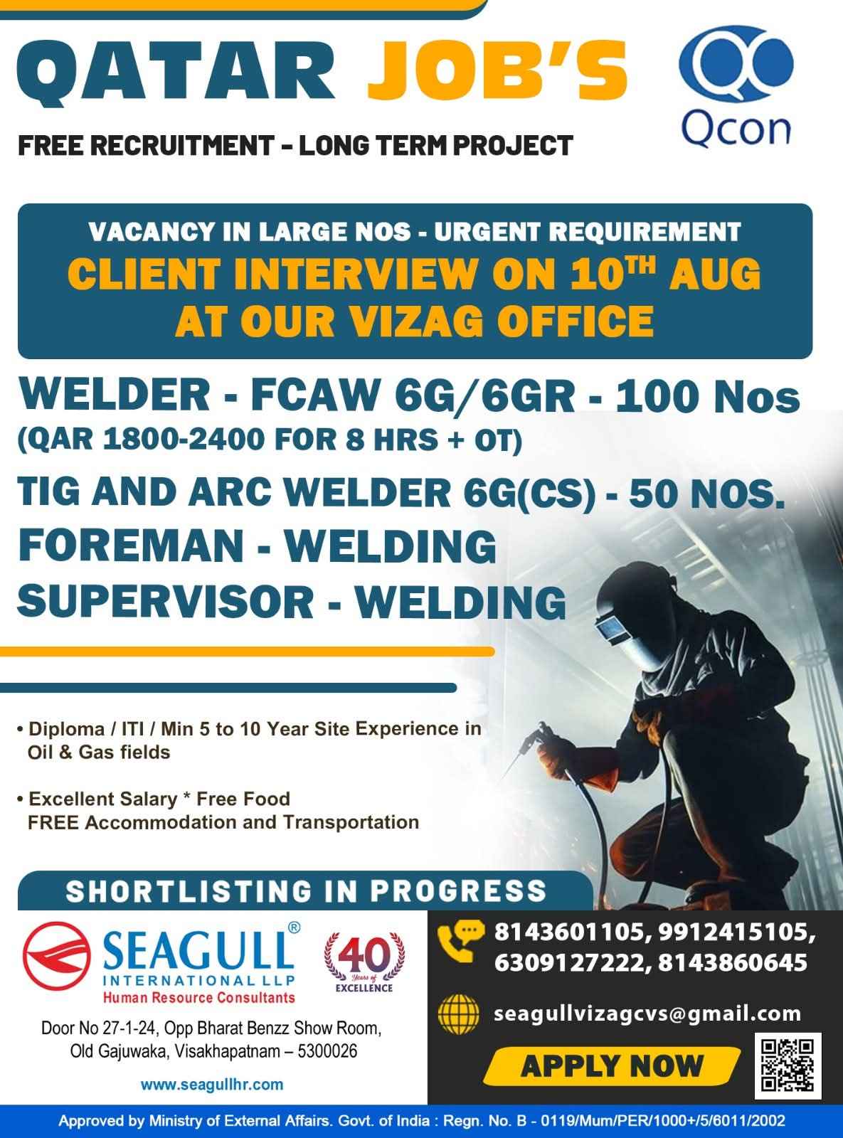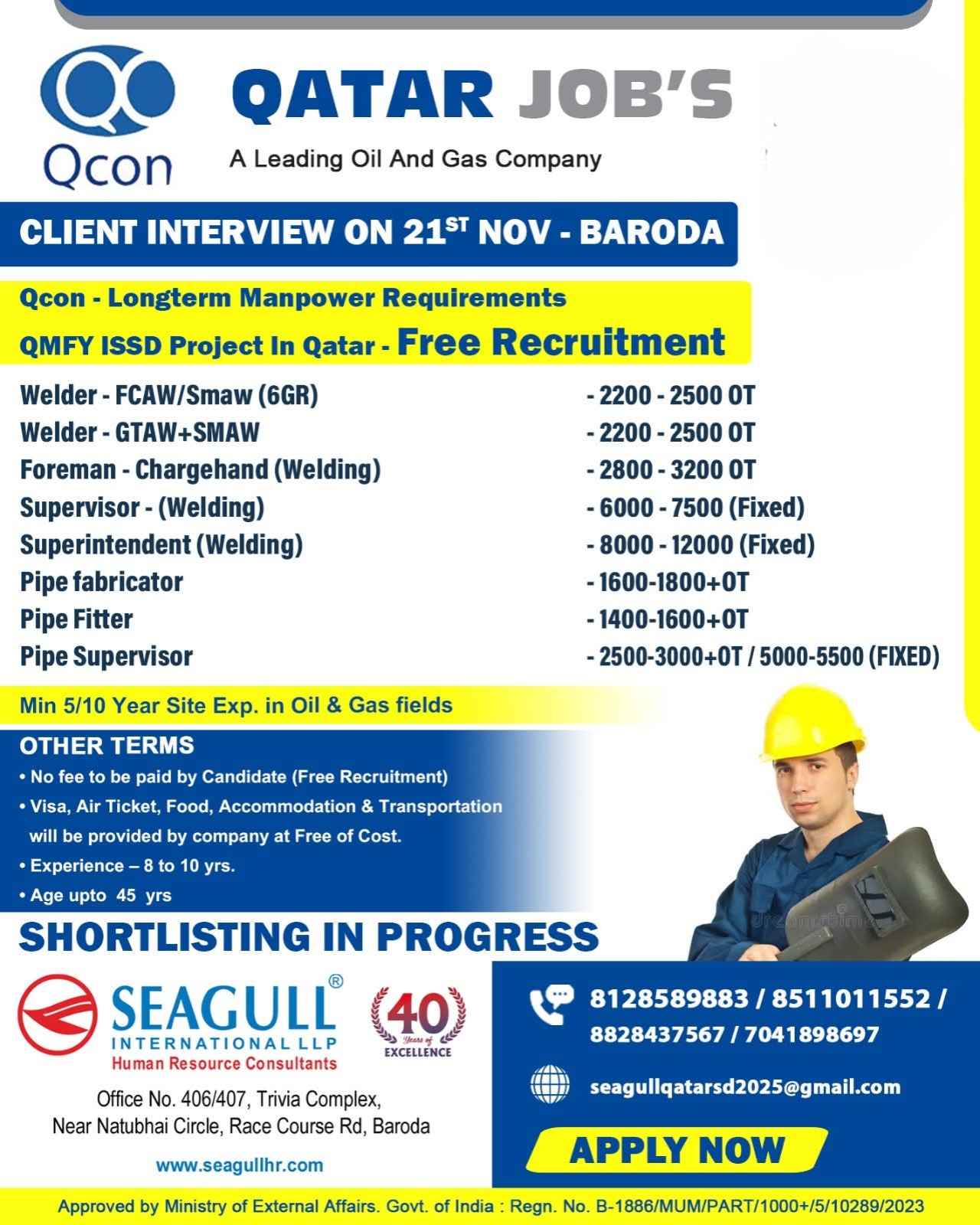 Urgent Requirement For Qatar Oil & gas construction