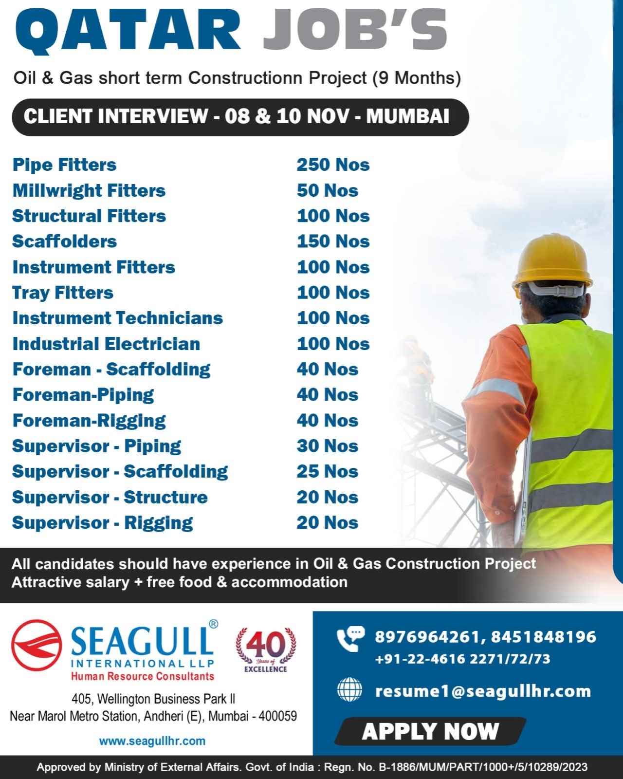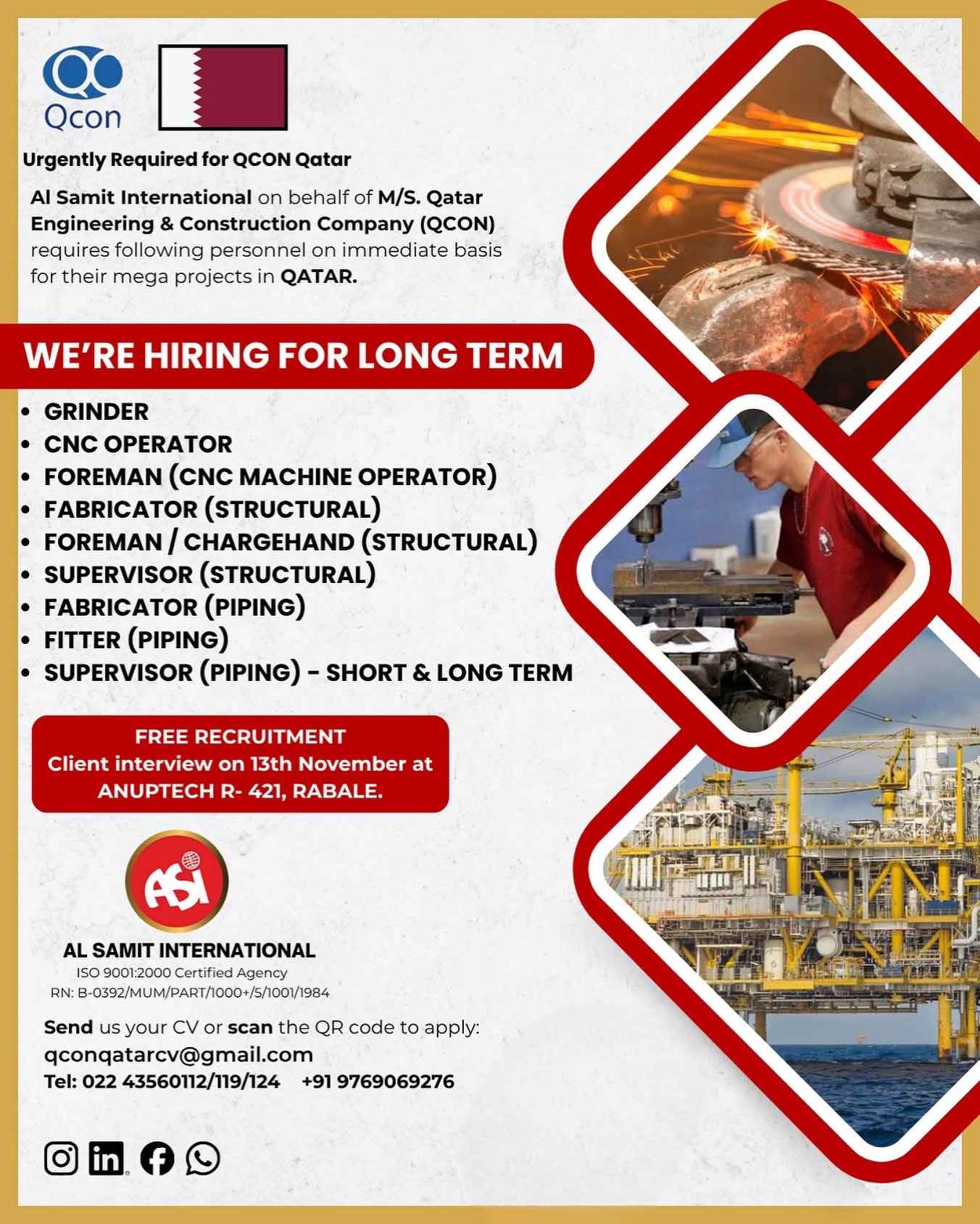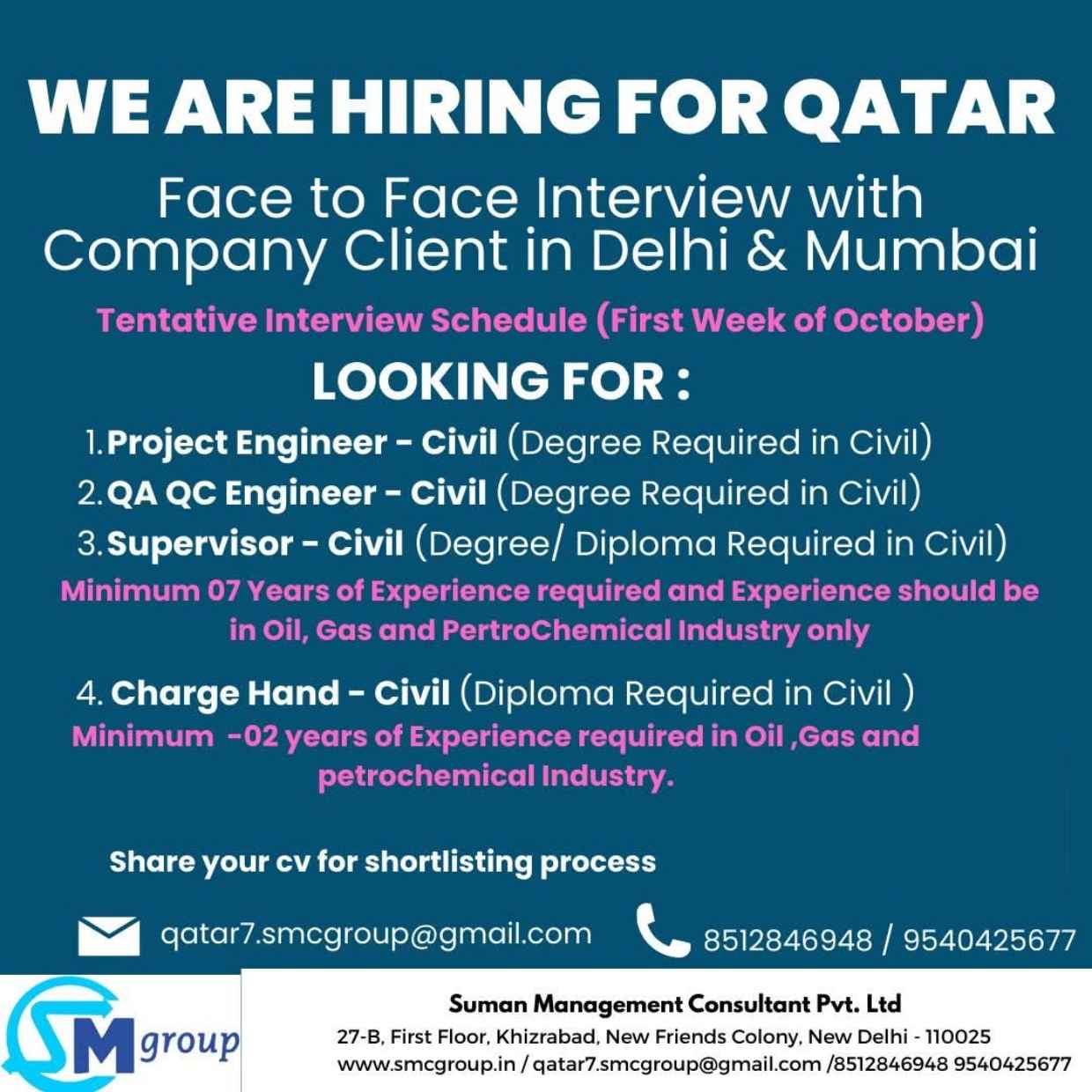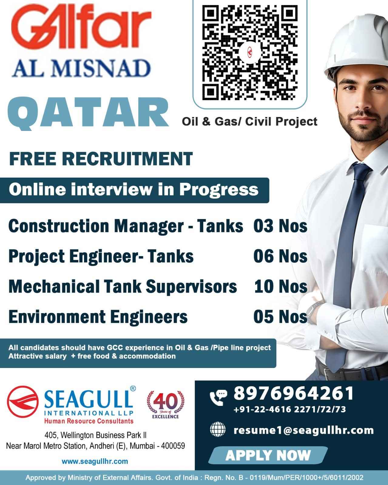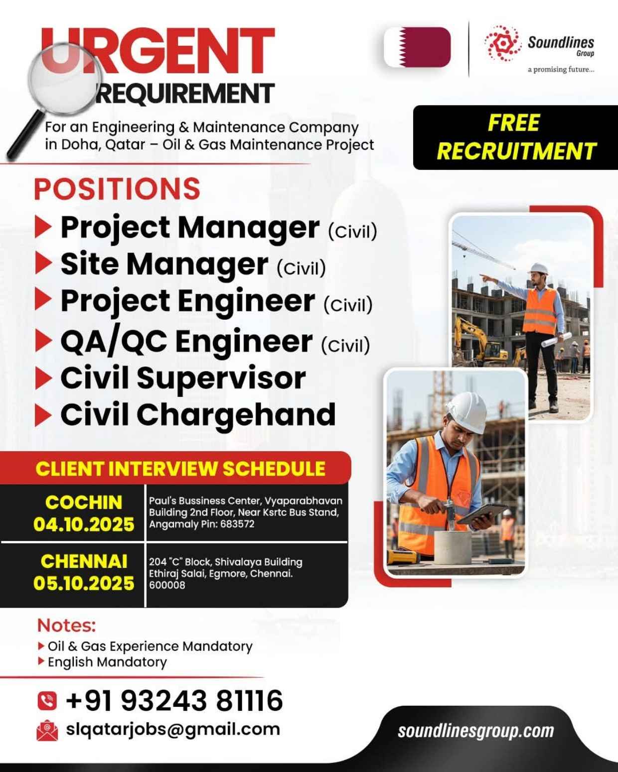 Urgent Requirement For Qatar Oil & gas construction