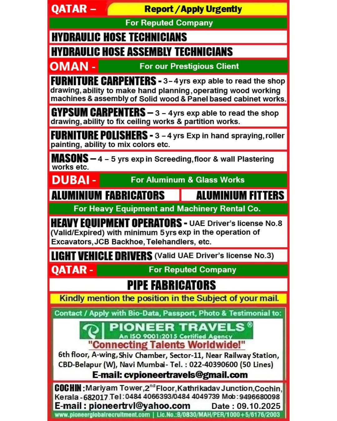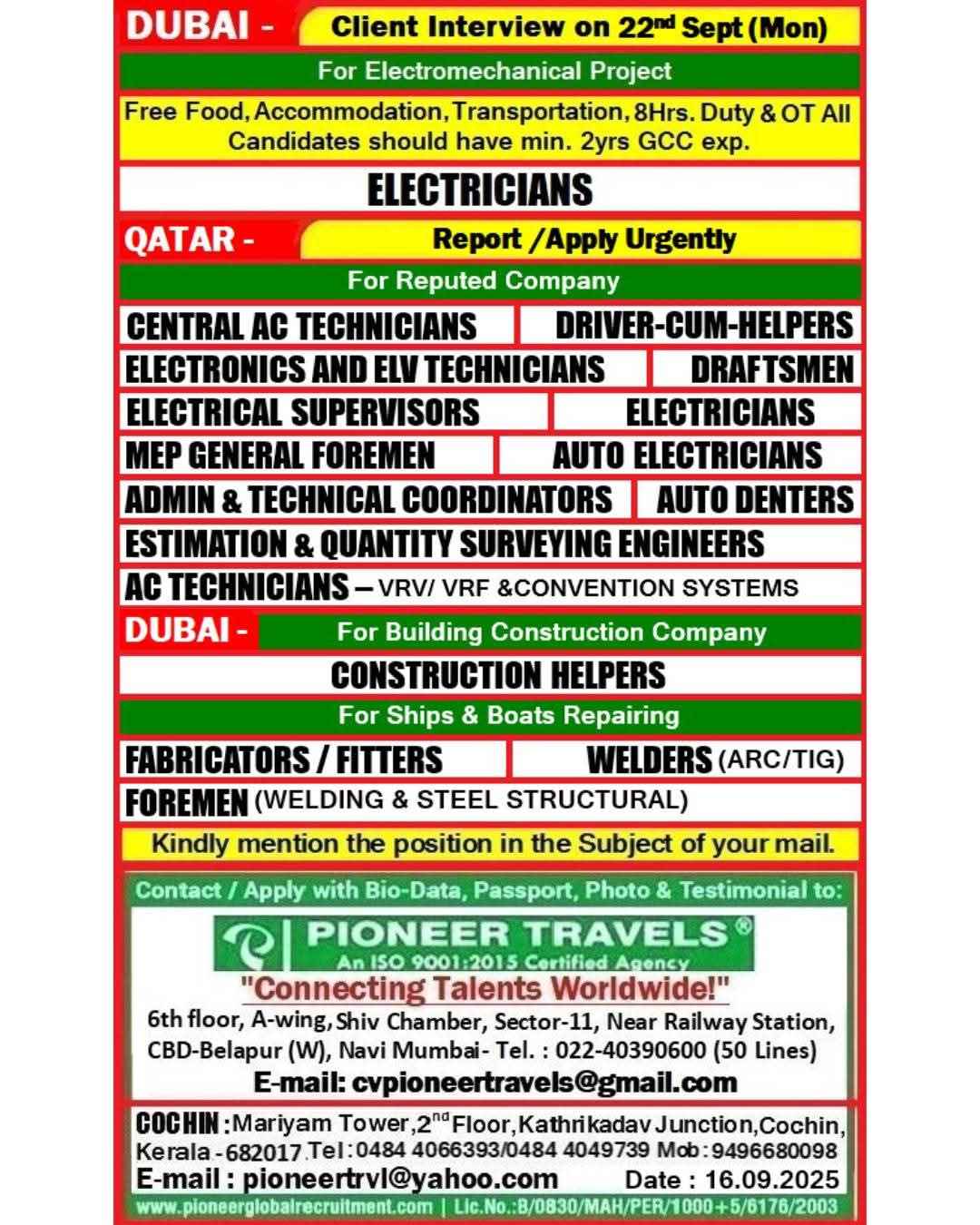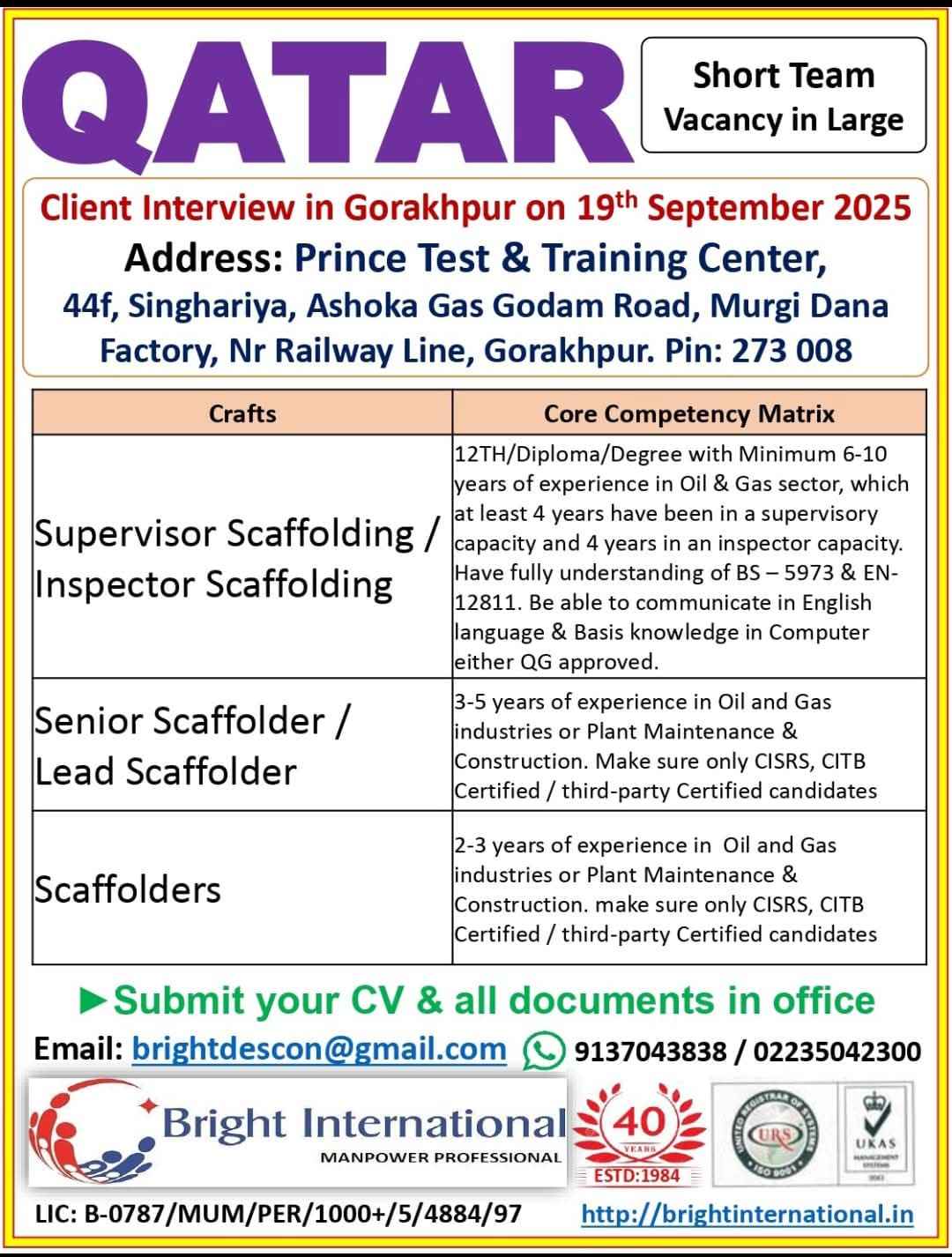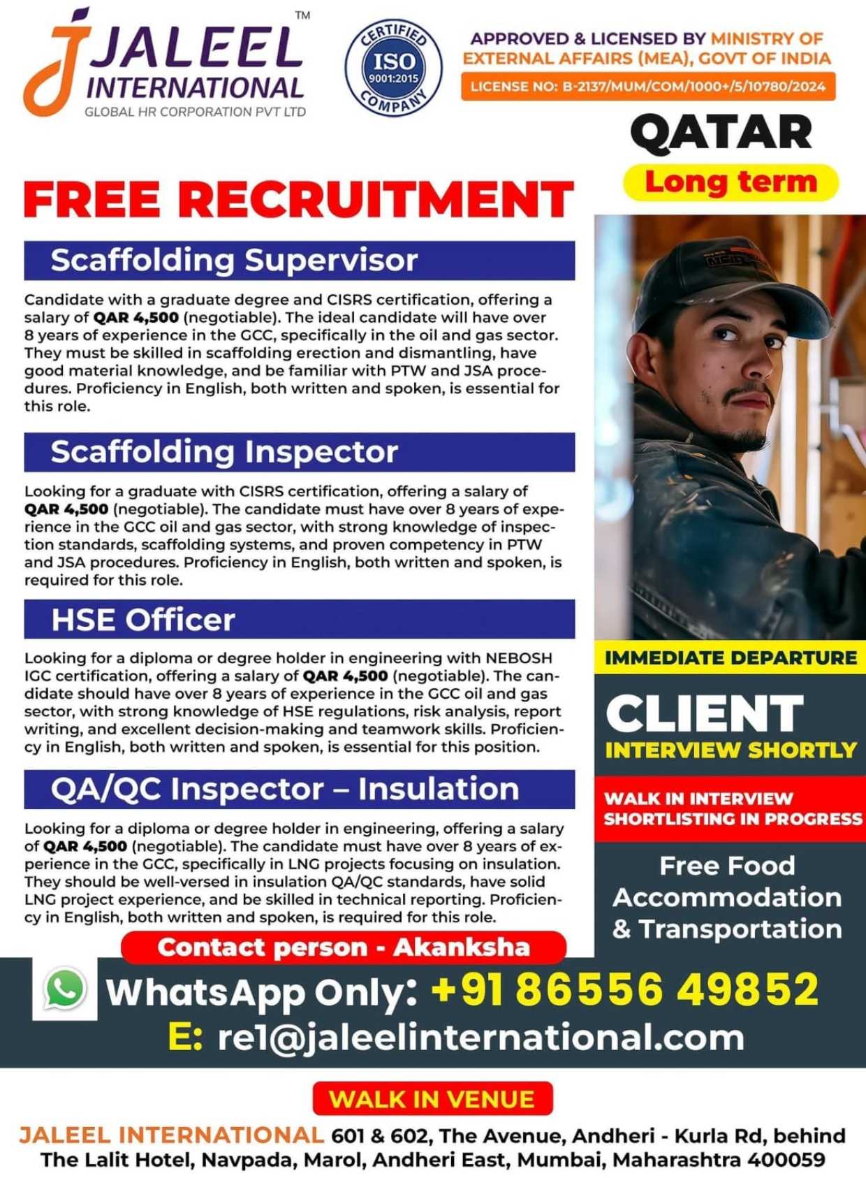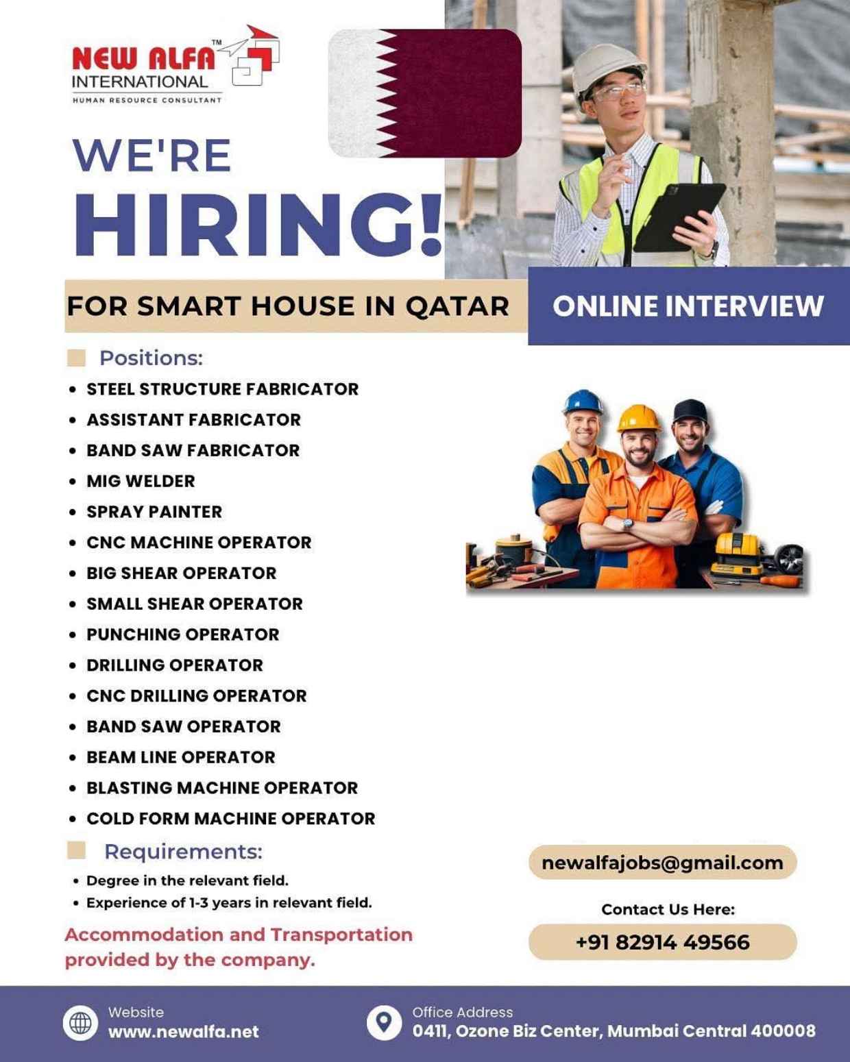Urgent Requirement For Qatar Oil & gas construction