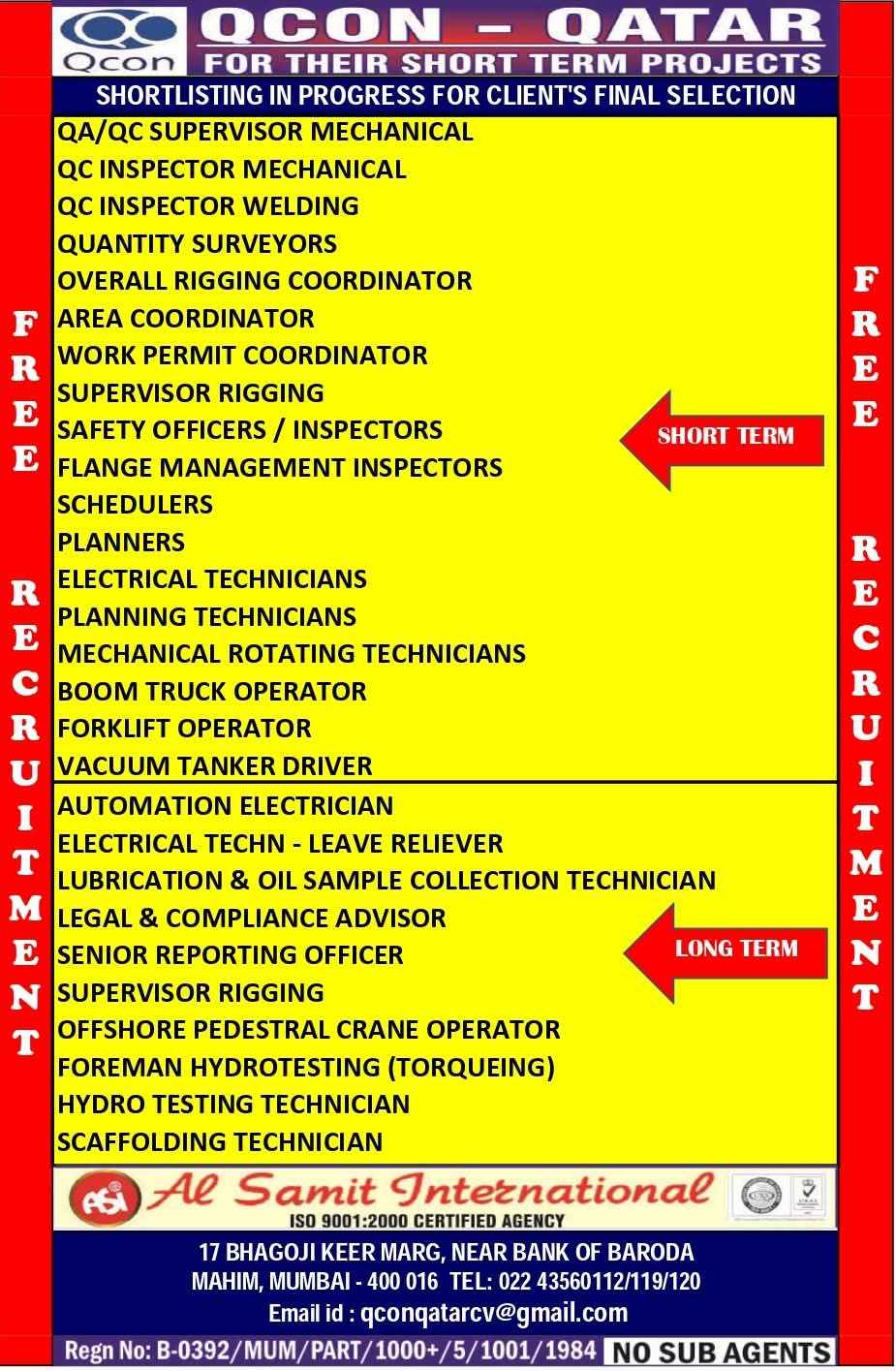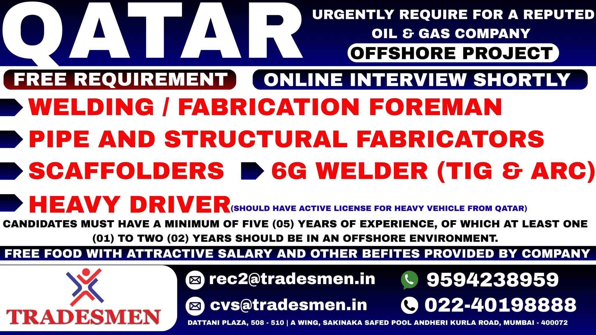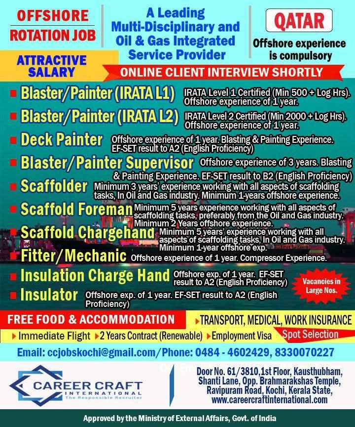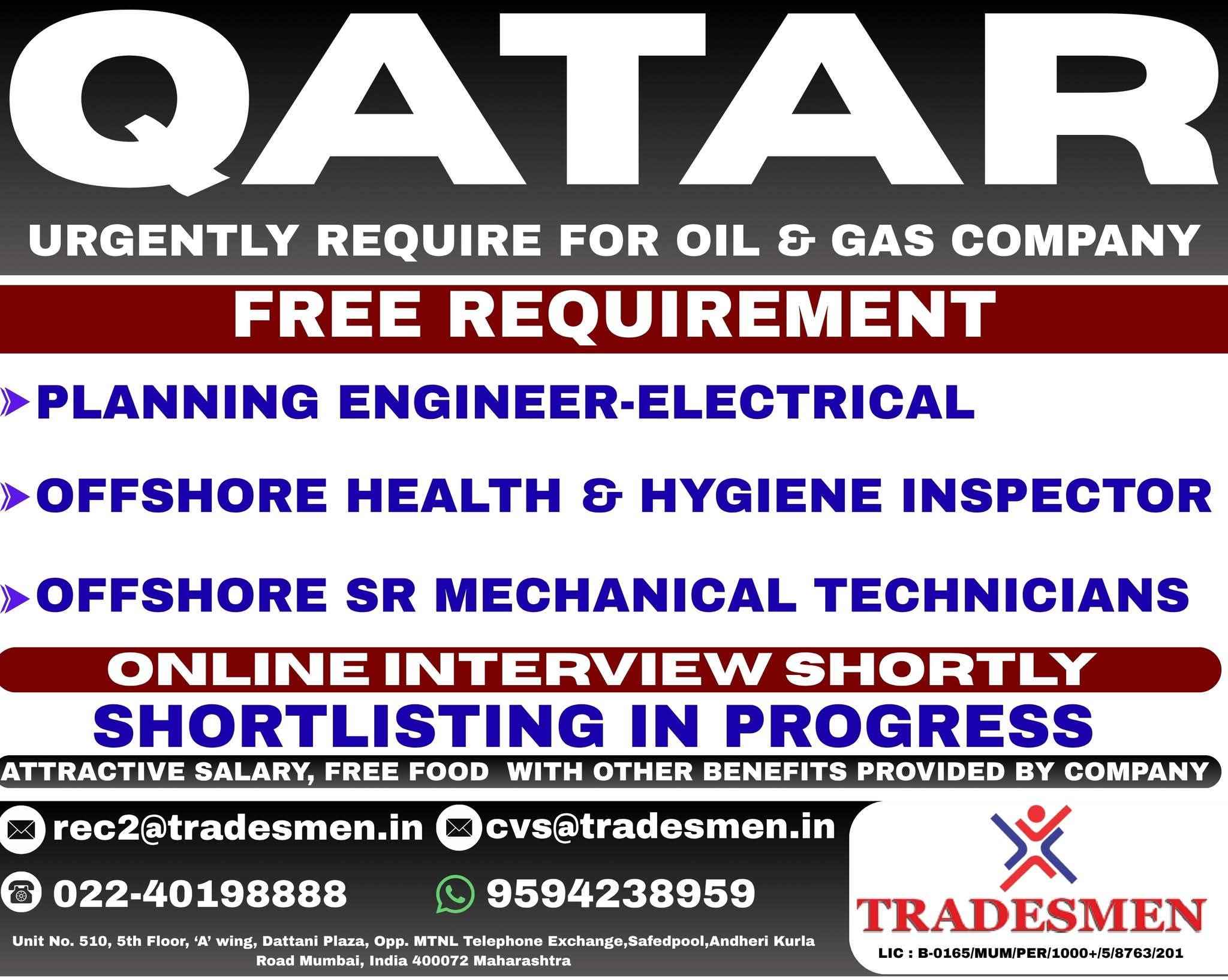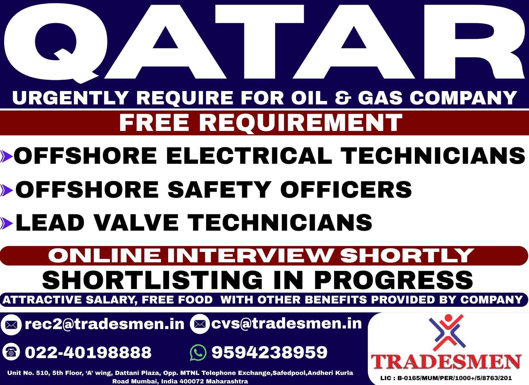 QATAR JOB'S An International company requires for their OFFSHORE & ONSHORE, Oil & Gas Projects FREE RECRUITMENT
