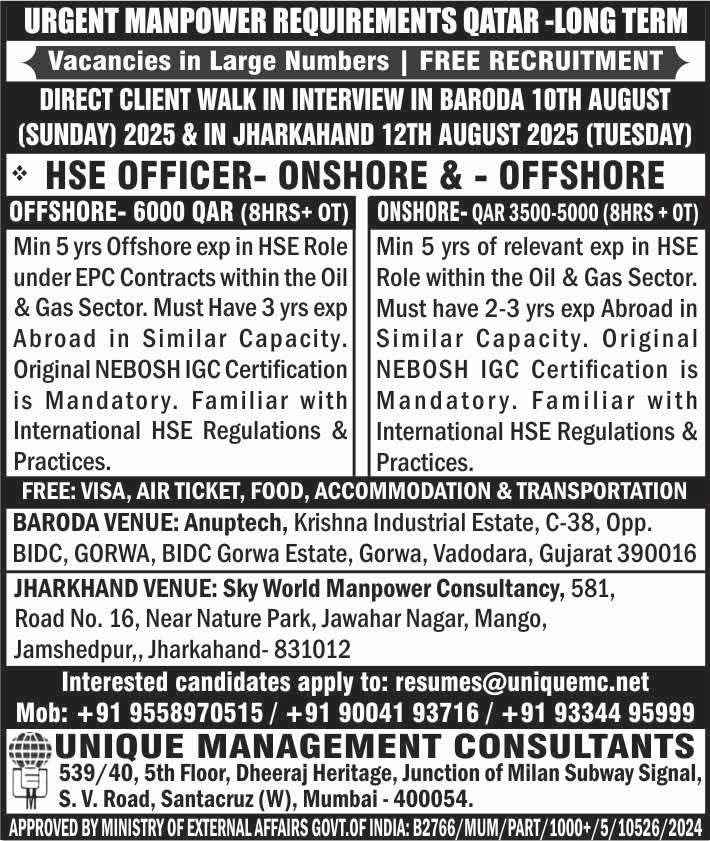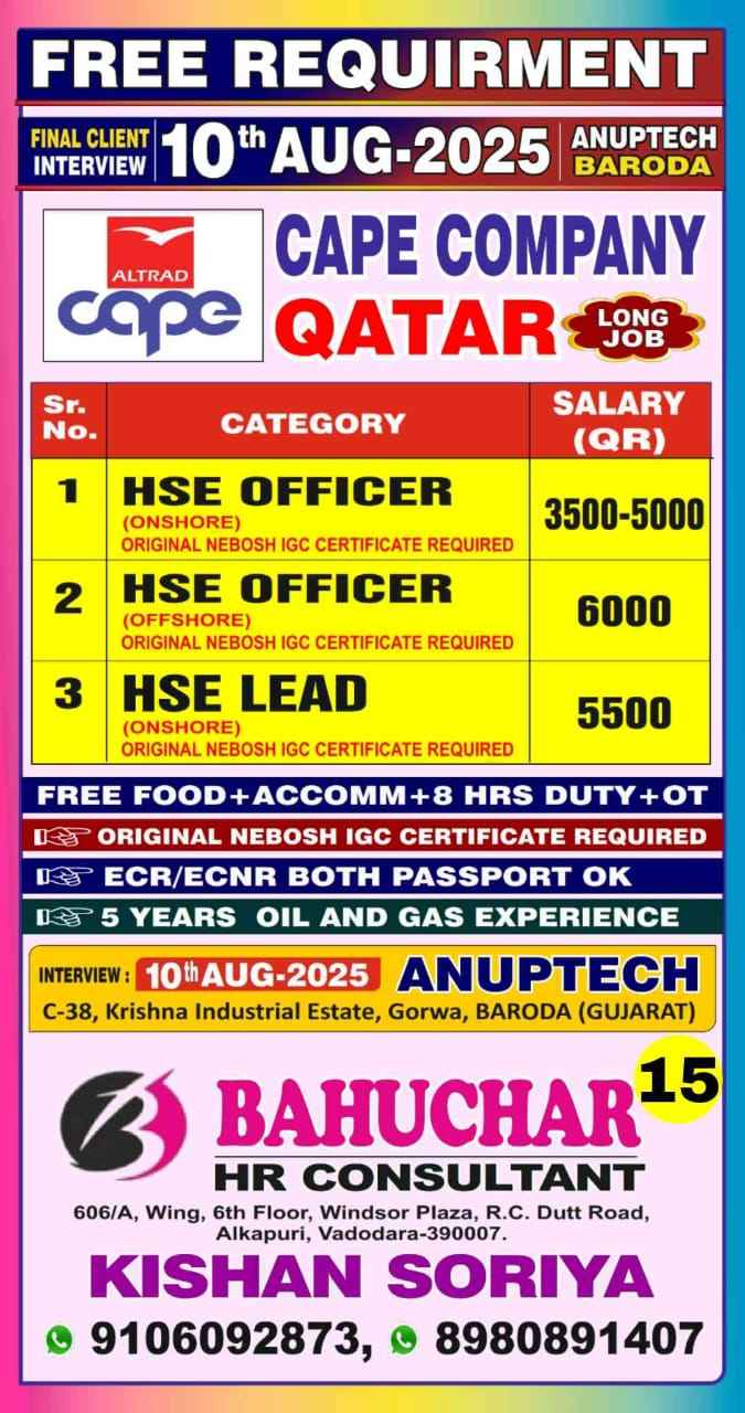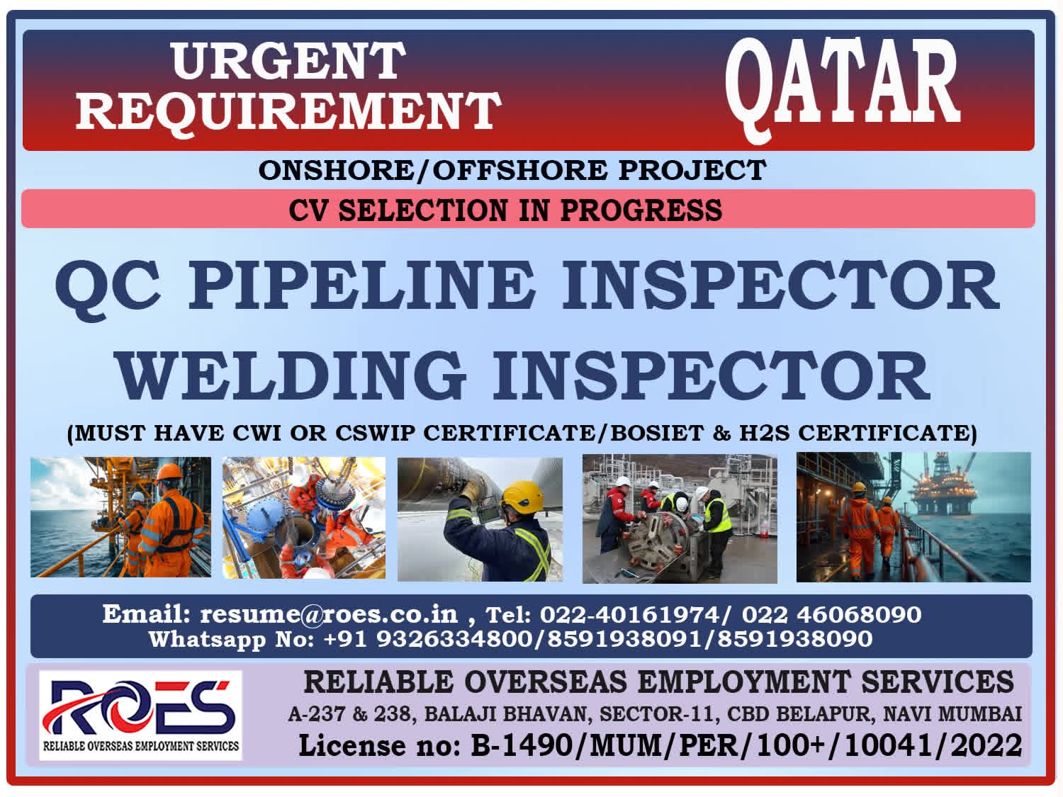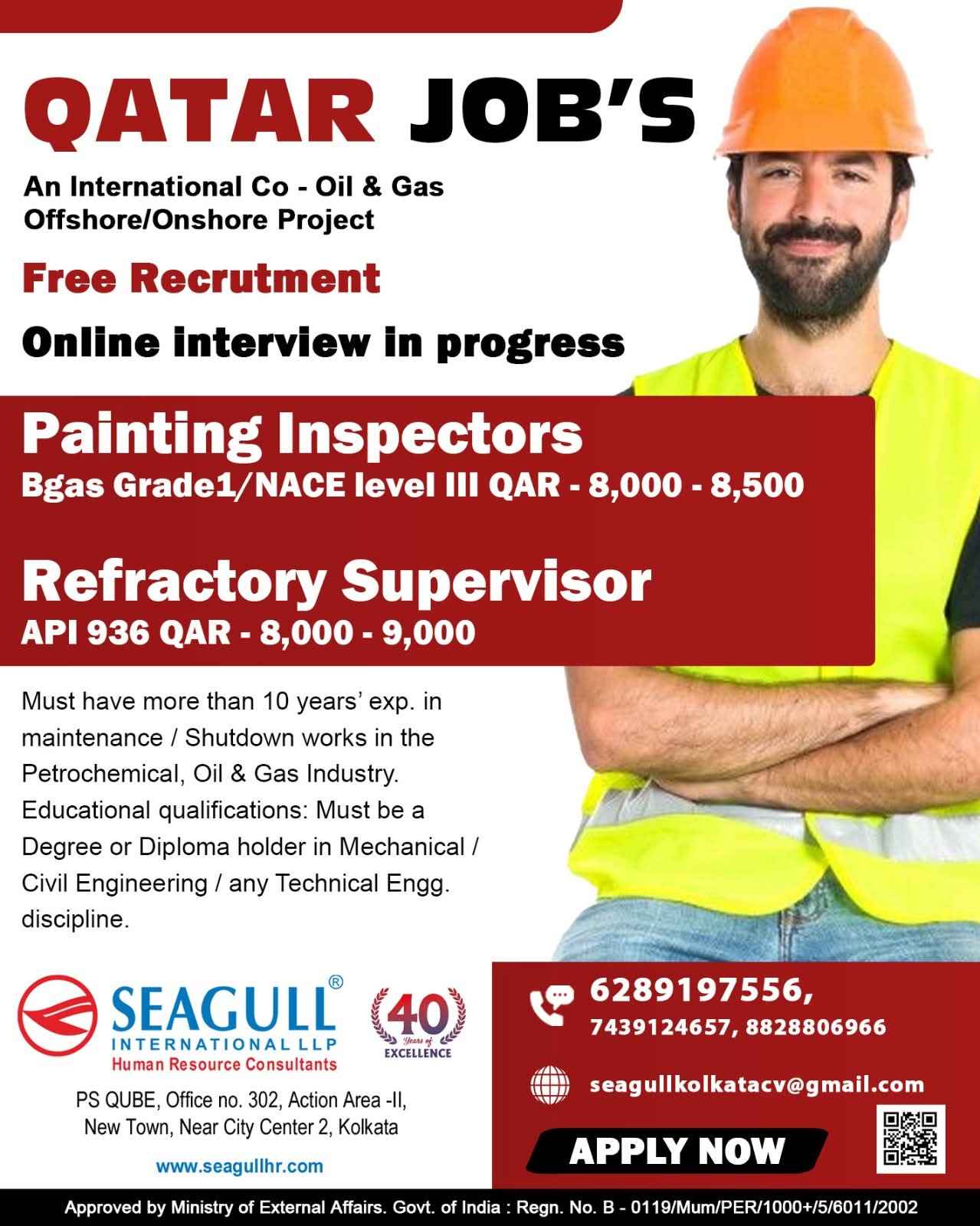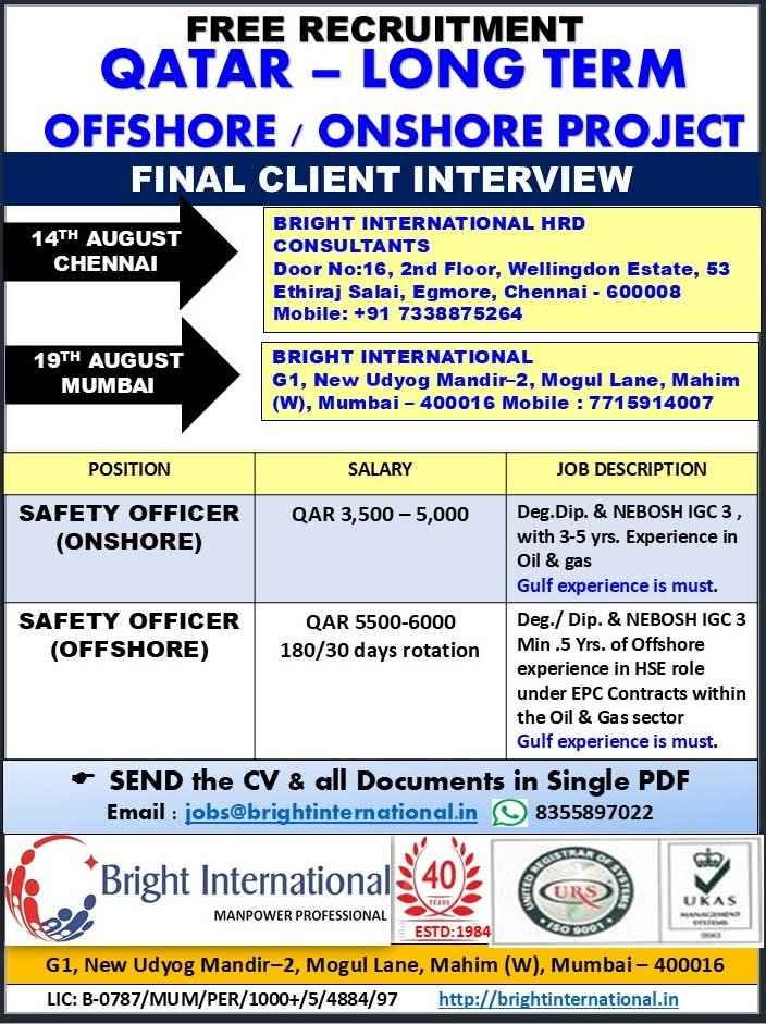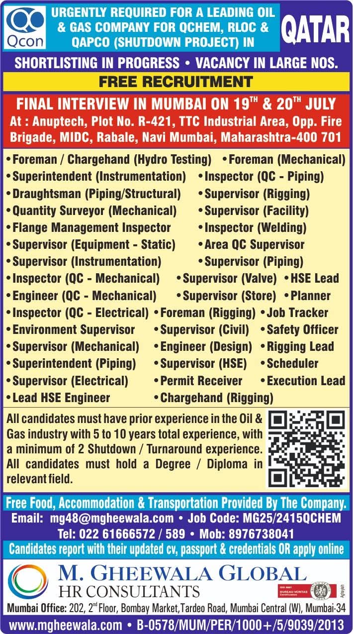 QATAR JOB'S An International company requires for their OFFSHORE & ONSHORE, Oil & Gas Projects FREE RECRUITMENT