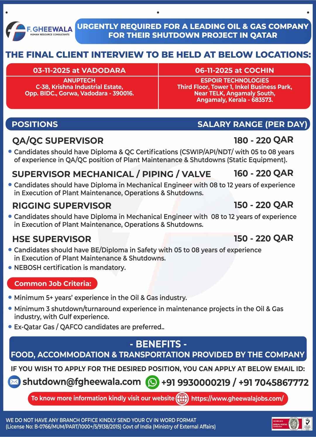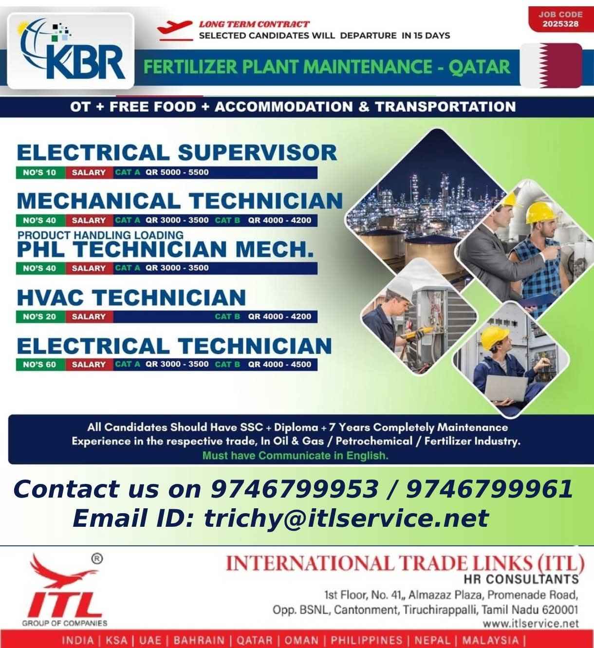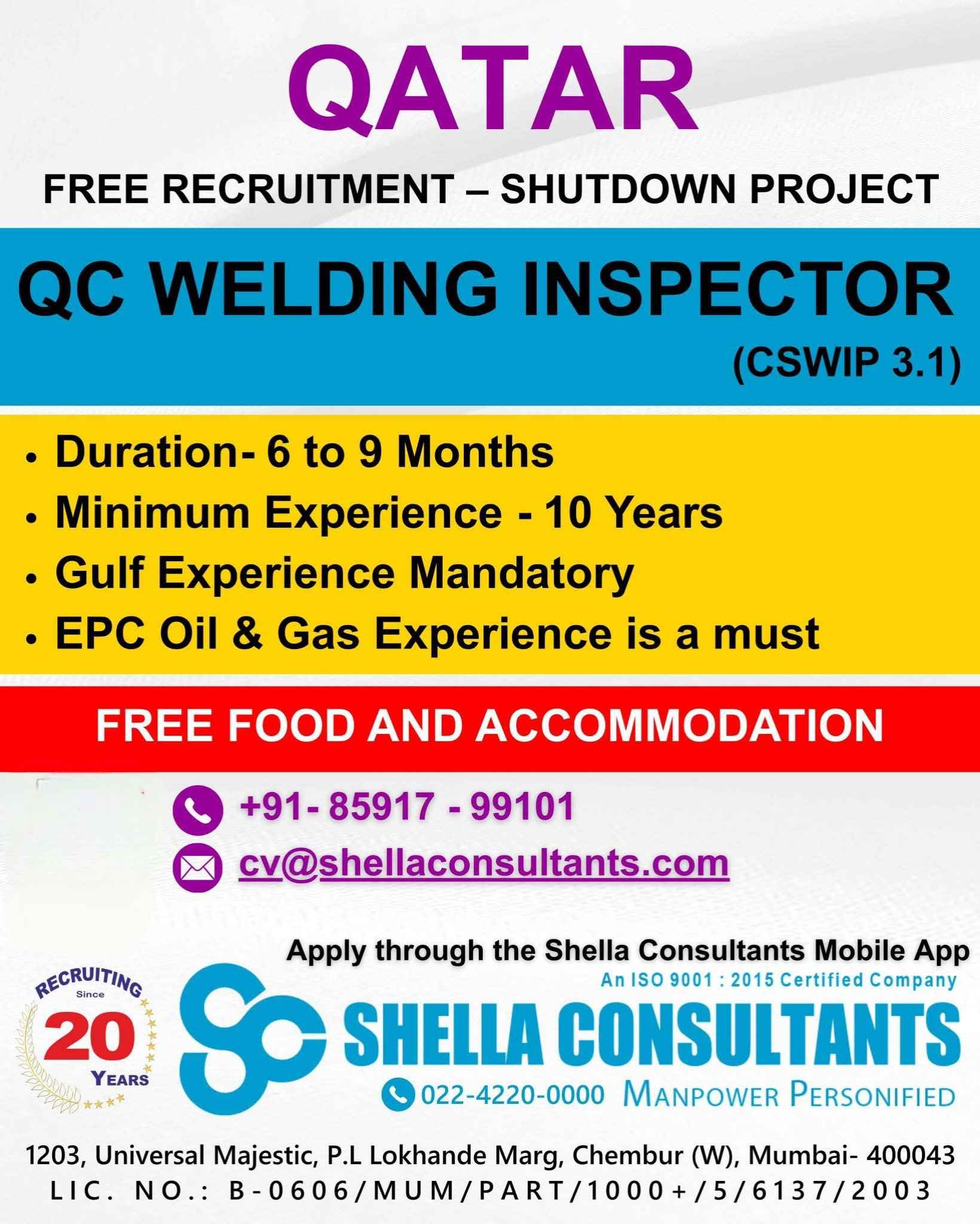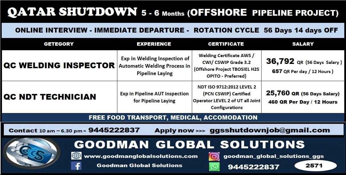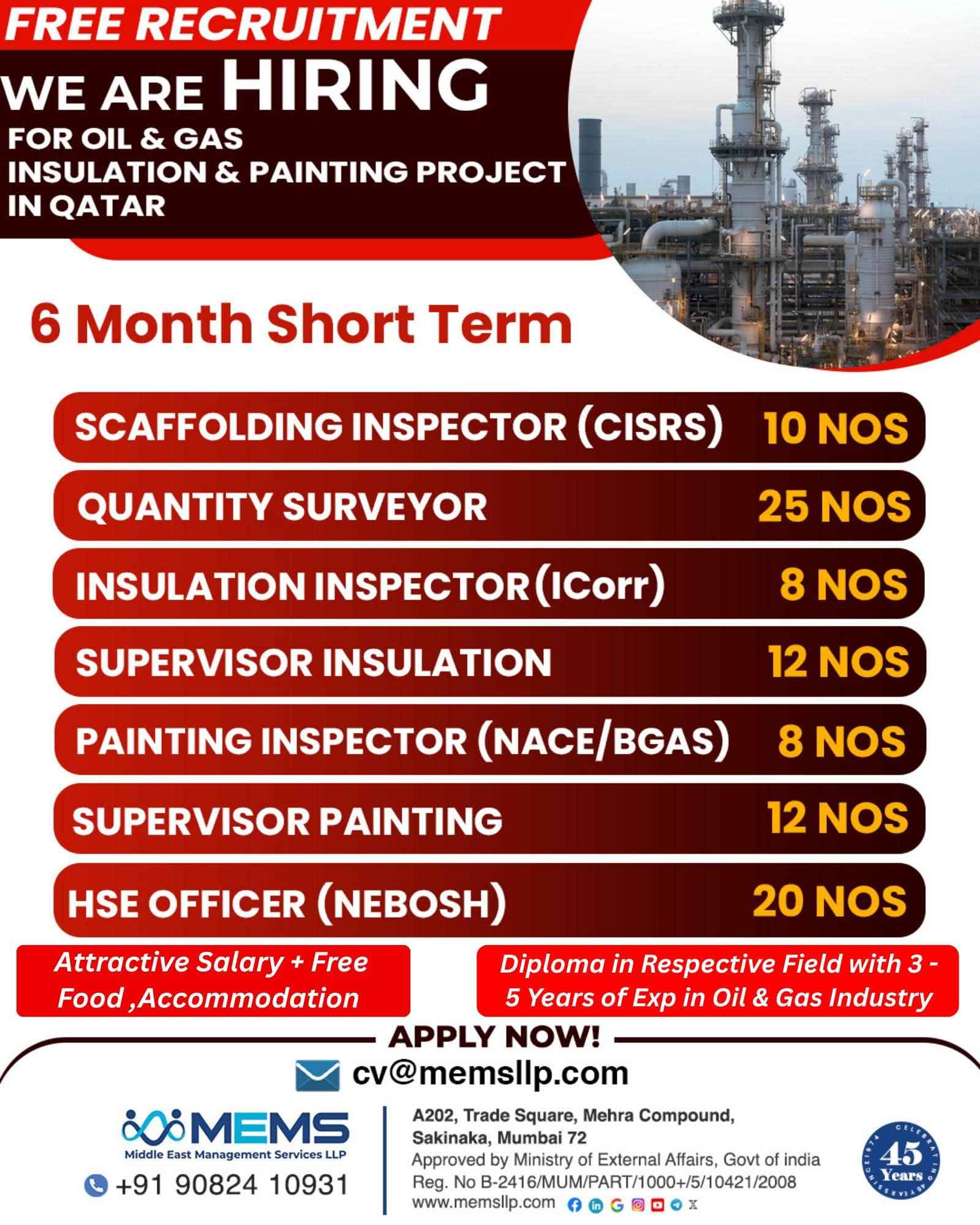 URGENTLY REQUIRED FOR A LEADING OIL & GAS COMPANY FOR QCHEM, RLOC & QAPCO (SHUTDOWN PROJECT) PROJECT IN QATAR