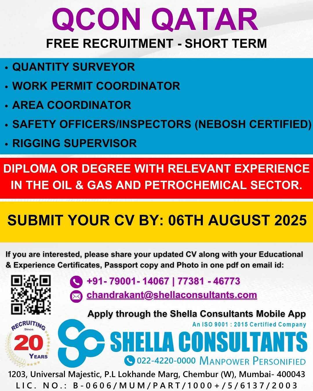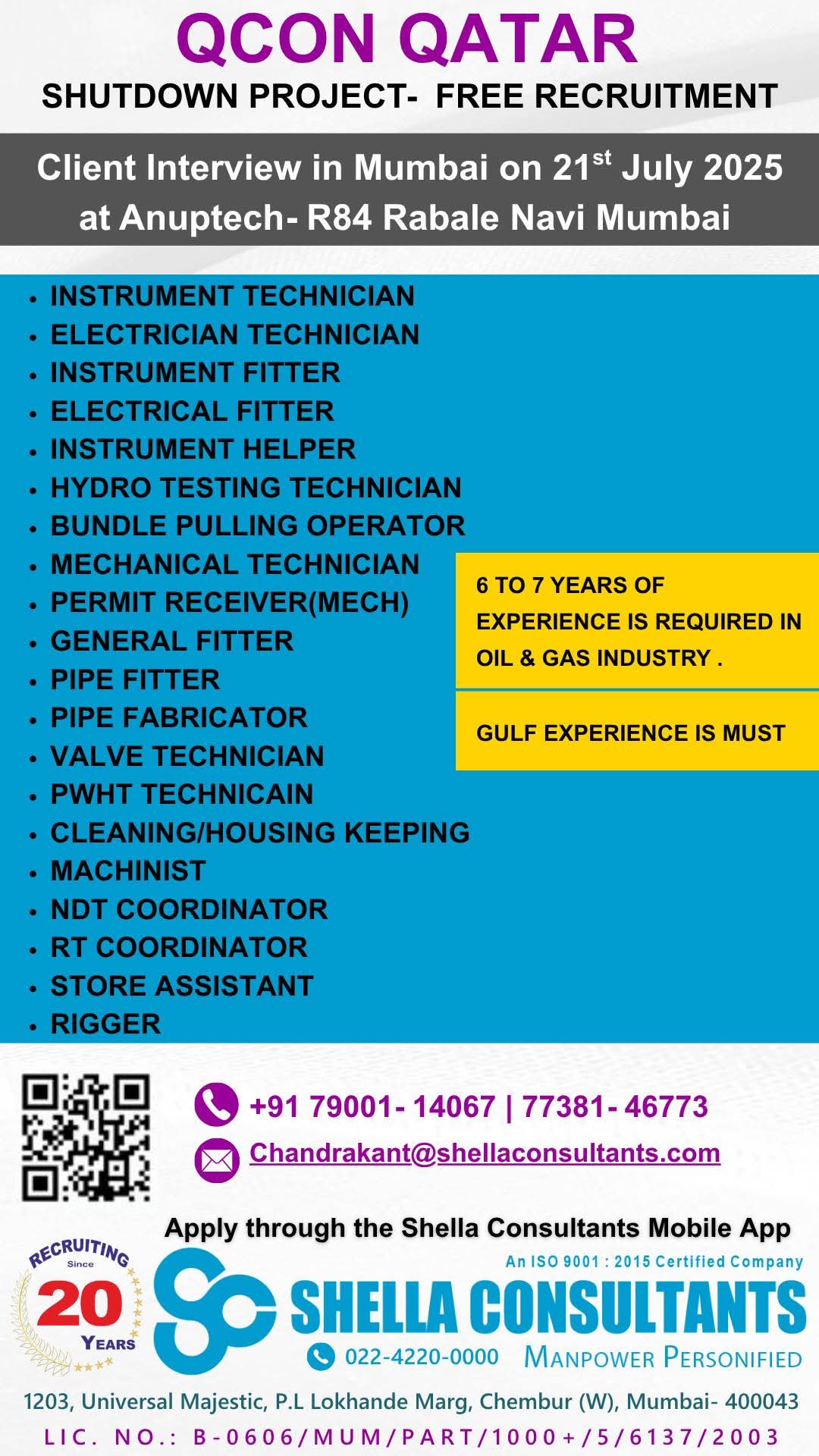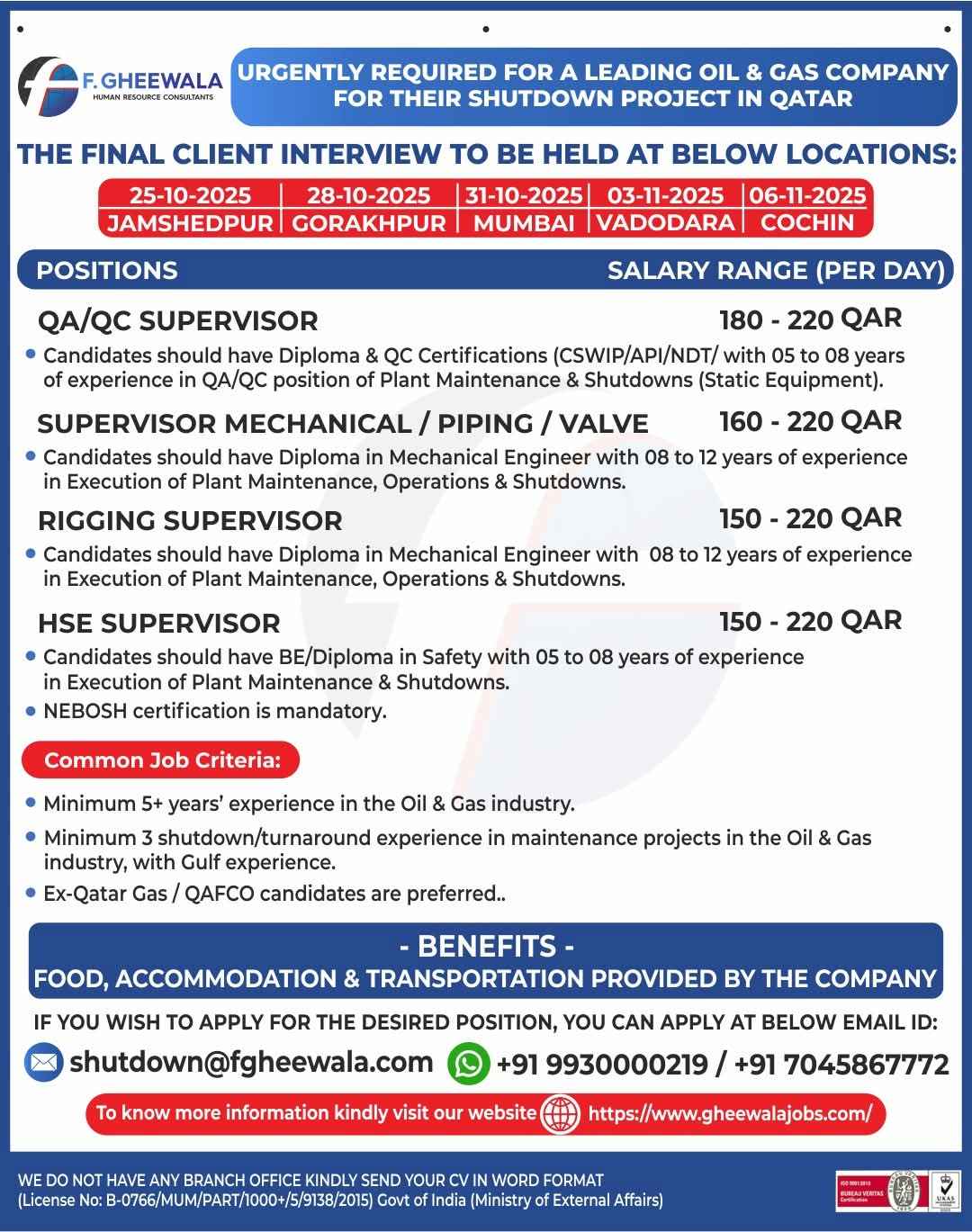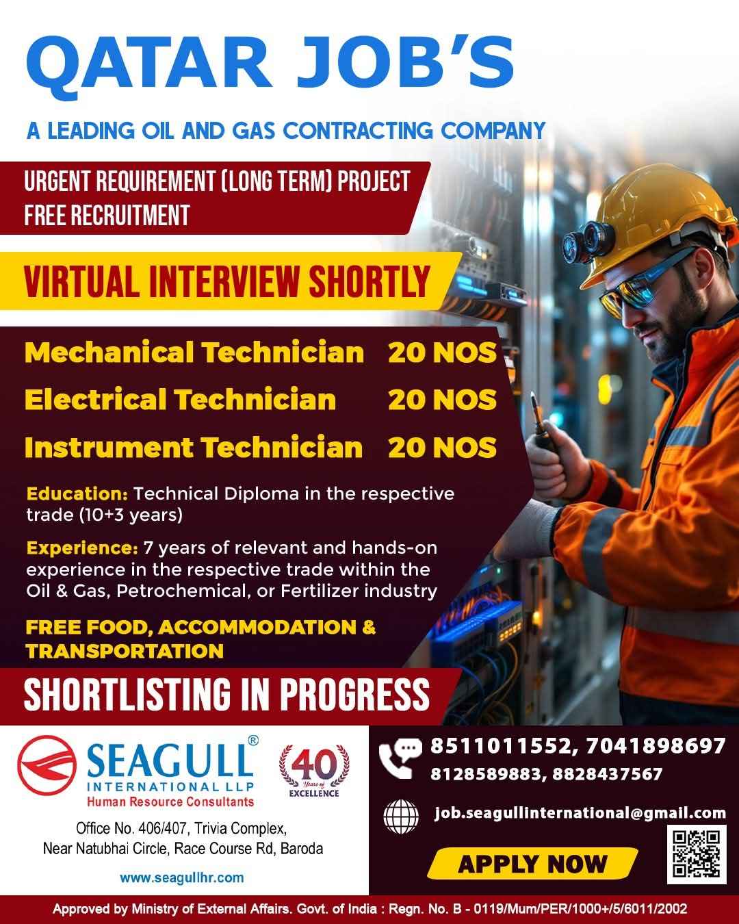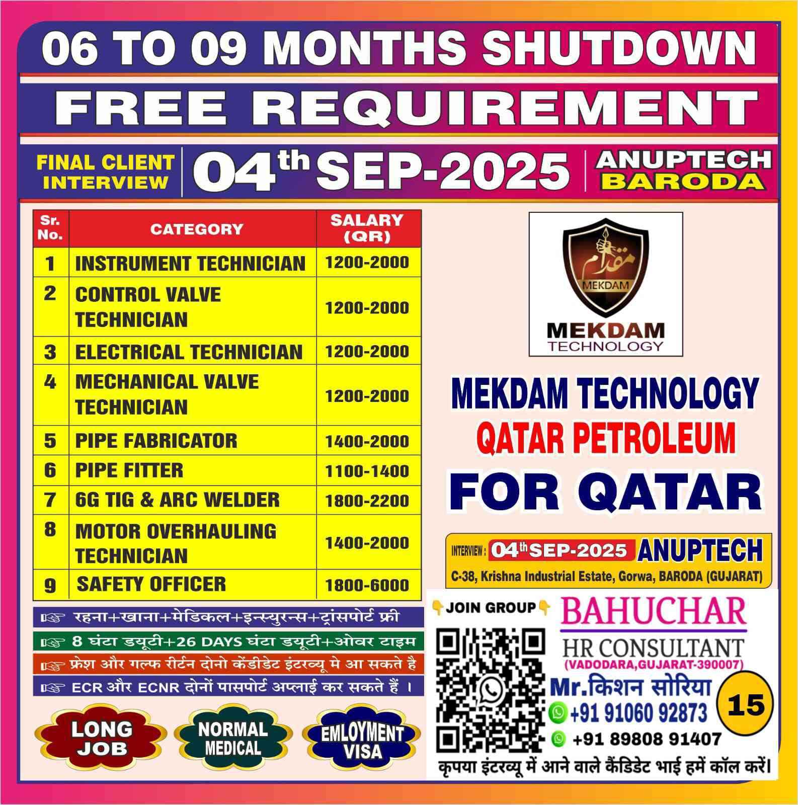 URGENTLY REQUIRED FOR A LEADING OIL & GAS COMPANY FOR QCHEM, RLOC & QAPCO (SHUTDOWN PROJECT) PROJECT IN QATAR