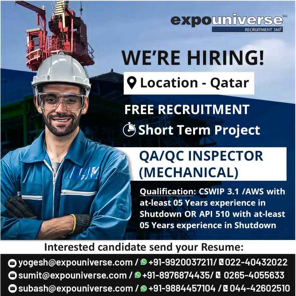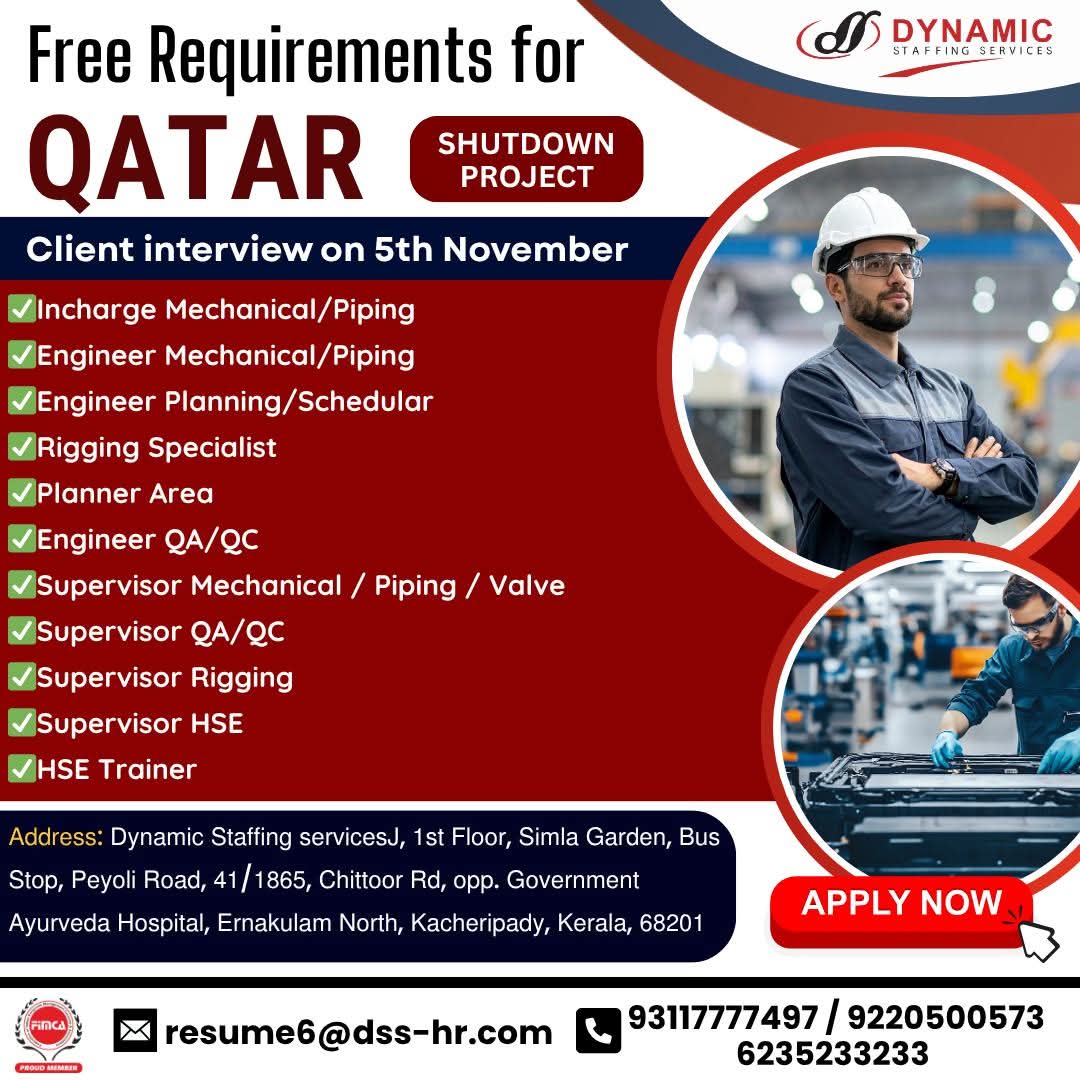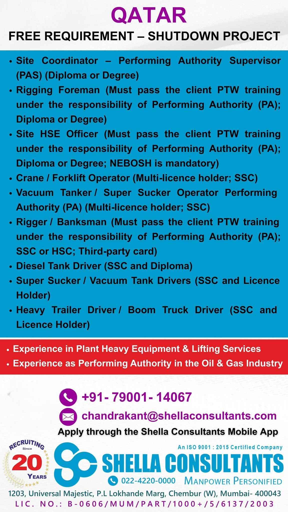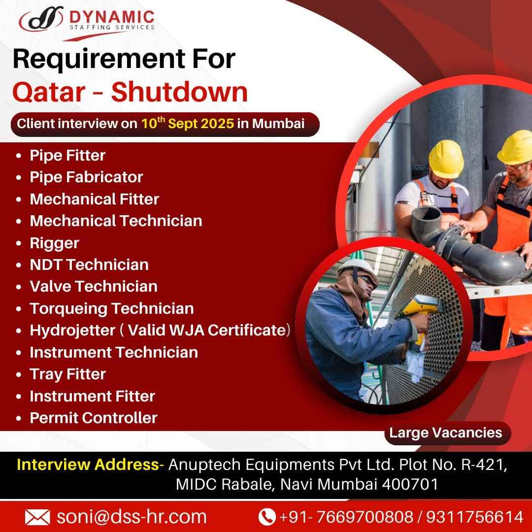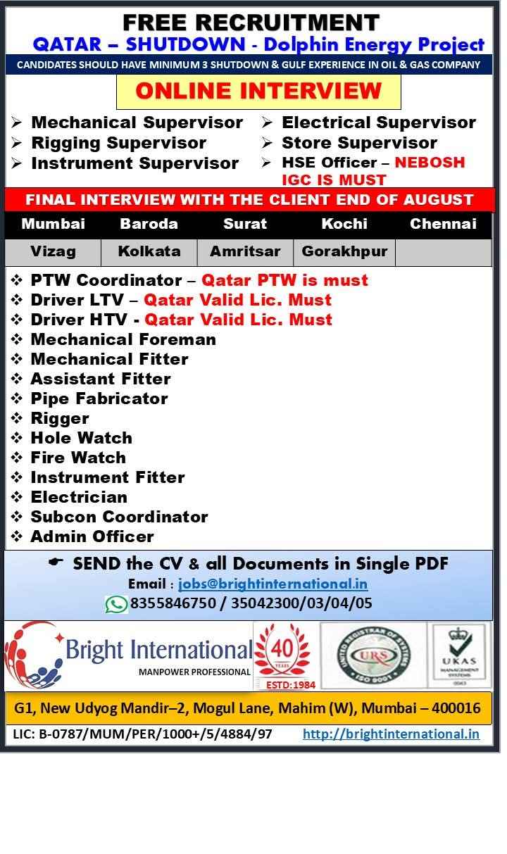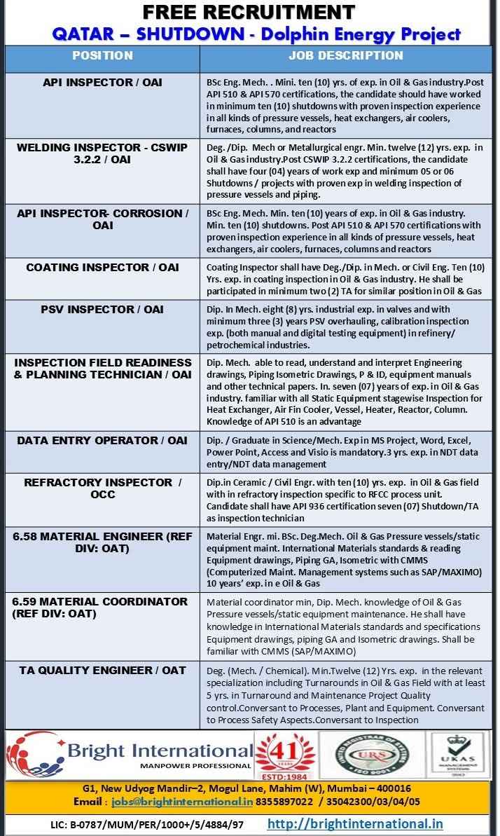 URGENTLY REQUIRED FOR A LEADING OIL & GAS COMPANY FOR THEIR SHUTDOWN PROJECT IN QATAR