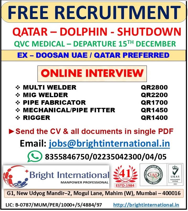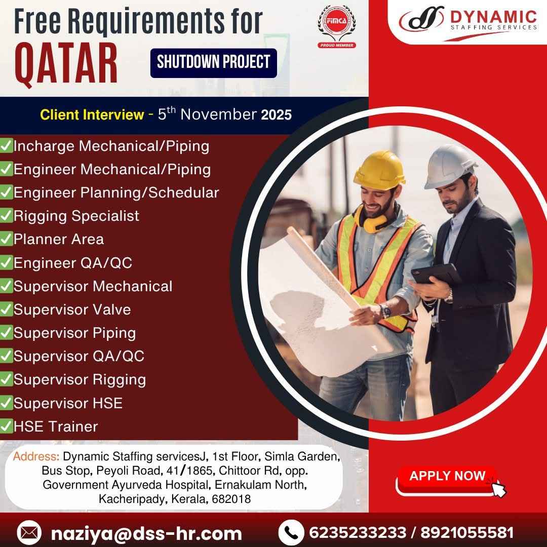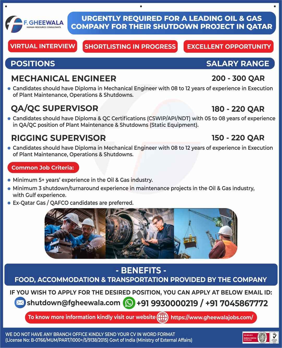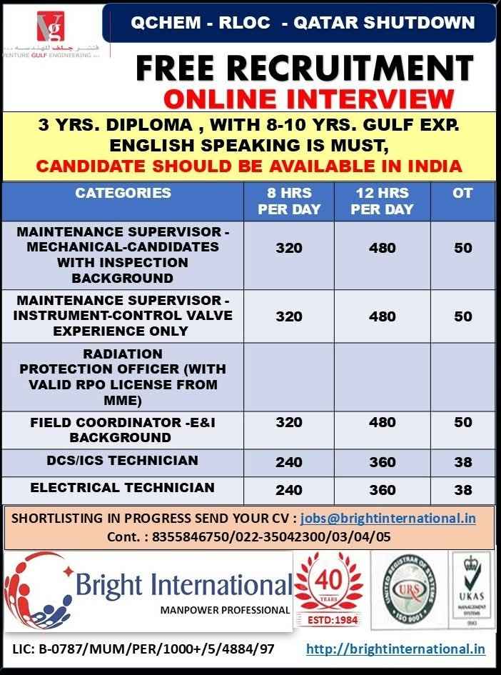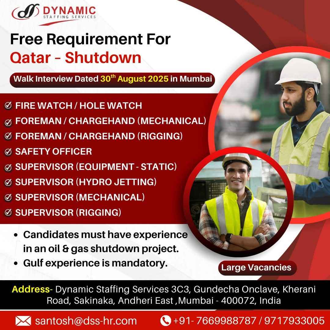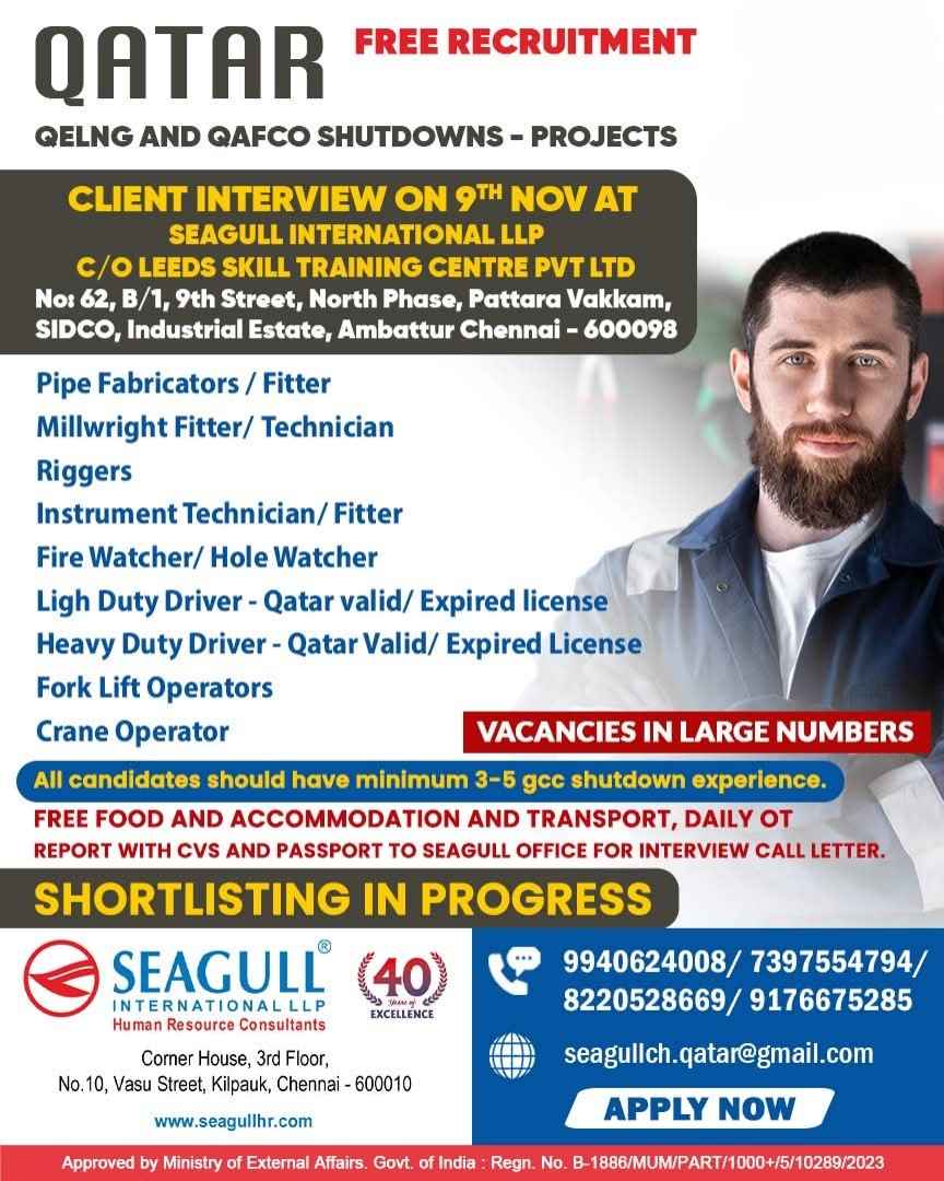 URGENTLY REQUIRED FOR A LEADING OIL & GAS COMPANY FOR THEIR SHUTDOWN PROJECT IN QATAR