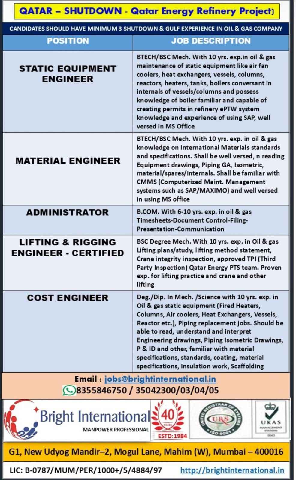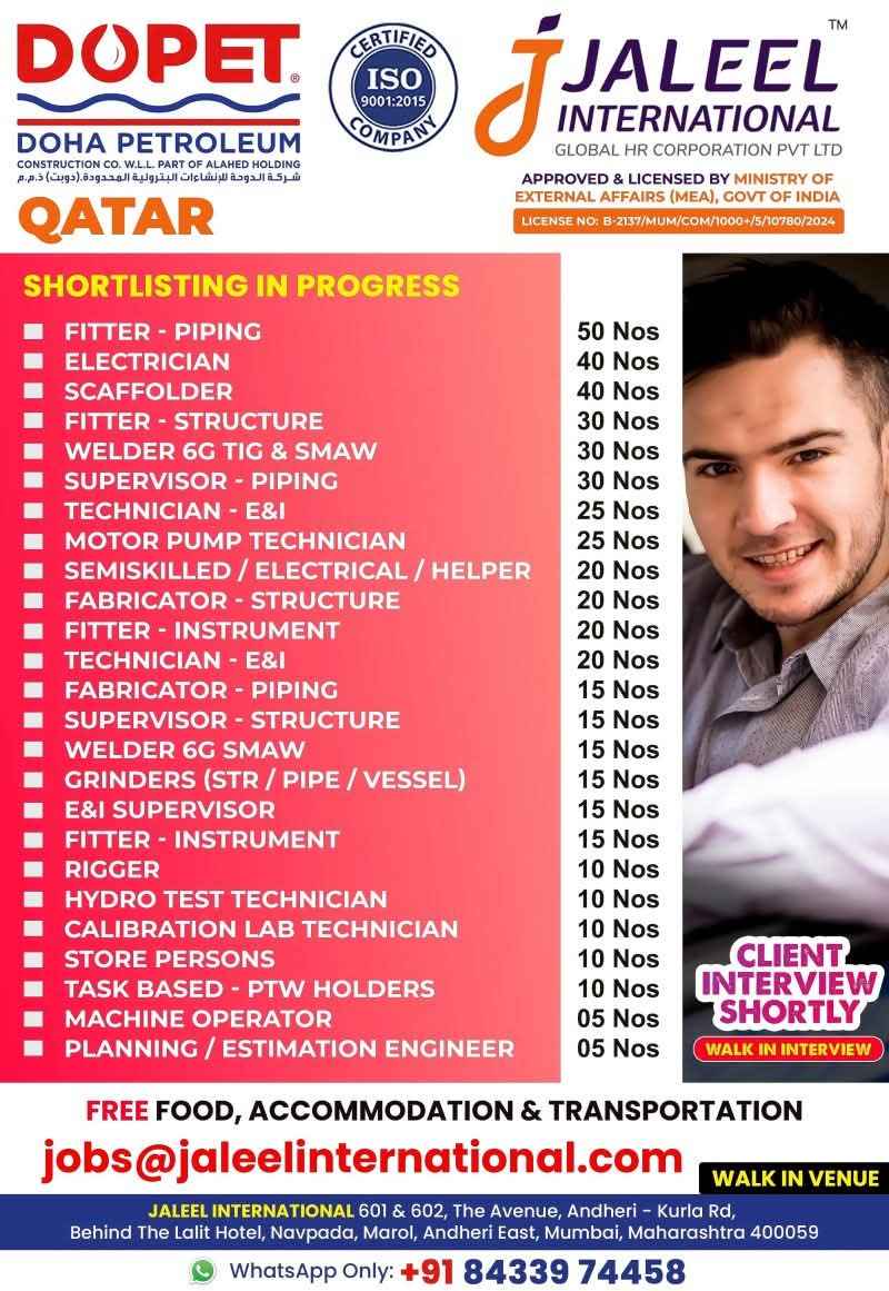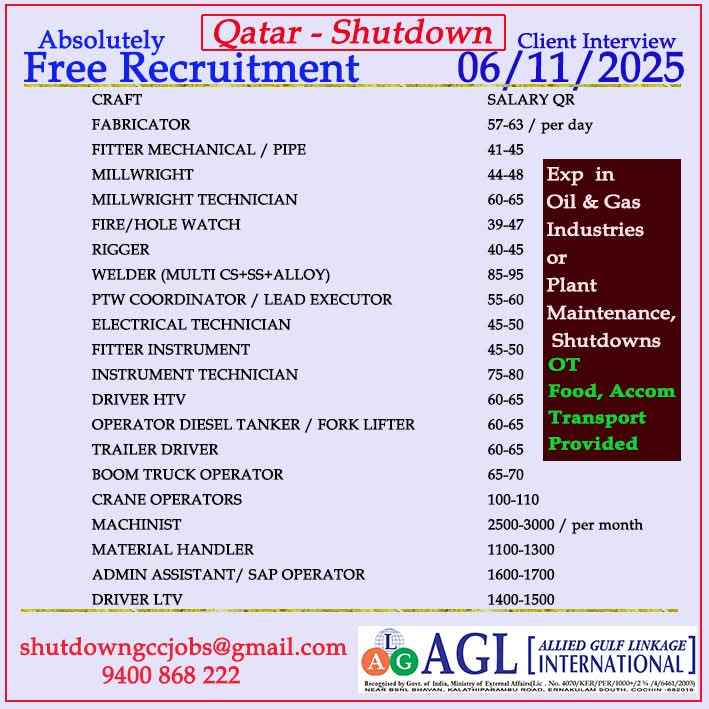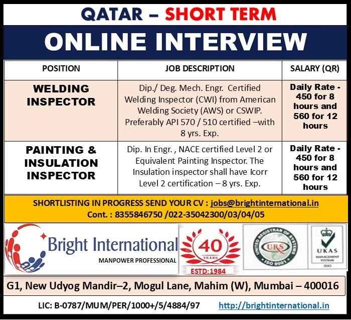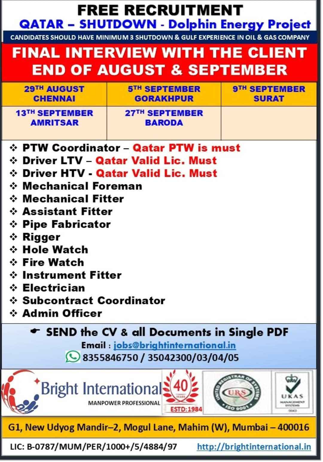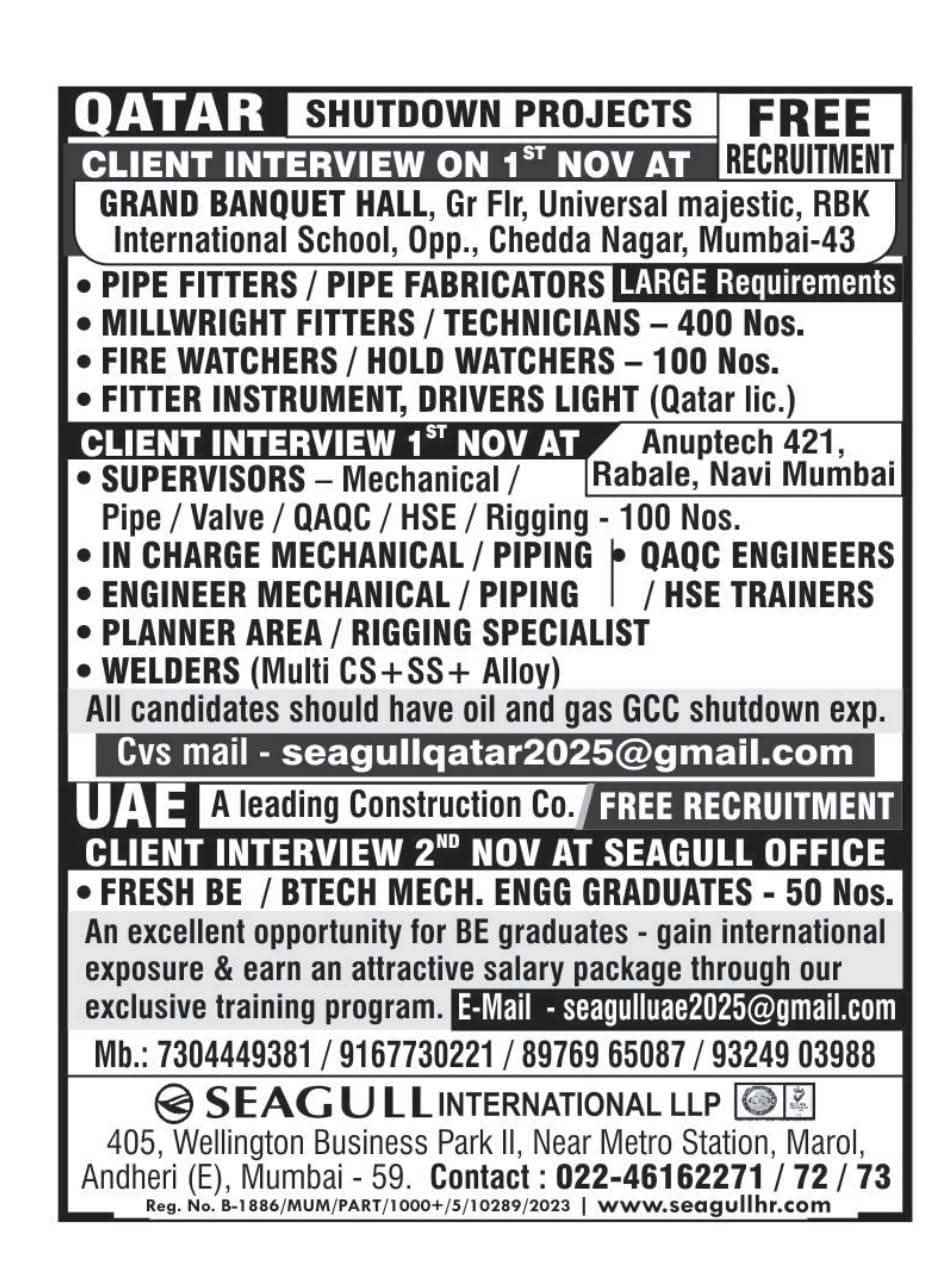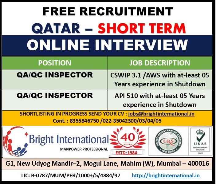 URGENTLY REQUIRED FOR A LEADING OIL & GAS COMPANY FOR THEIR SHUTDOWN PROJECT IN QATAR