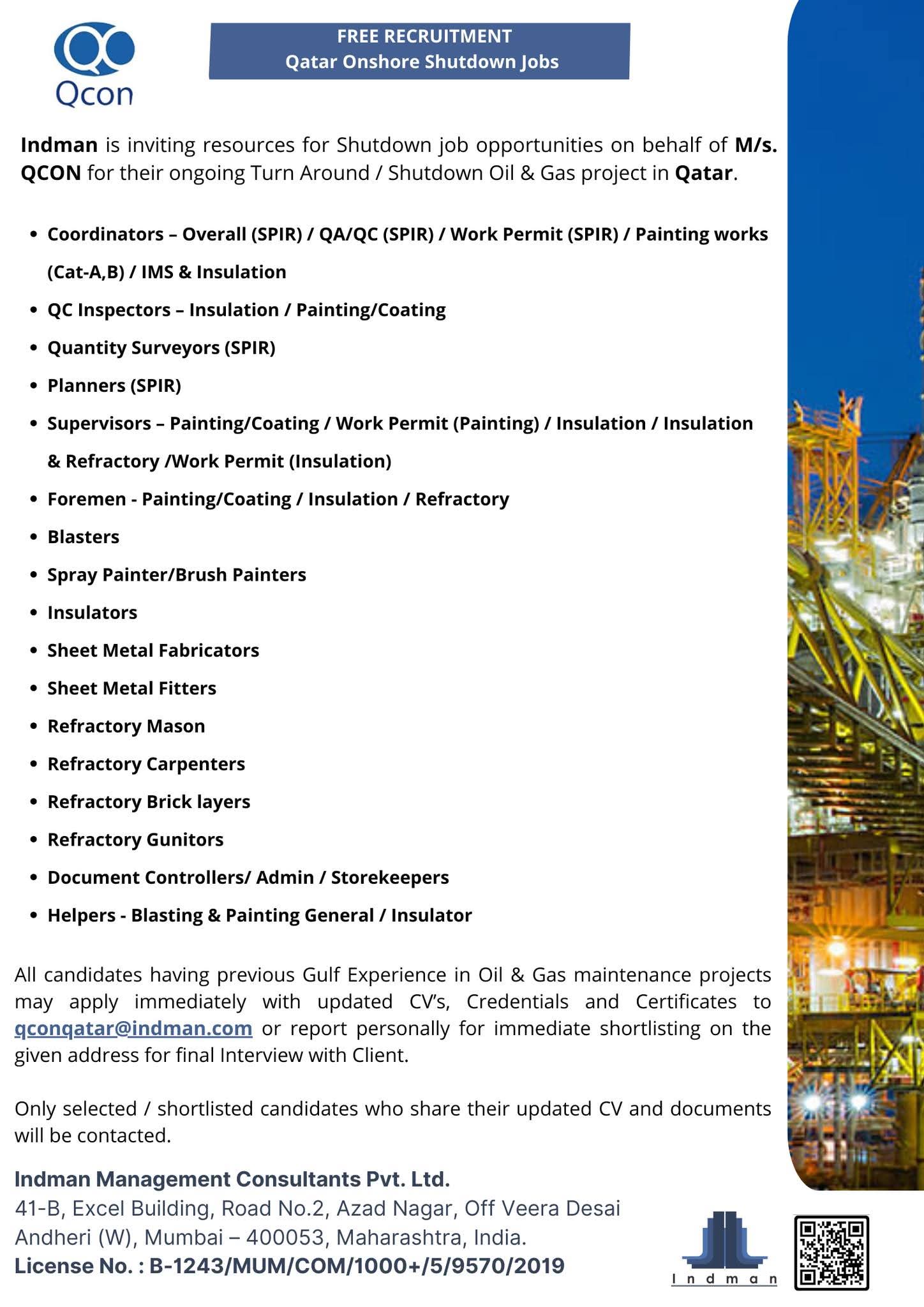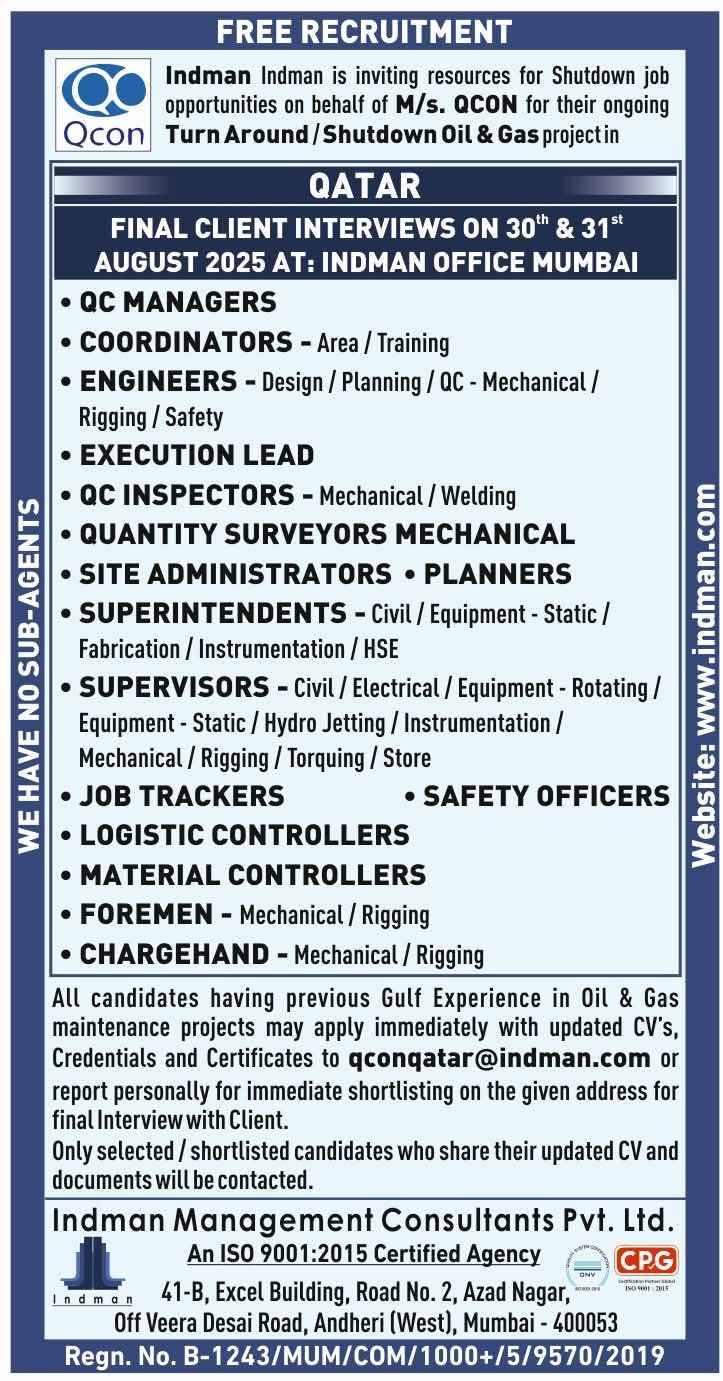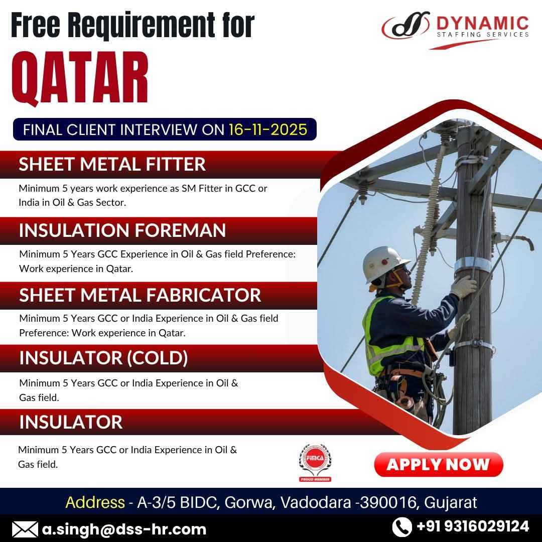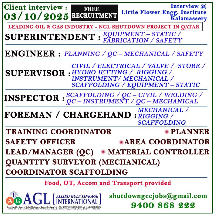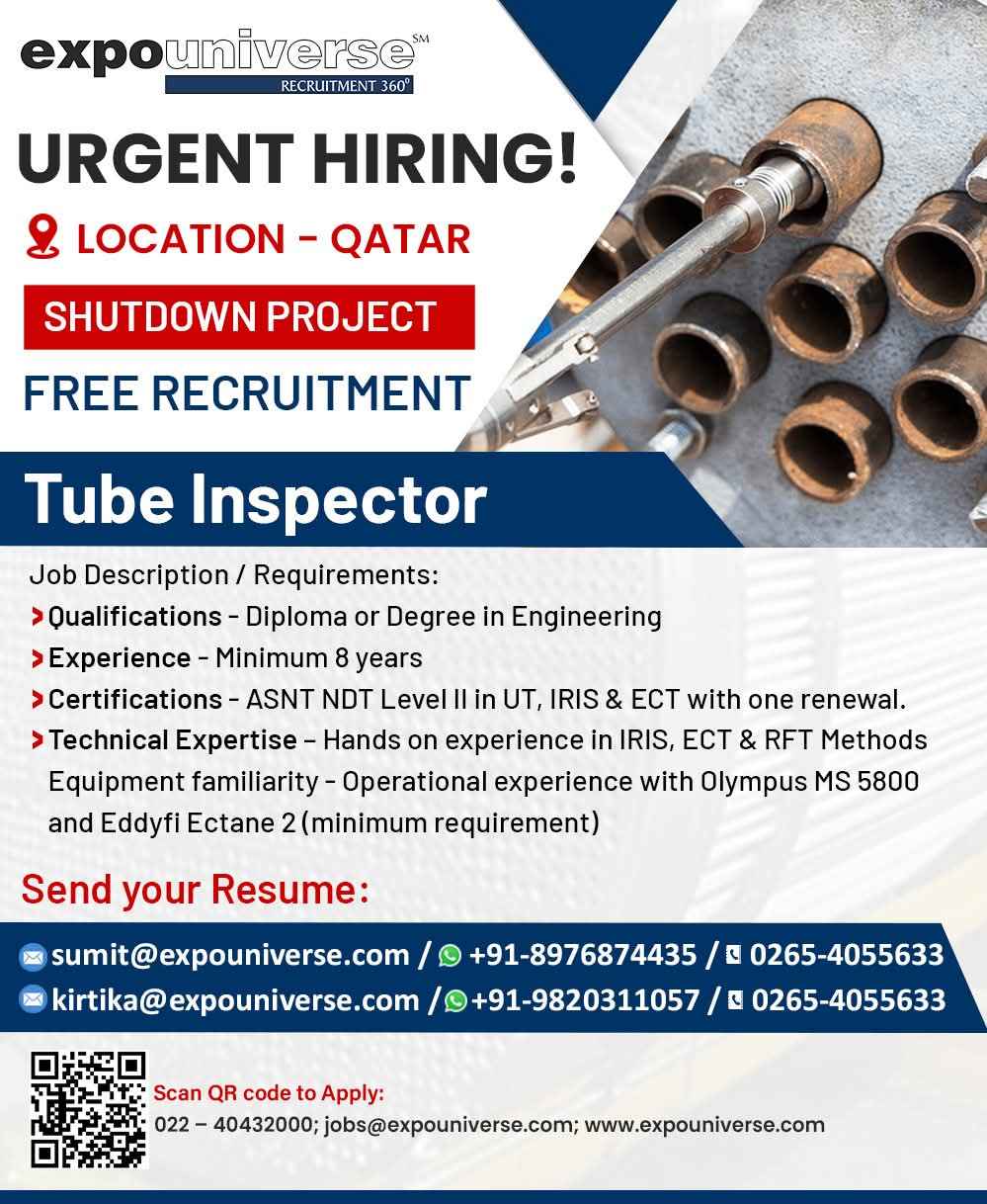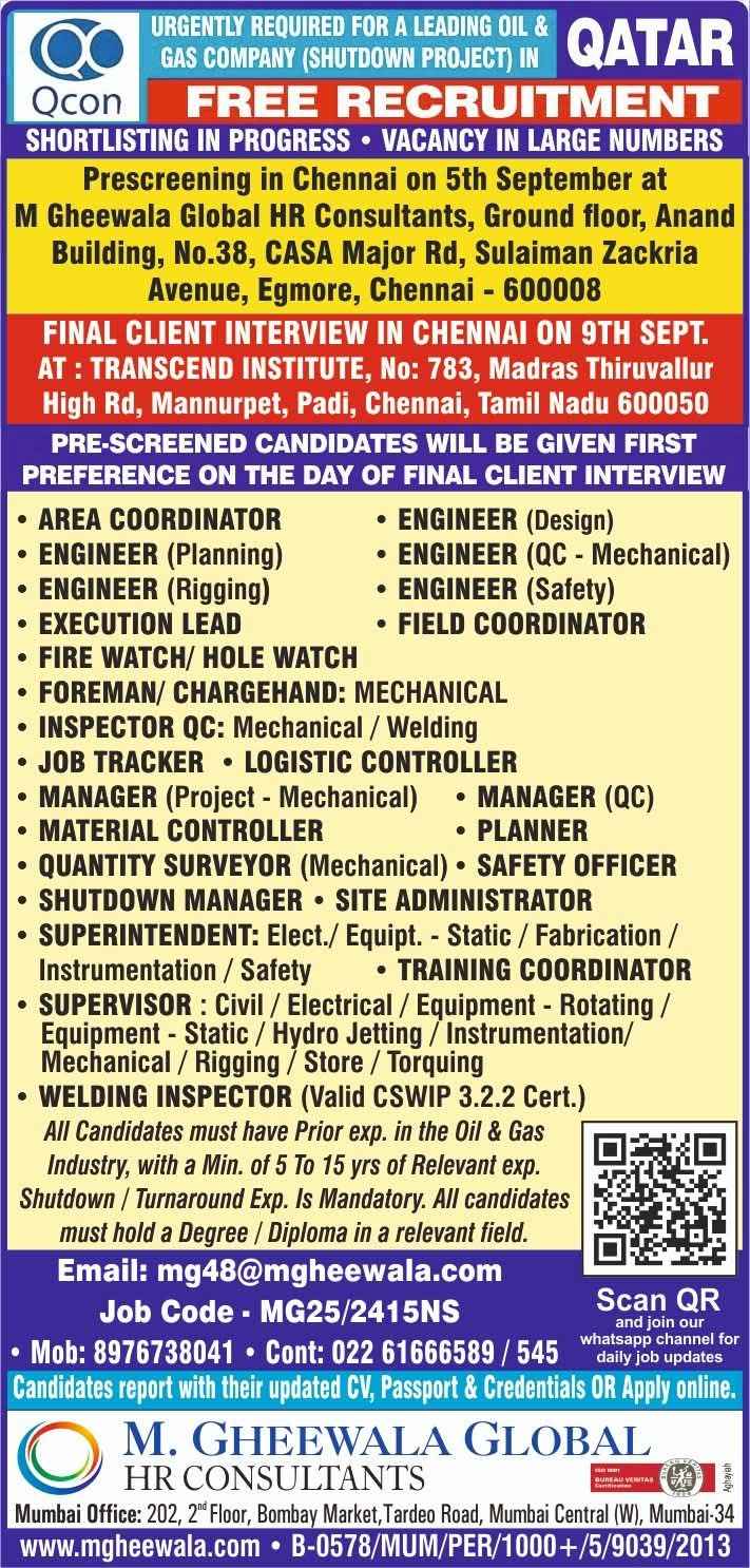 URGENTLY REQUIRED FOR A LEADING OIL & GAS COMPANY FOR THEIR SHUTDOWN PROJECT IN QATAR