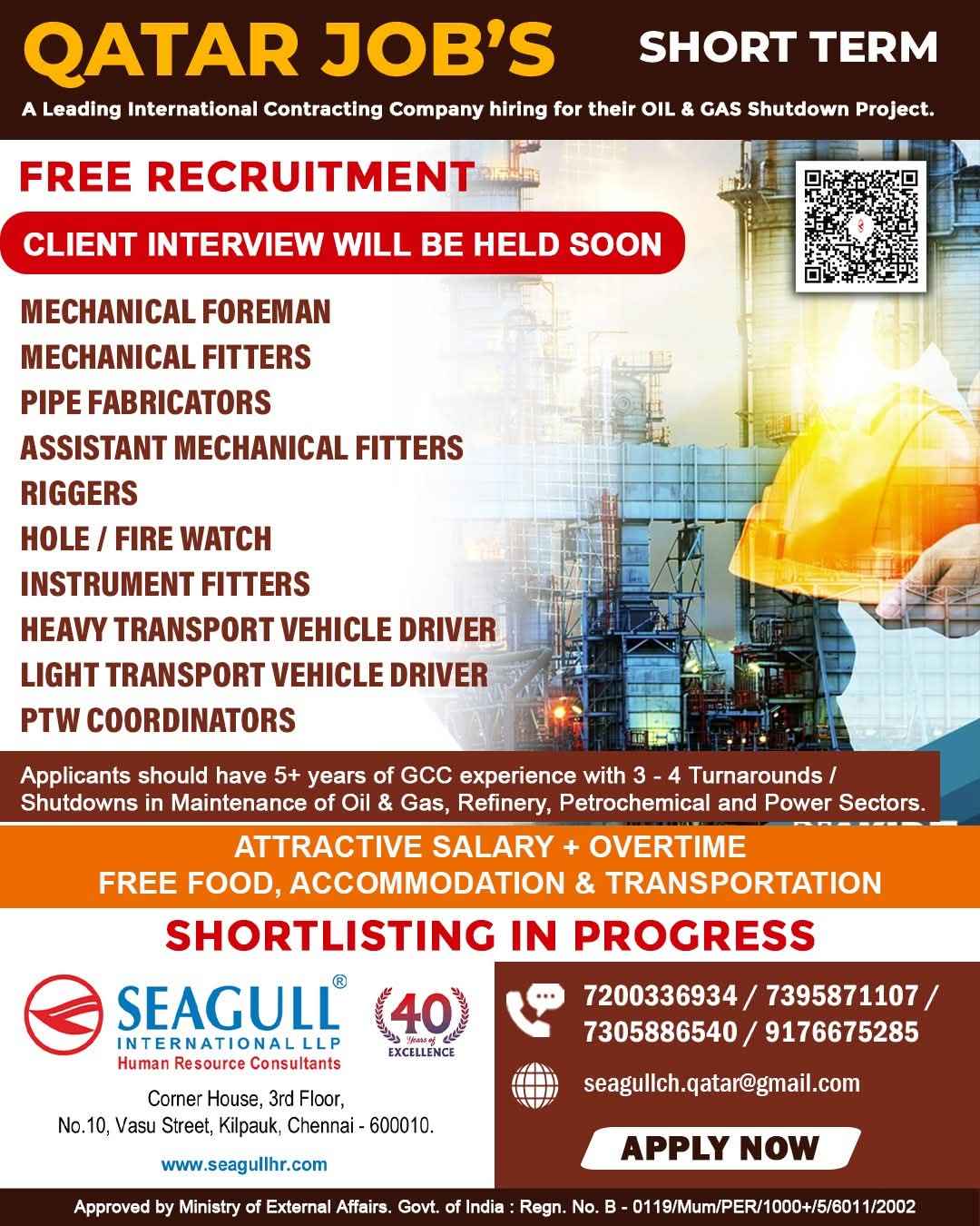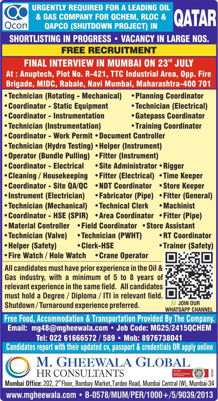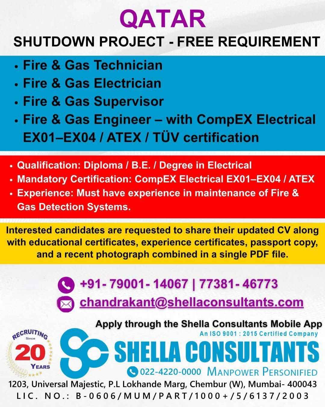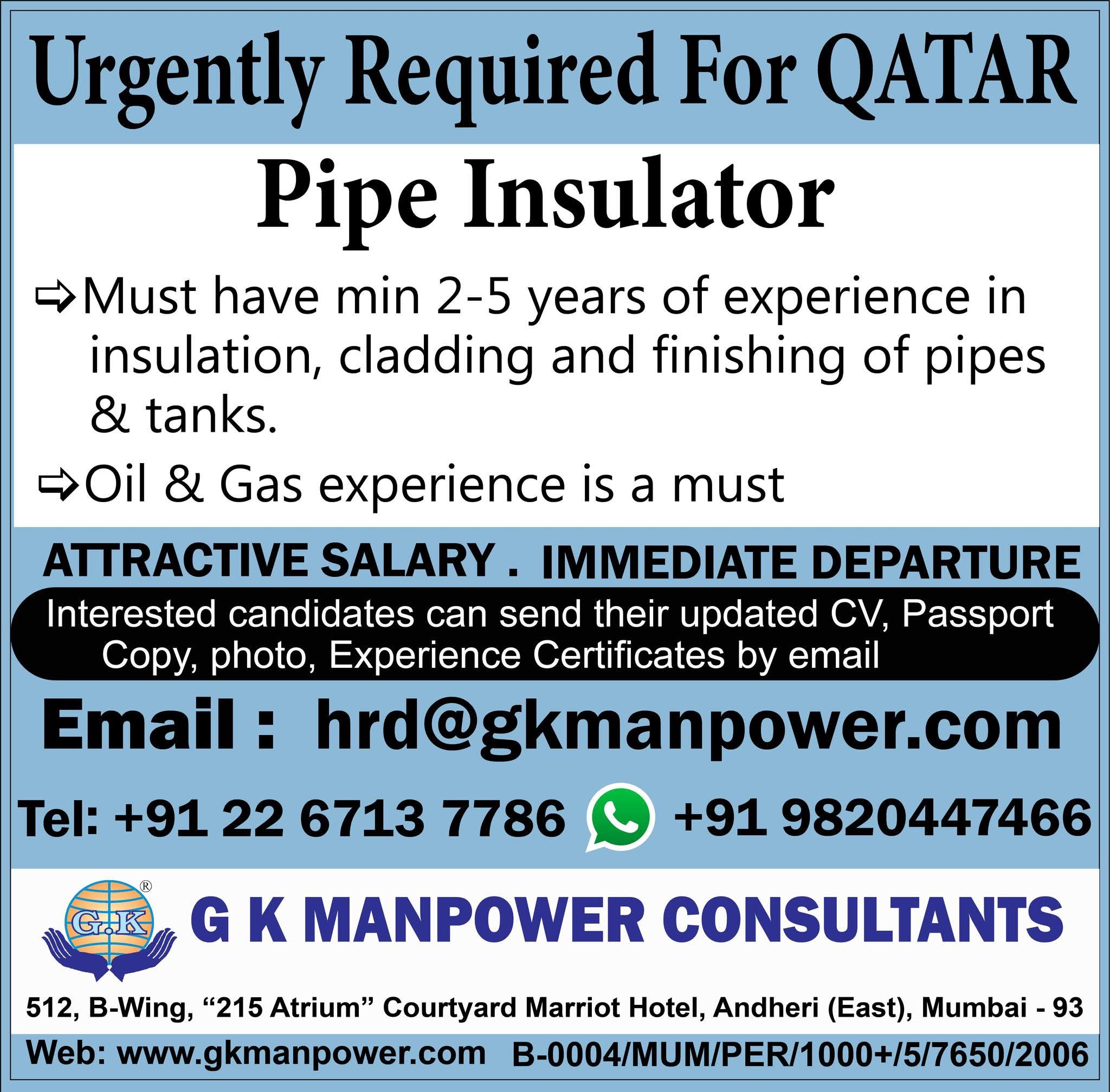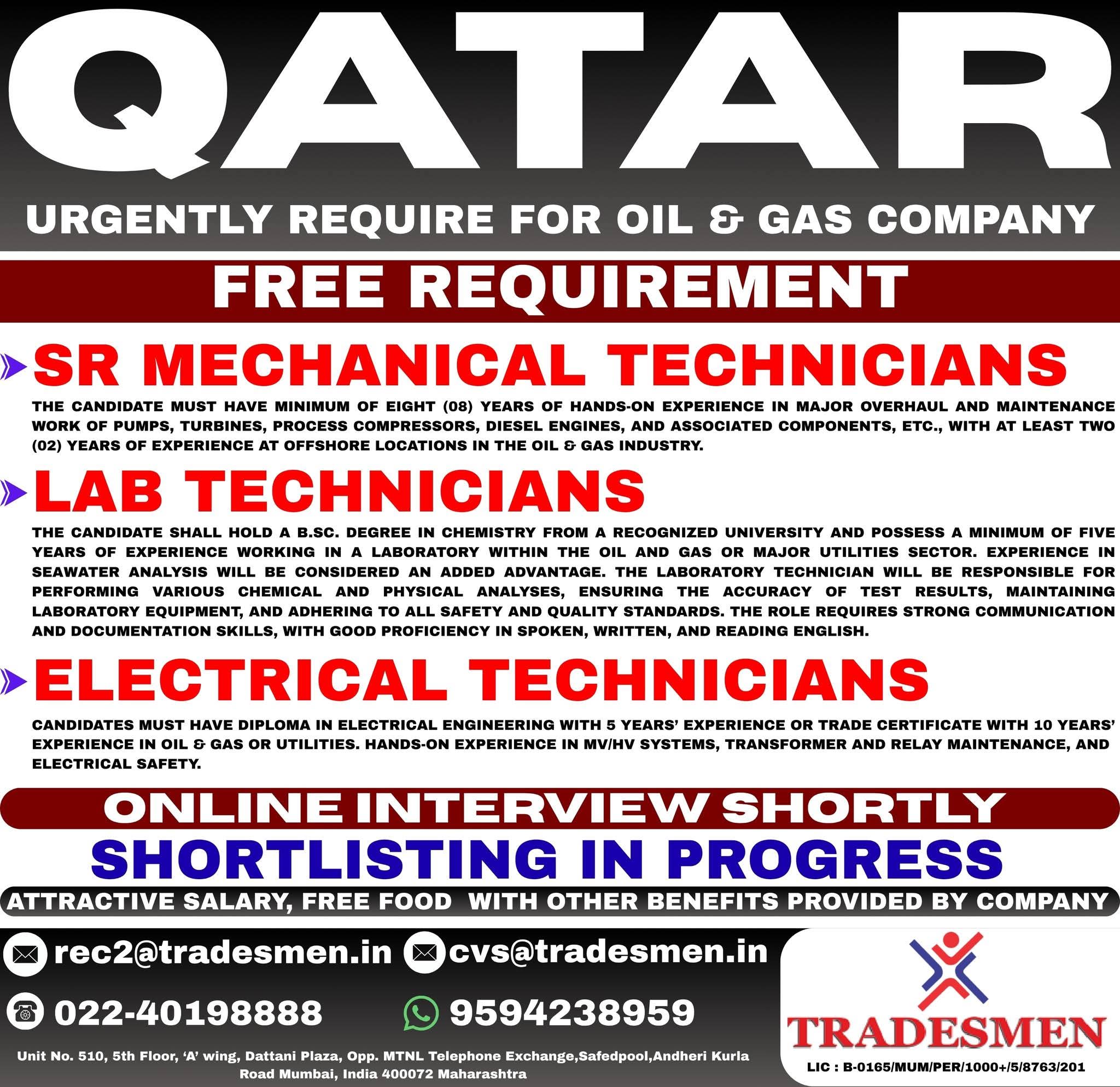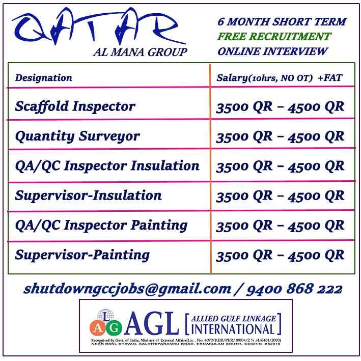 URGENTLY REQUIRED FOR A LEADING OIL & GAS COMPANY FOR THEIR SHUTDOWN PROJECT IN QATAR