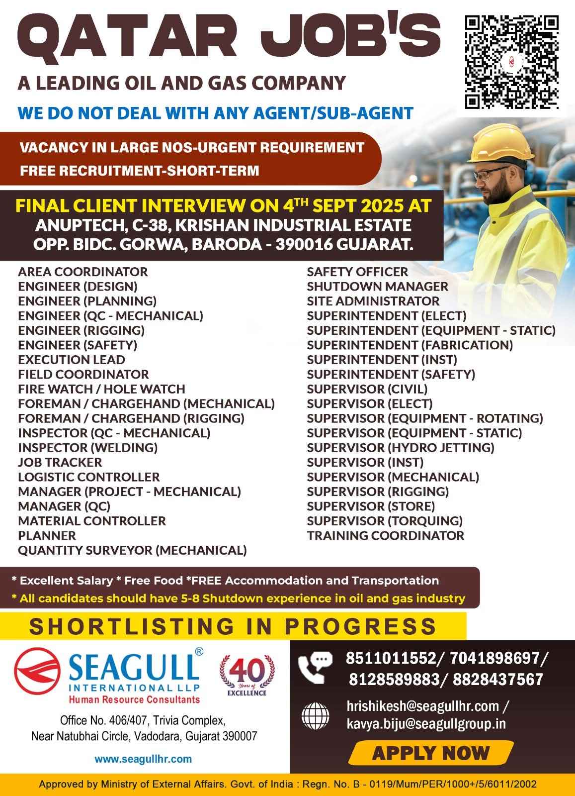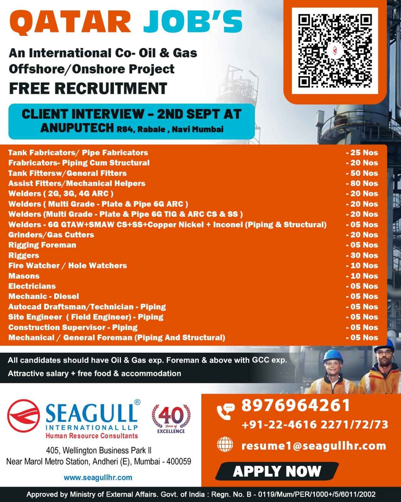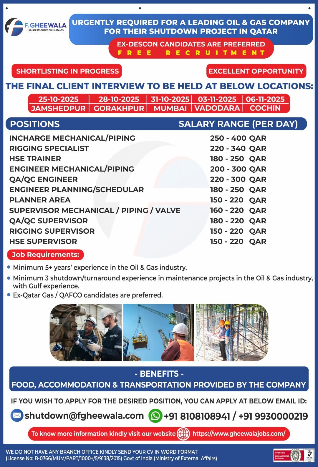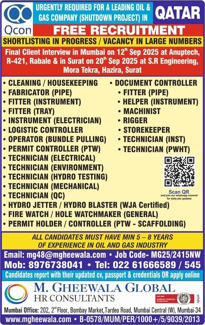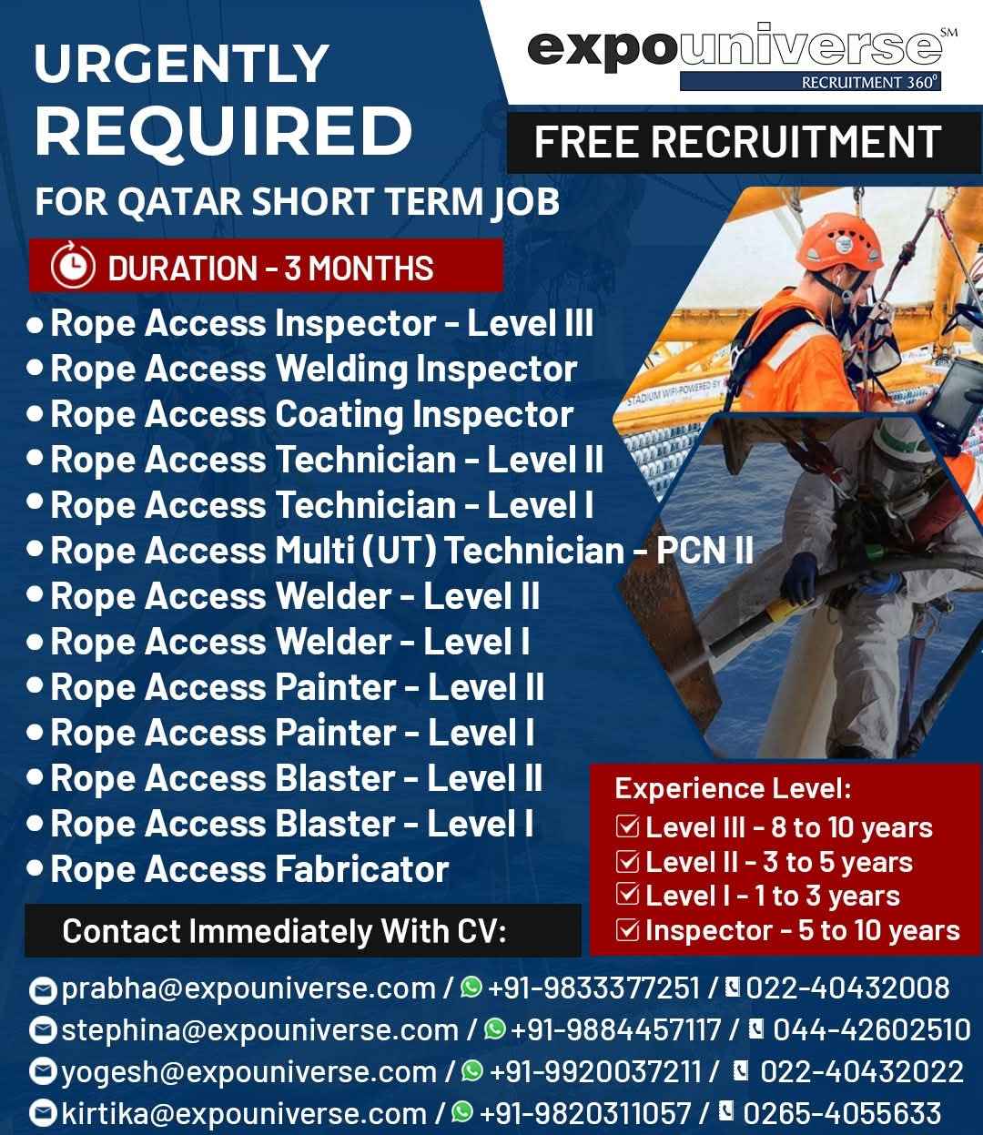 URGENTLY REQUIRED FOR A LEADING OIL & GAS COMPANY FOR THEIR SHUTDOWN PROJECT IN QATAR