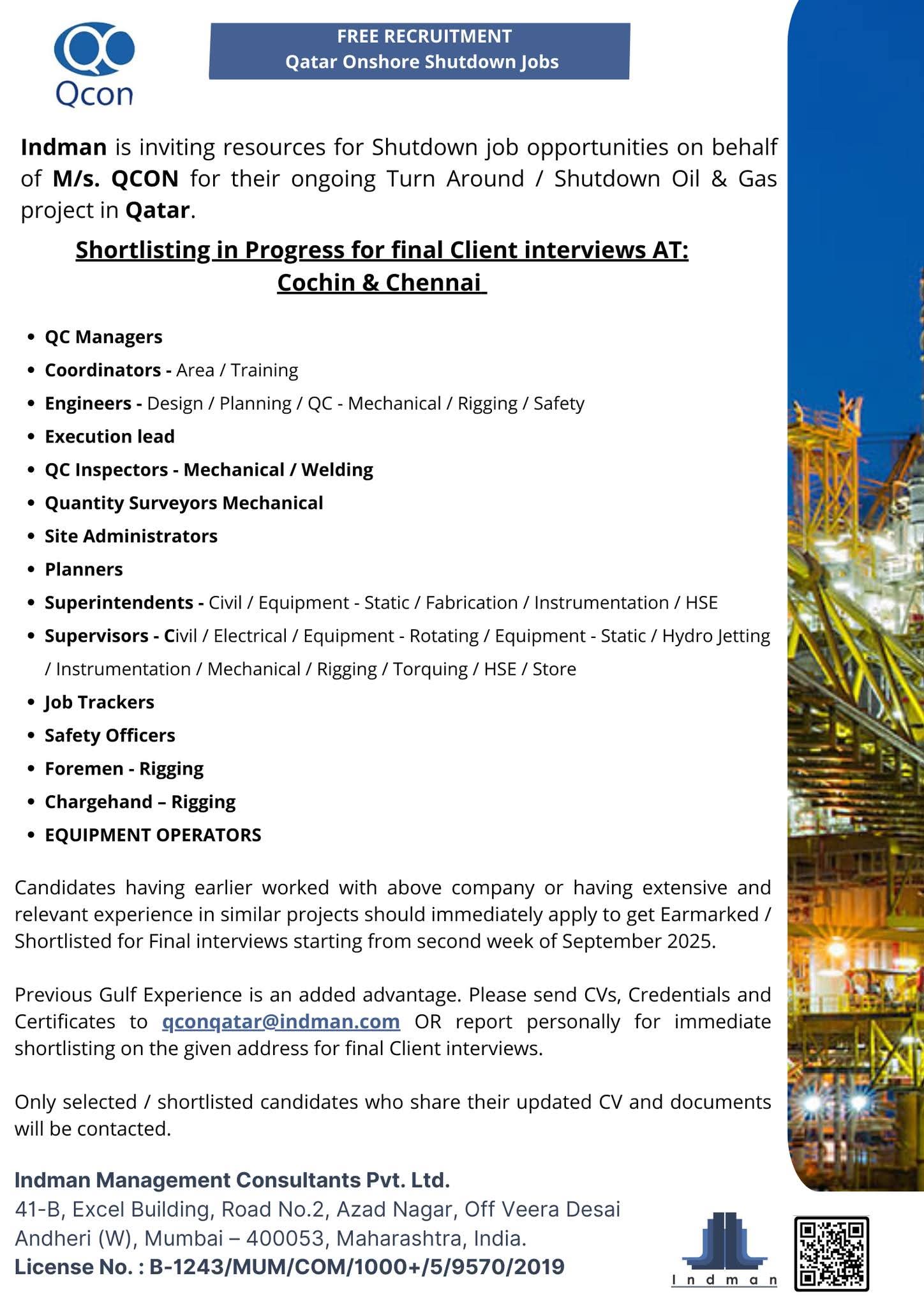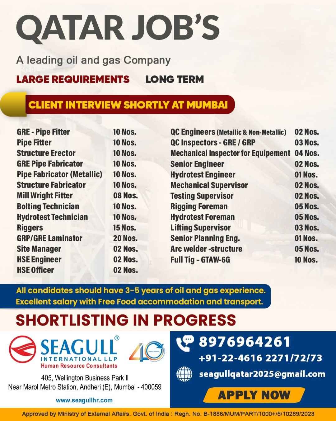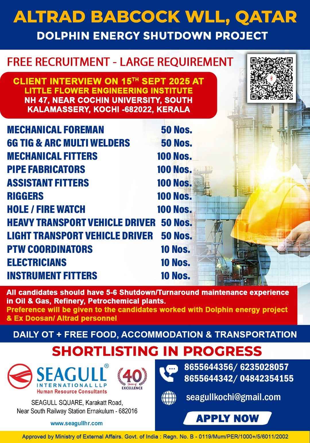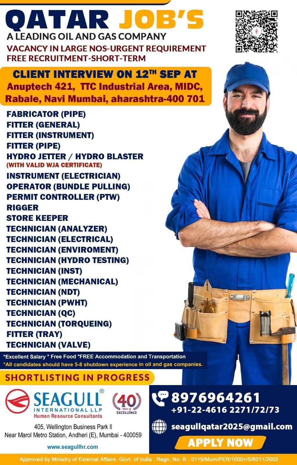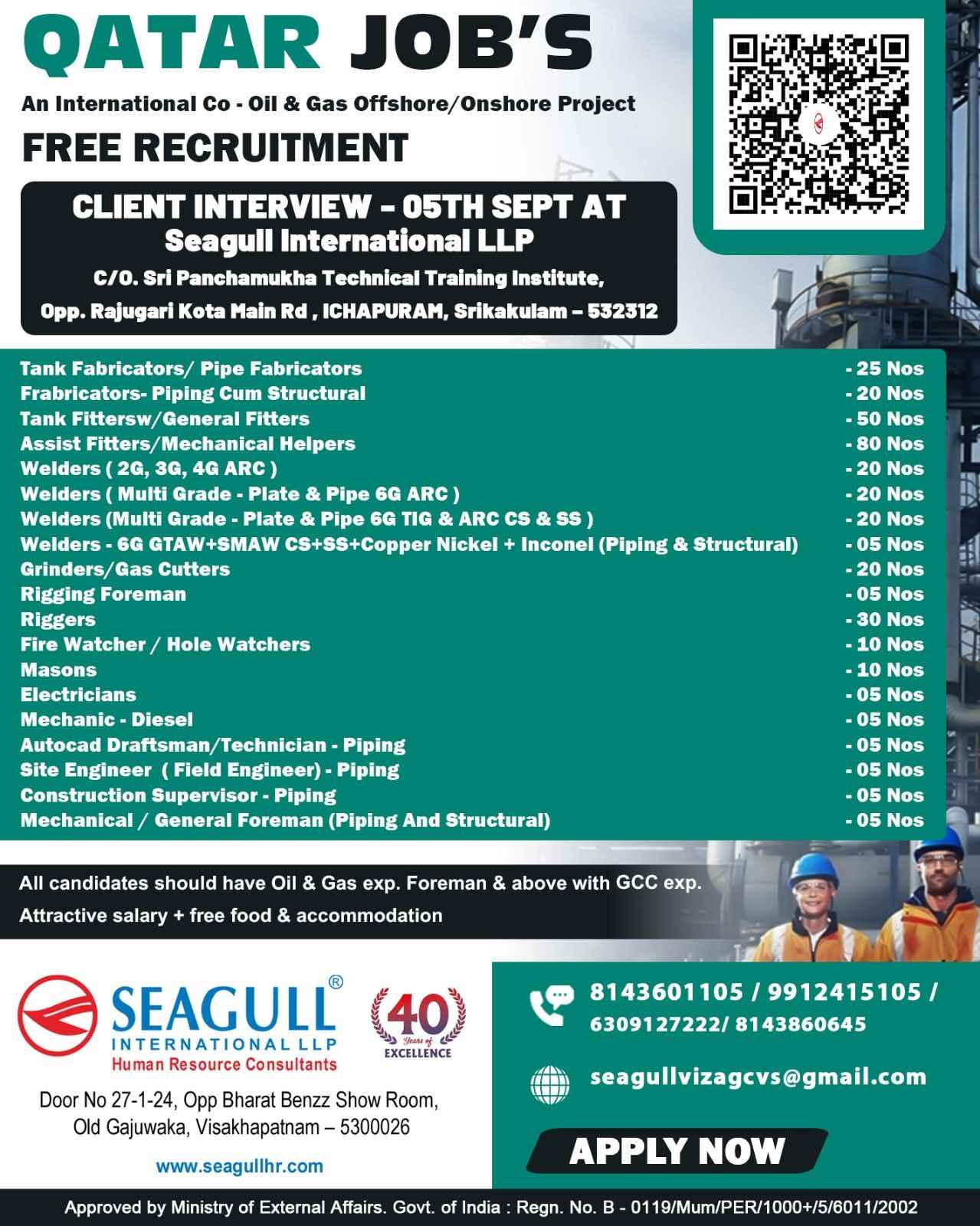 URGENTLY REQUIRED FOR A LEADING OIL & GAS COMPANY FOR THEIR SHUTDOWN PROJECT IN QATAR