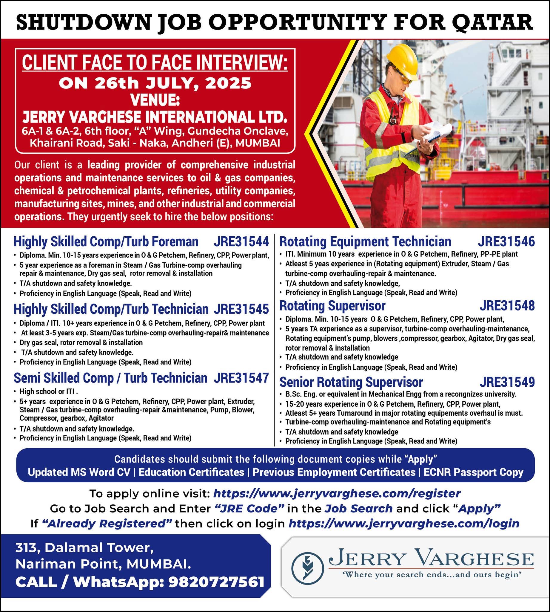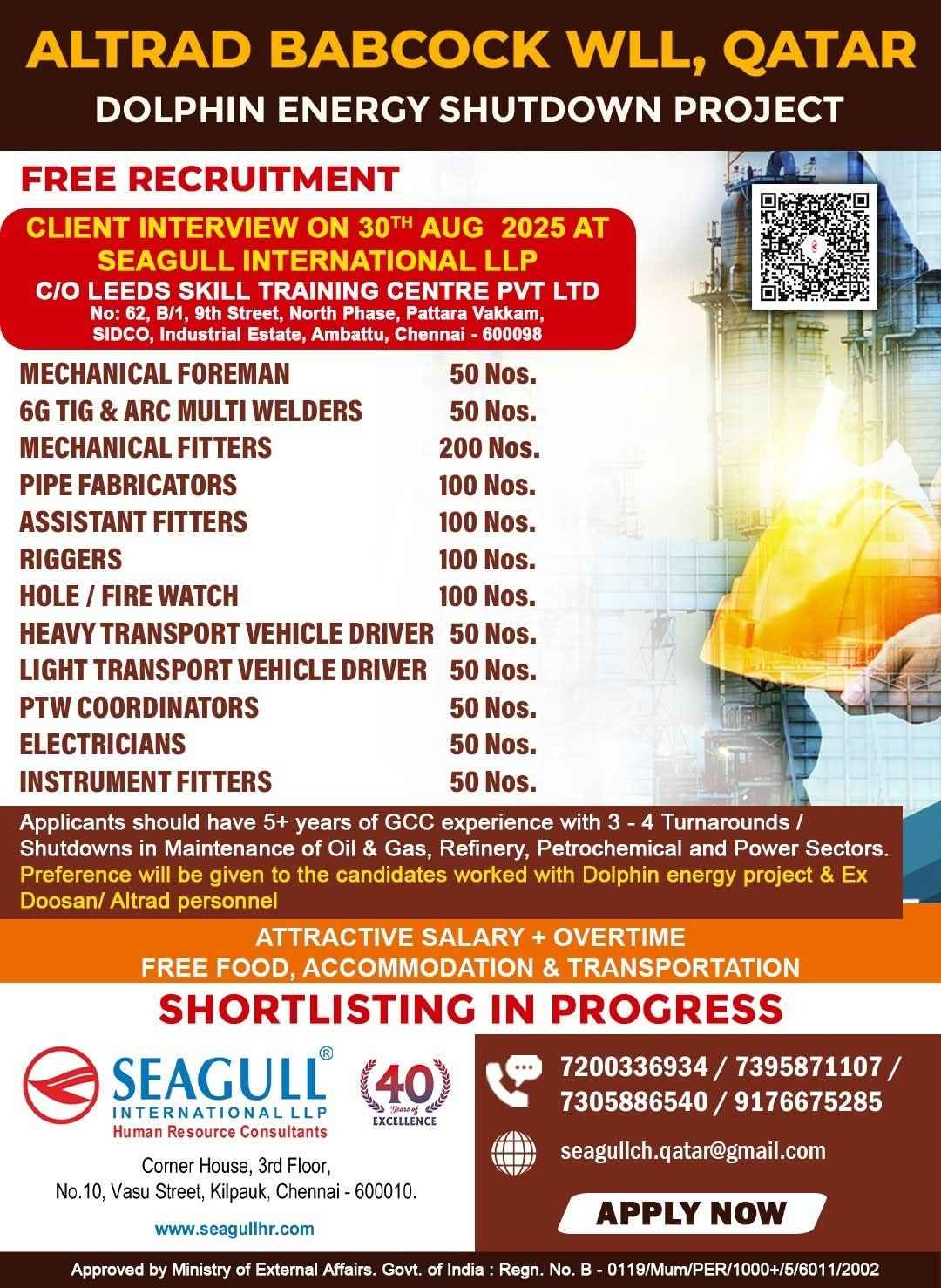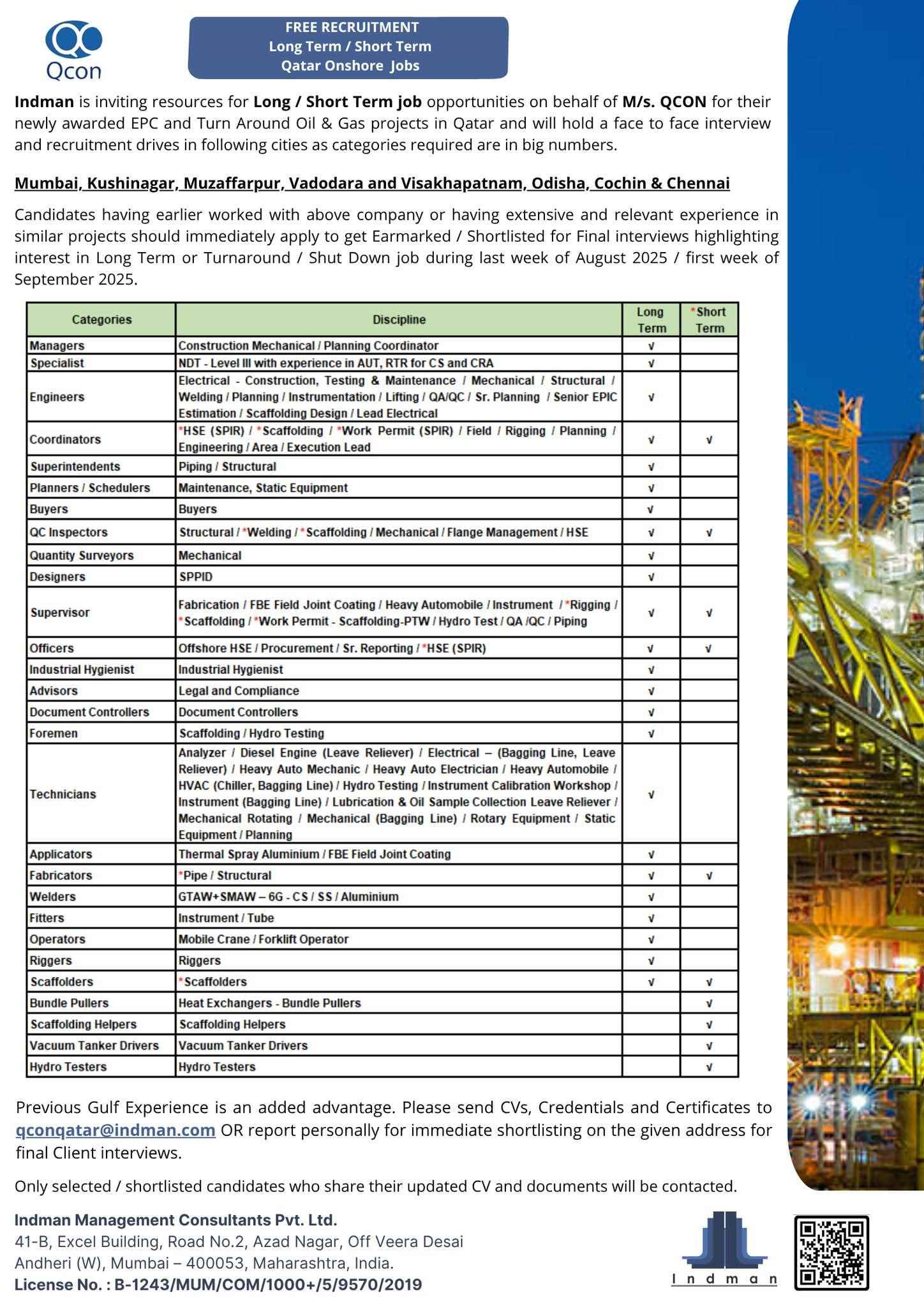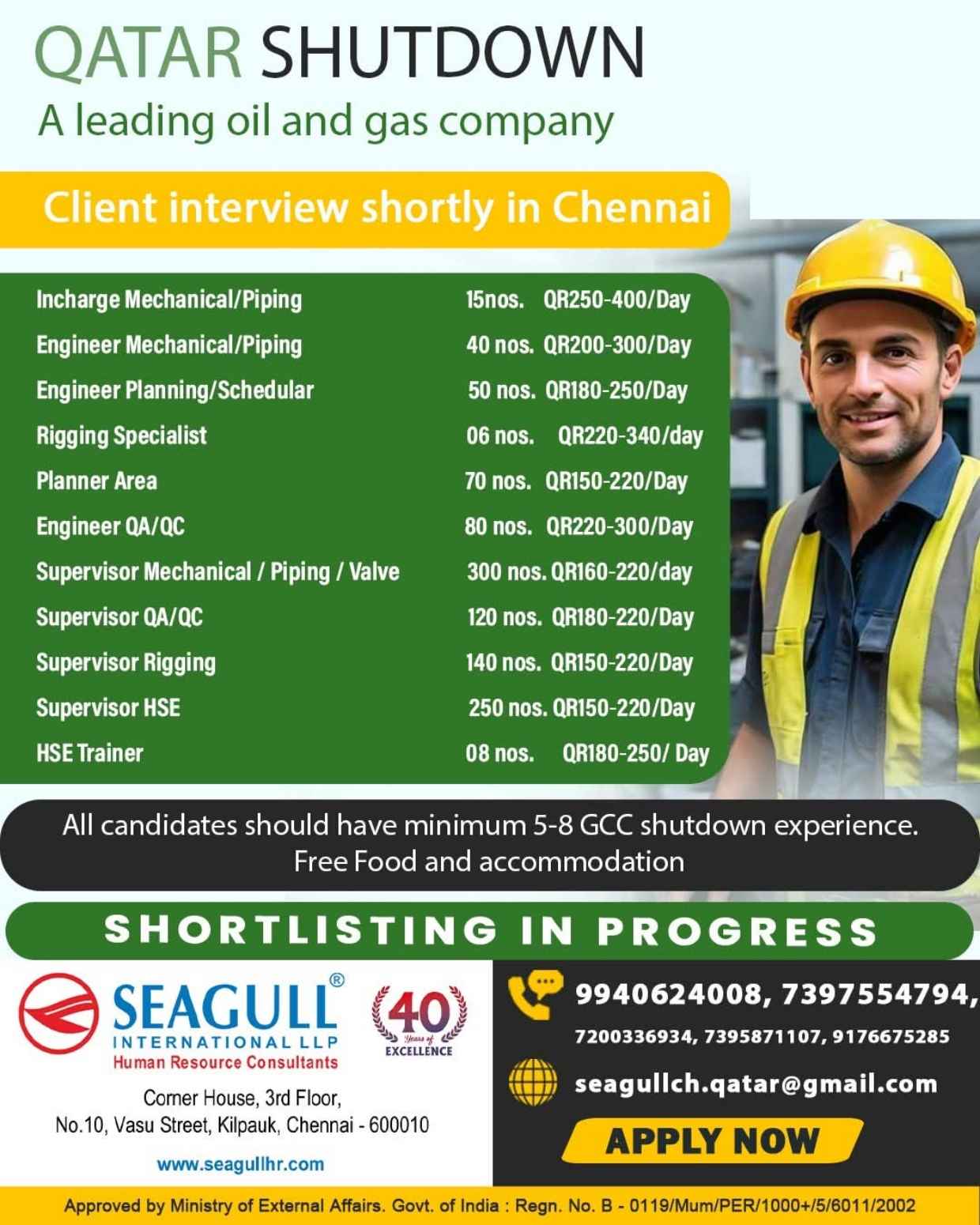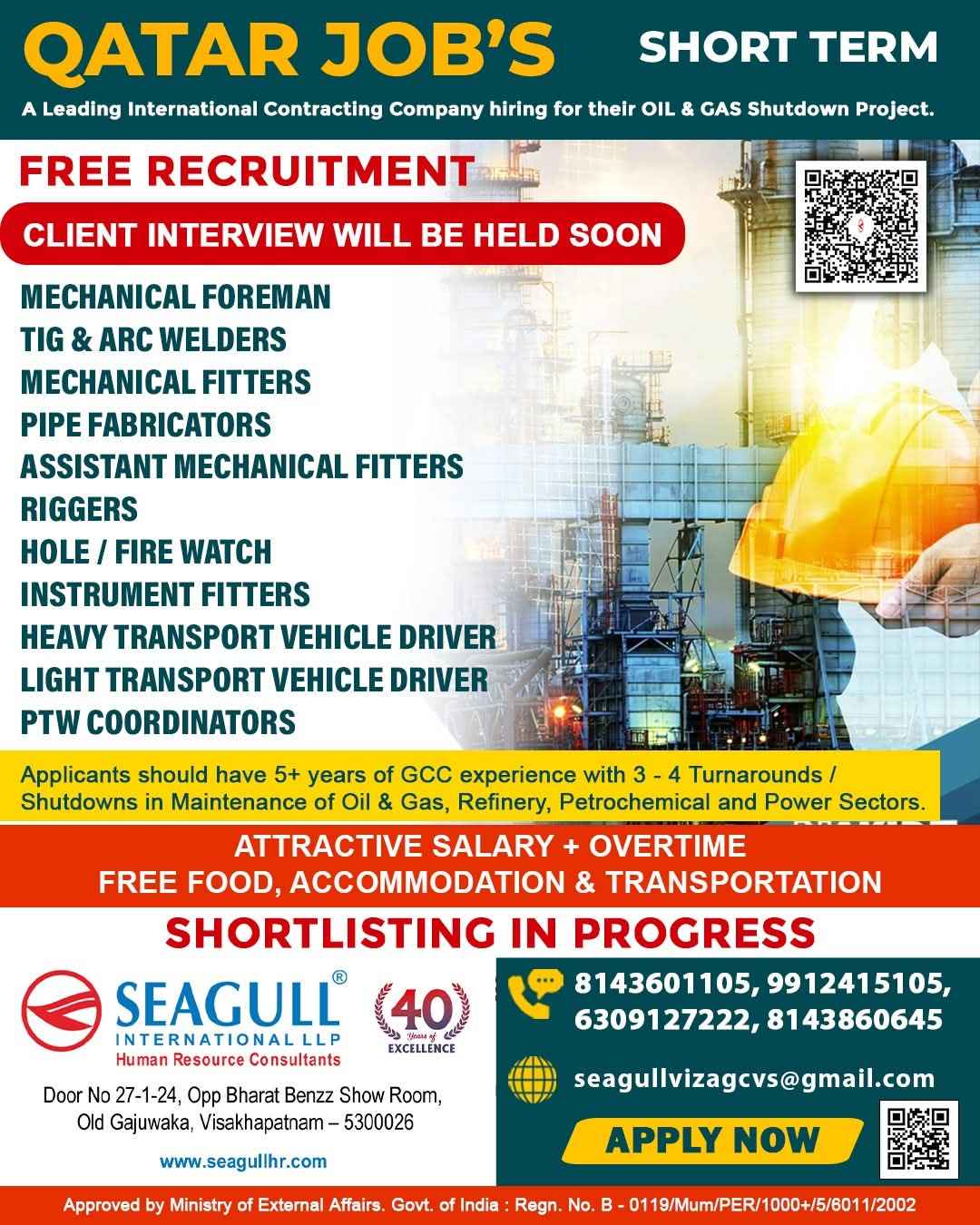 URGENTLY REQUIRED FOR A LEADING OIL & GAS COMPANY FOR THEIR SHUTDOWN PROJECT IN QATAR