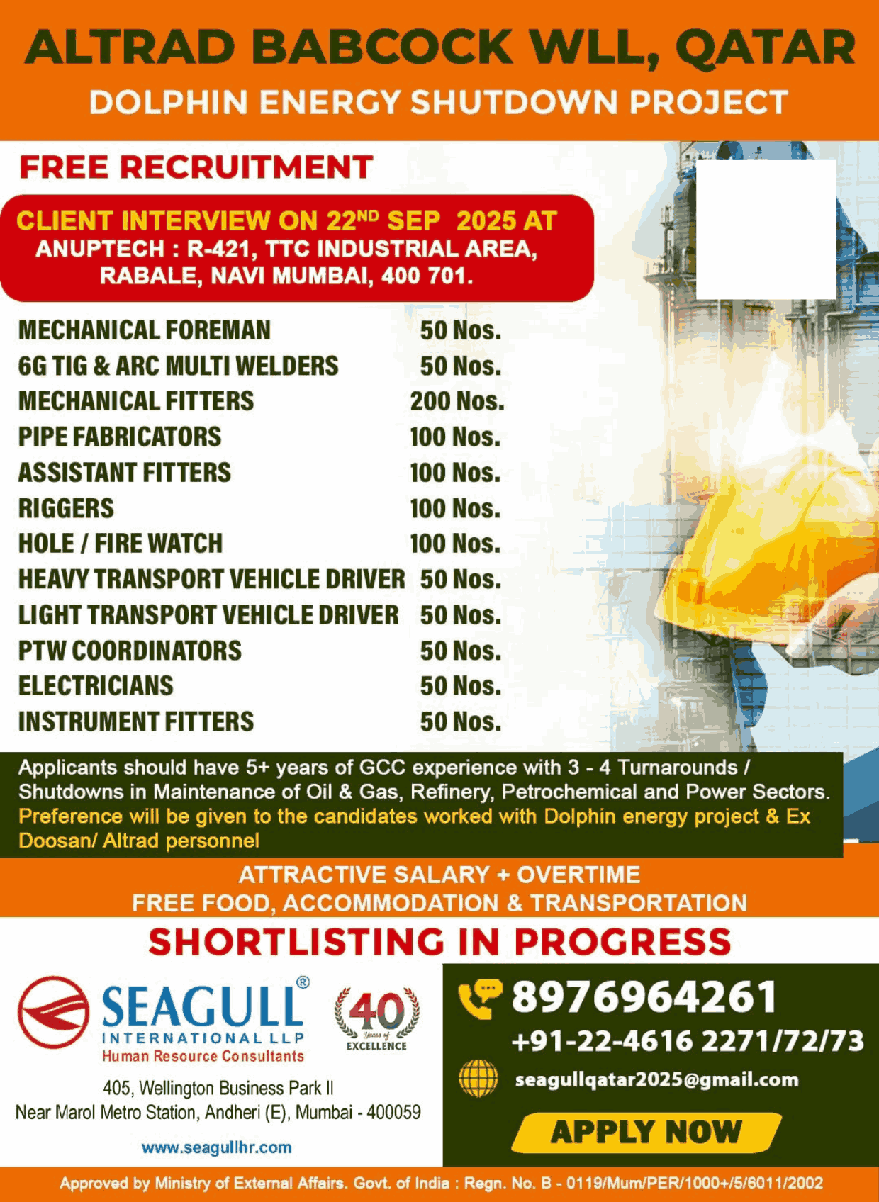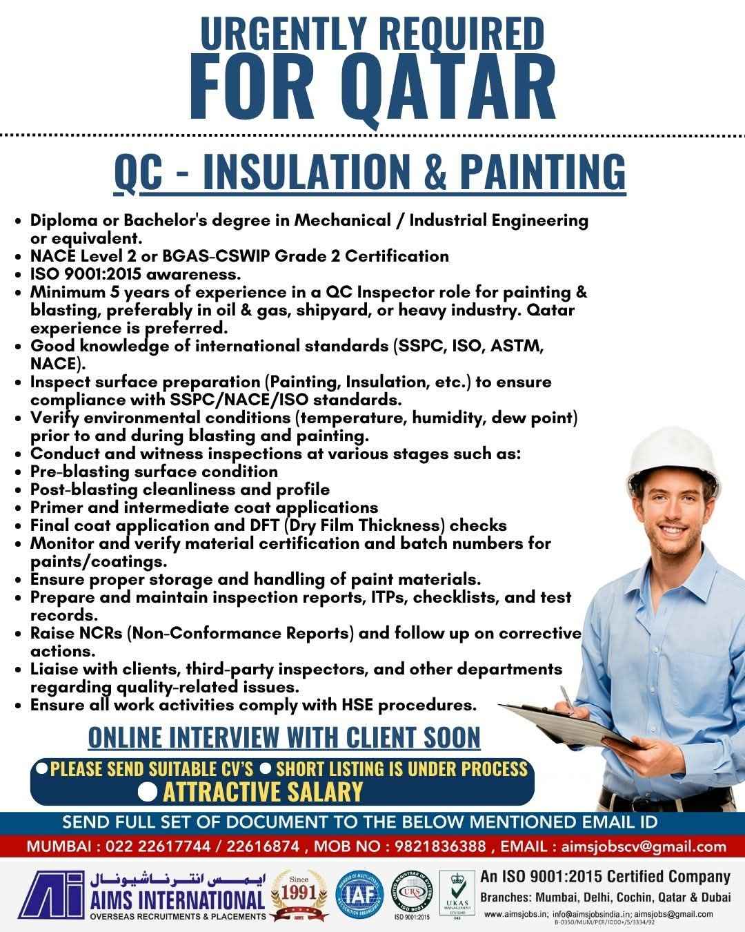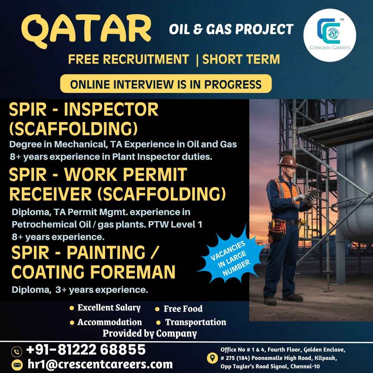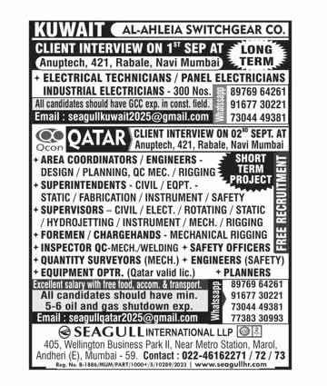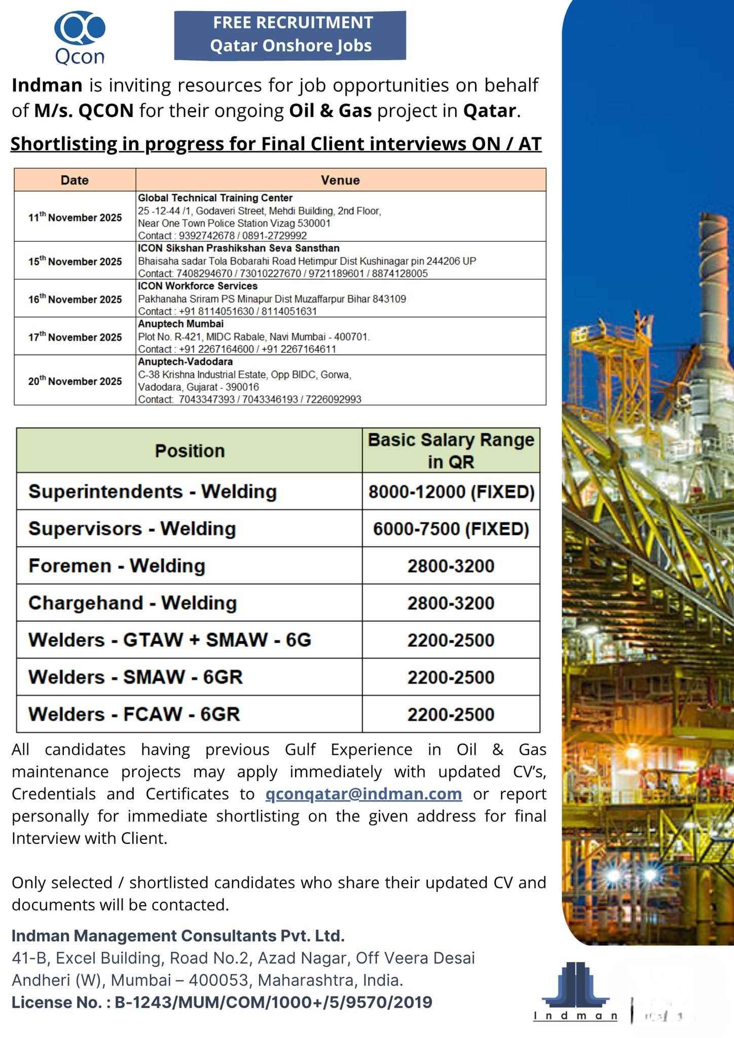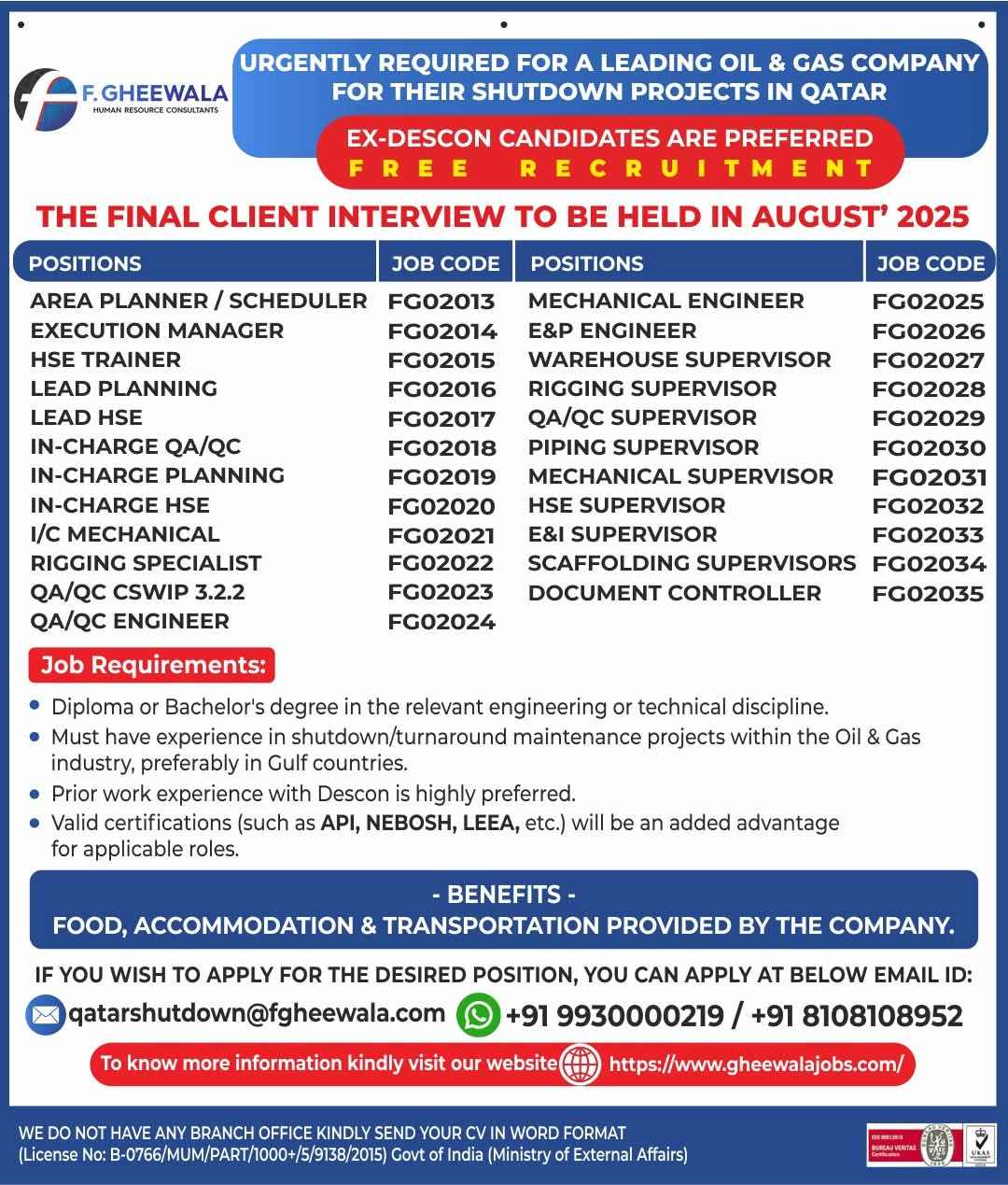 URGENTLY REQUIRED FOR A LEADING OIL & GAS COMPANY FOR THEIR SHUTDOWN PROJECT IN QATAR