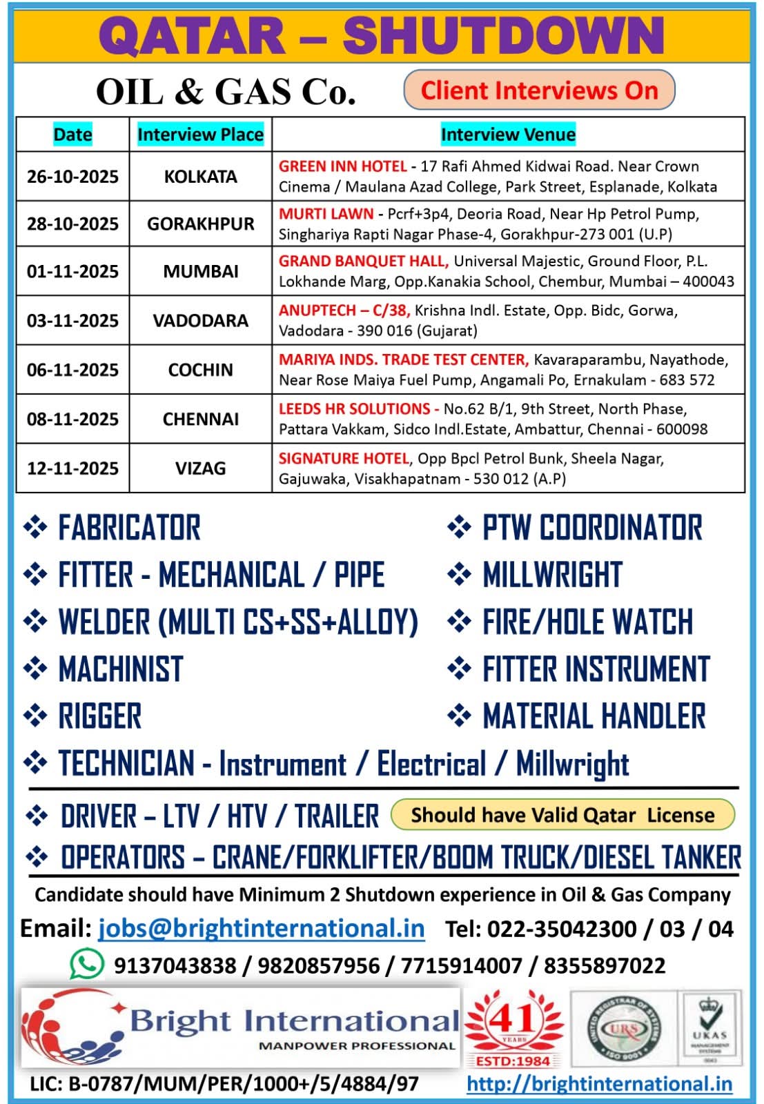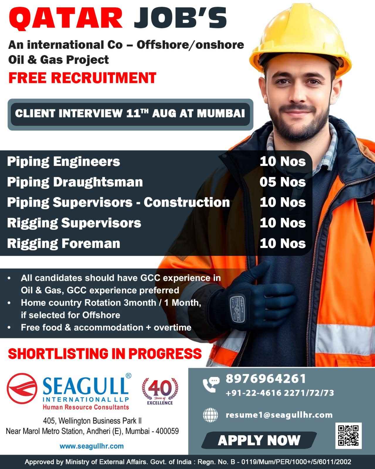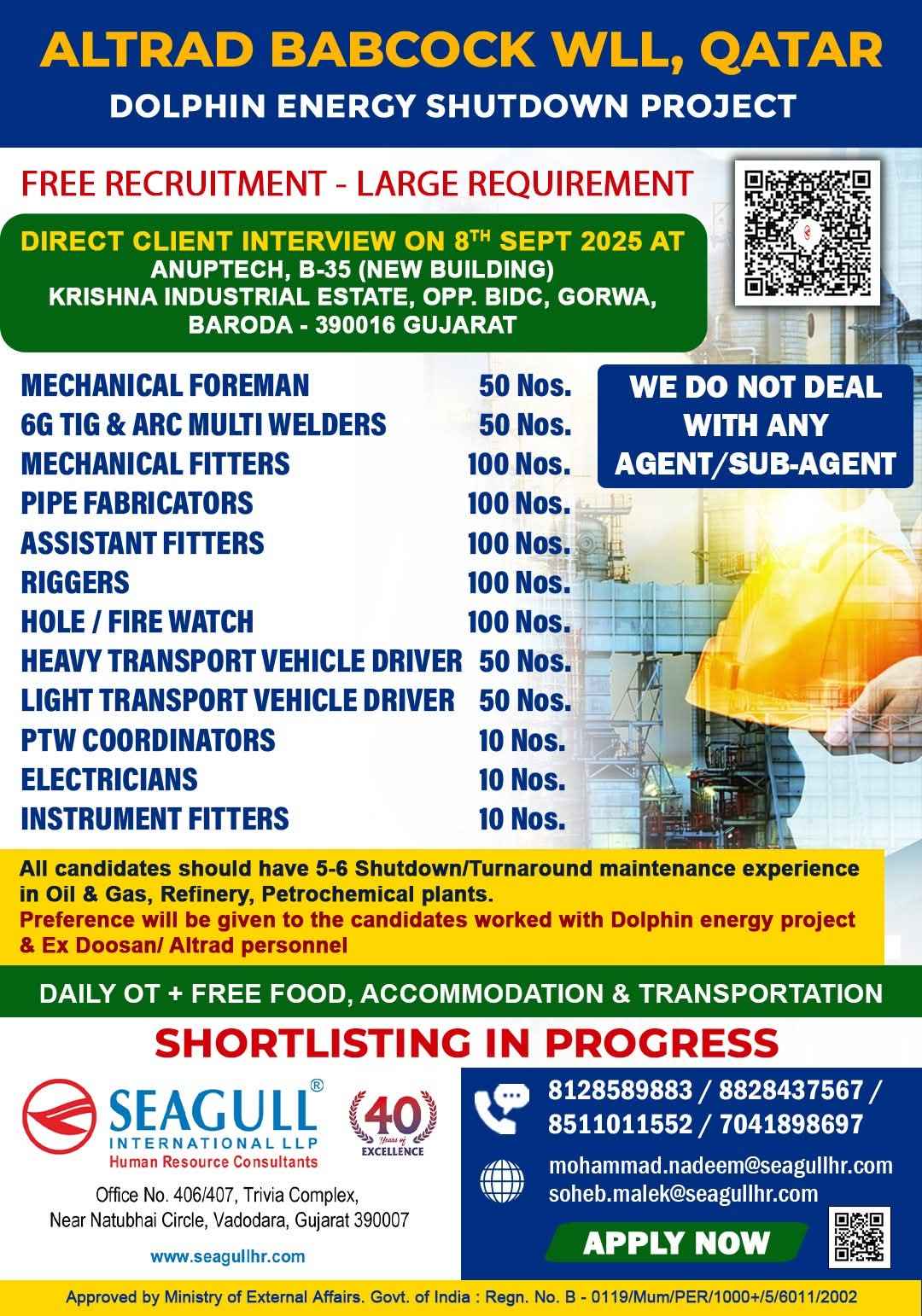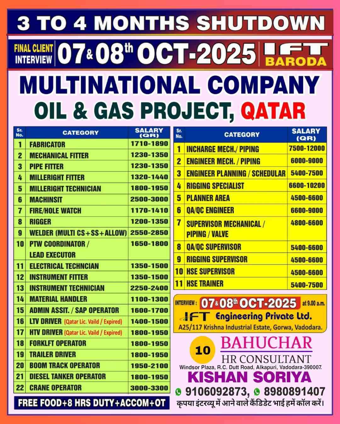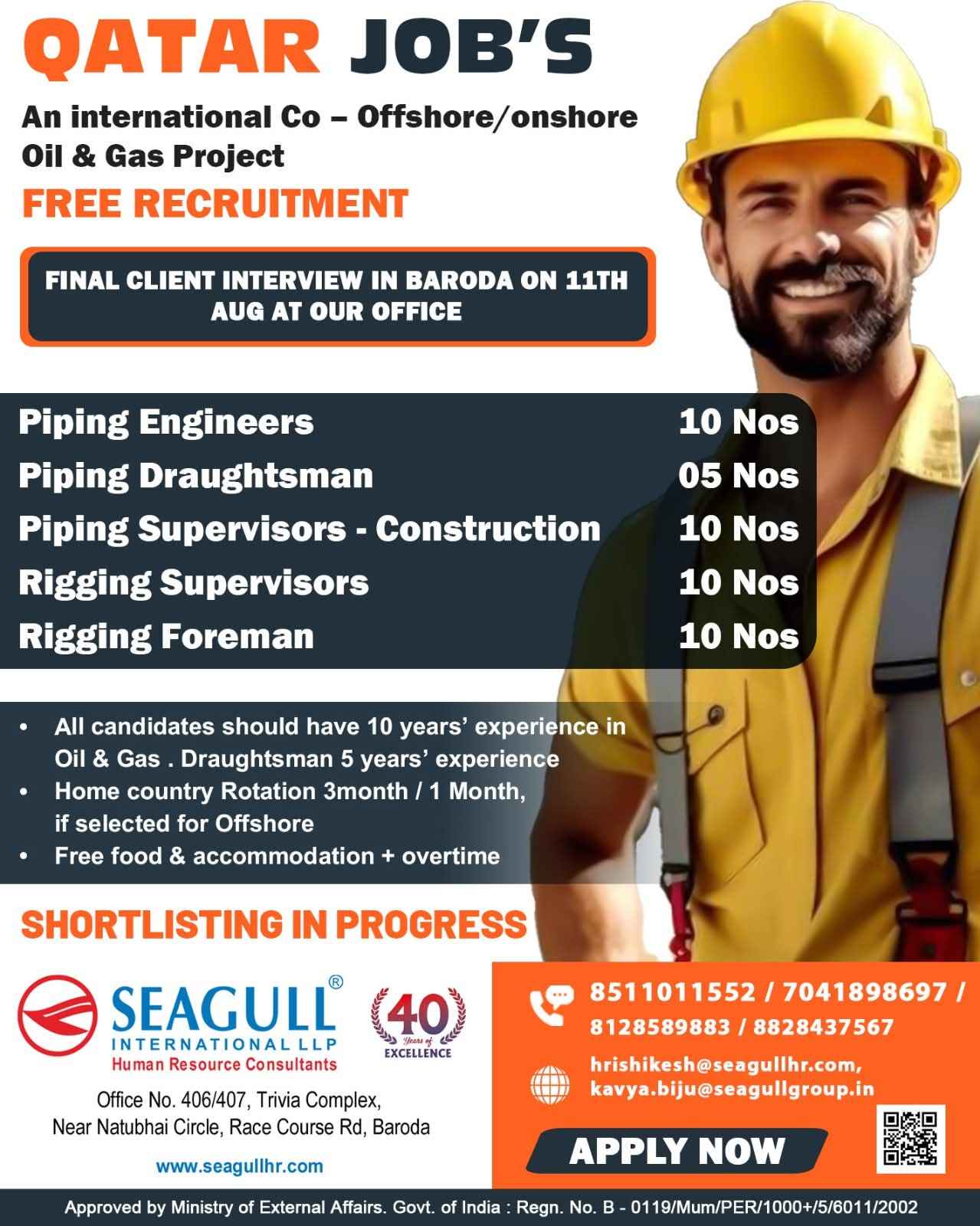 URGENTLY REQUIRED FOR A LEADING OIL & GAS COMPANY FOR THEIR SHUTDOWN PROJECT IN QATAR