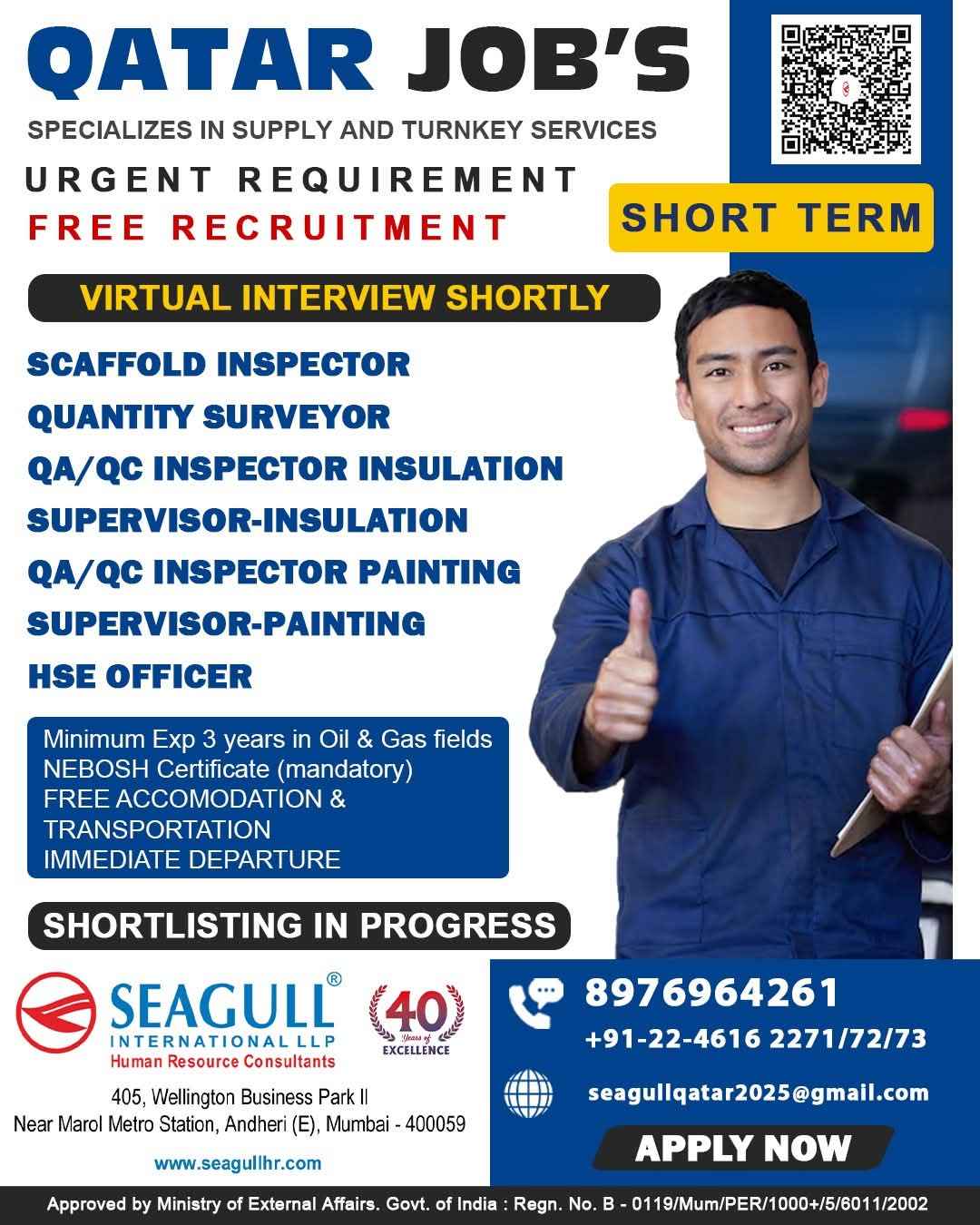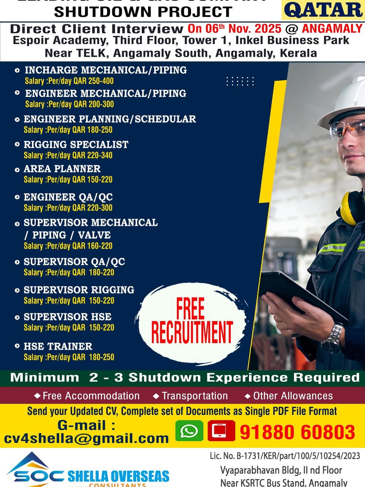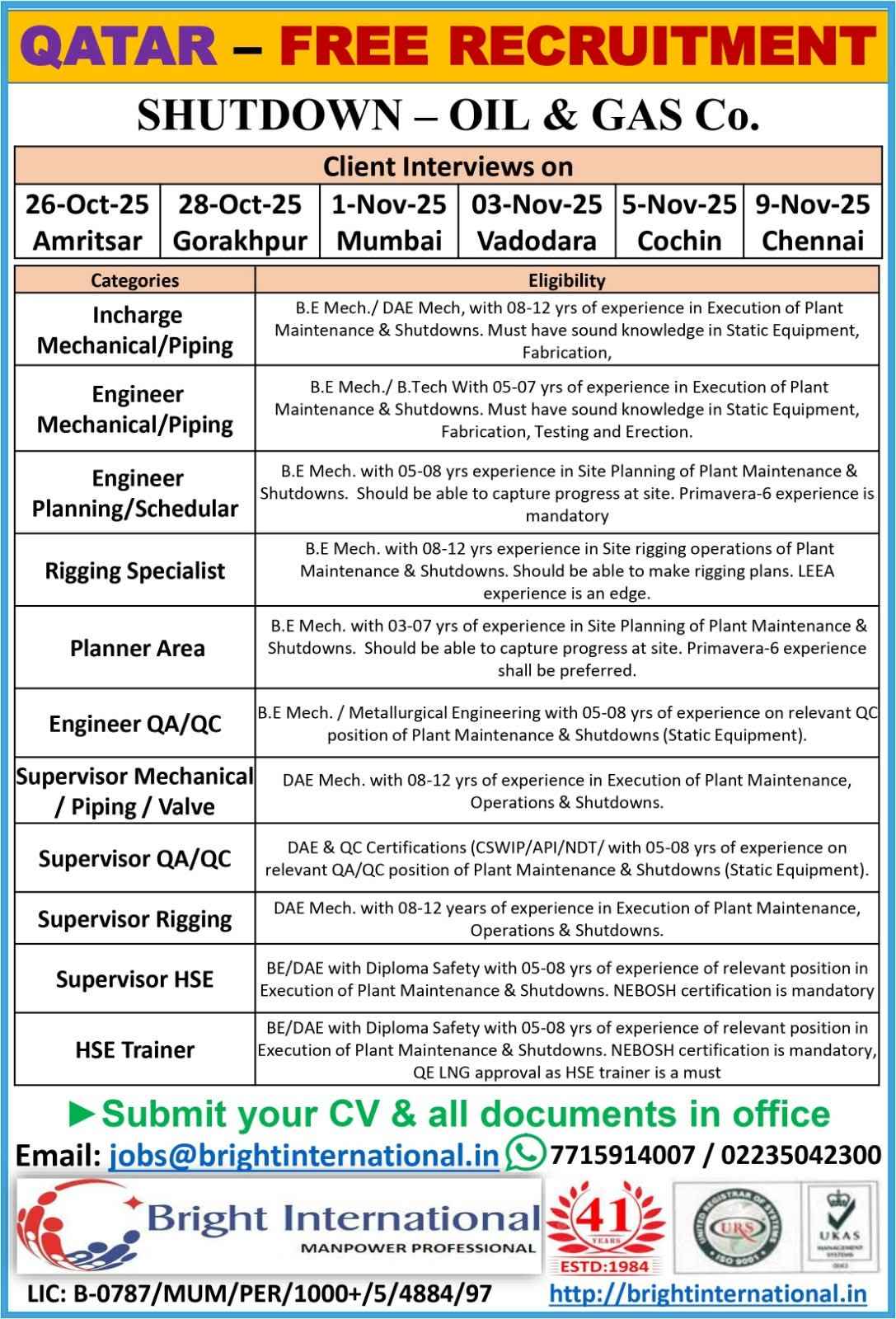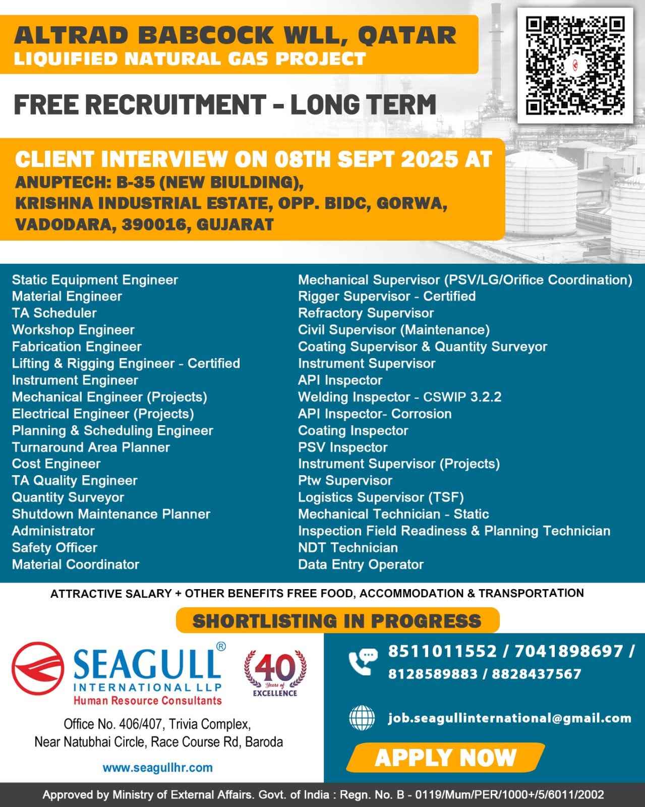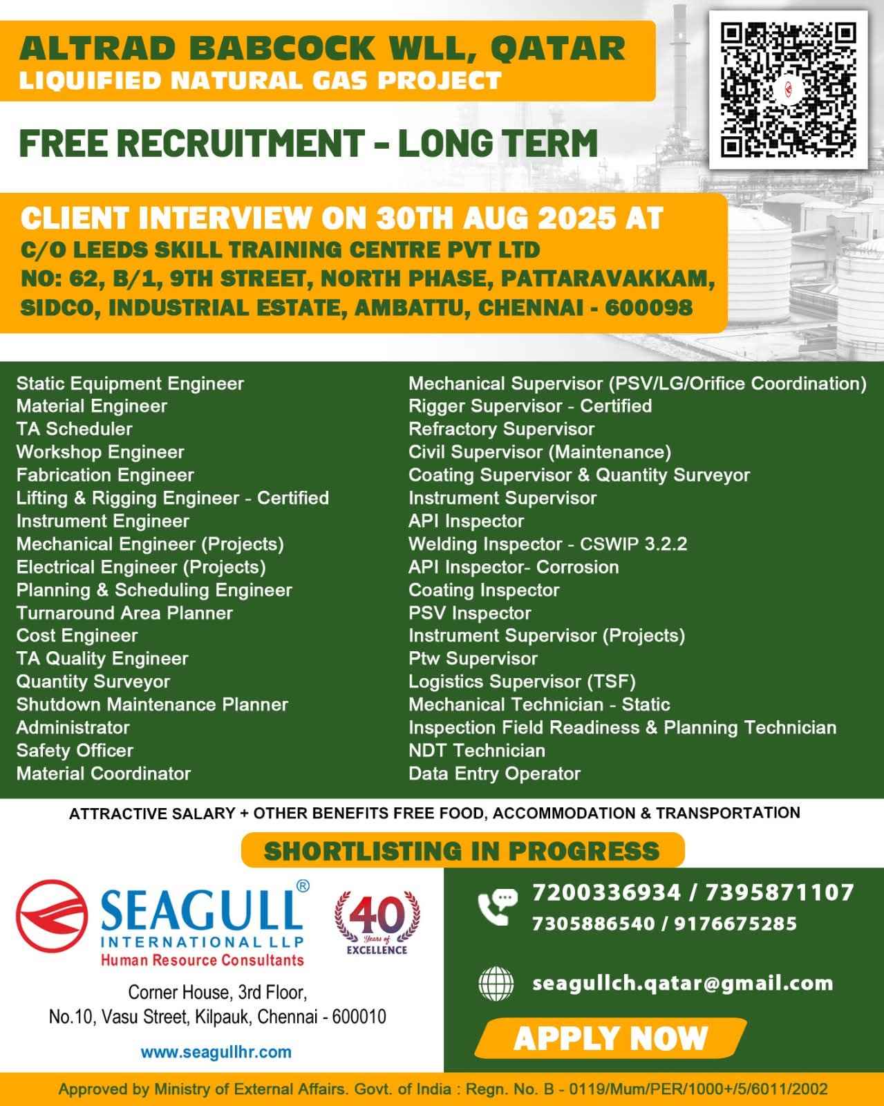 URGENTLY REQUIRED FOR A LEADING OIL & GAS COMPANY FOR THEIR SHUTDOWN PROJECT IN QATAR