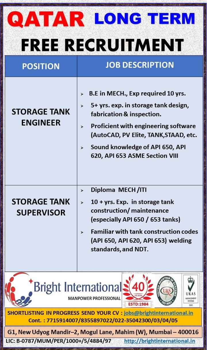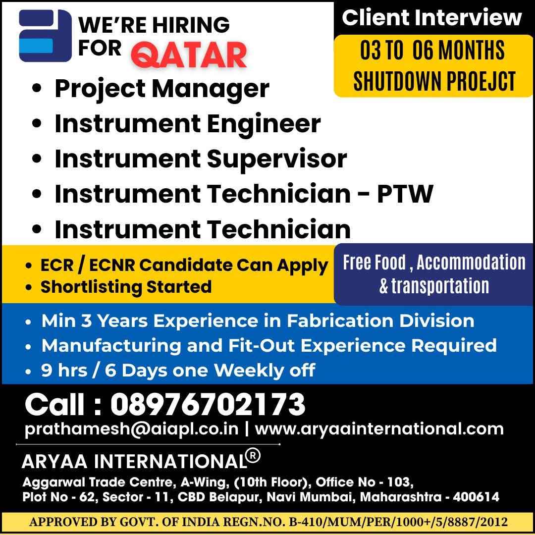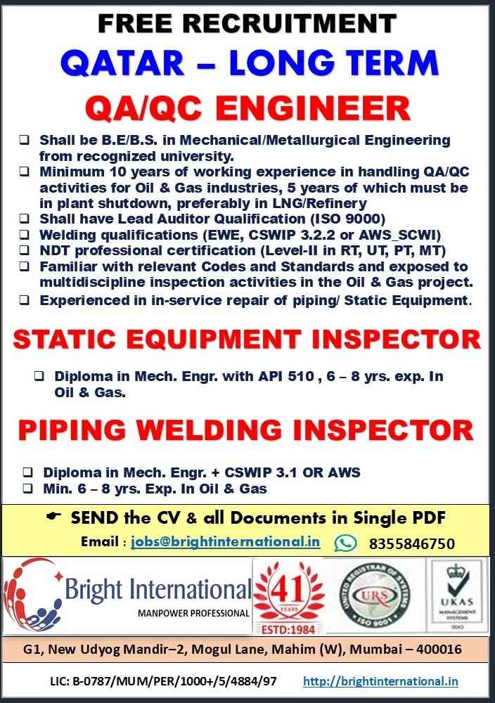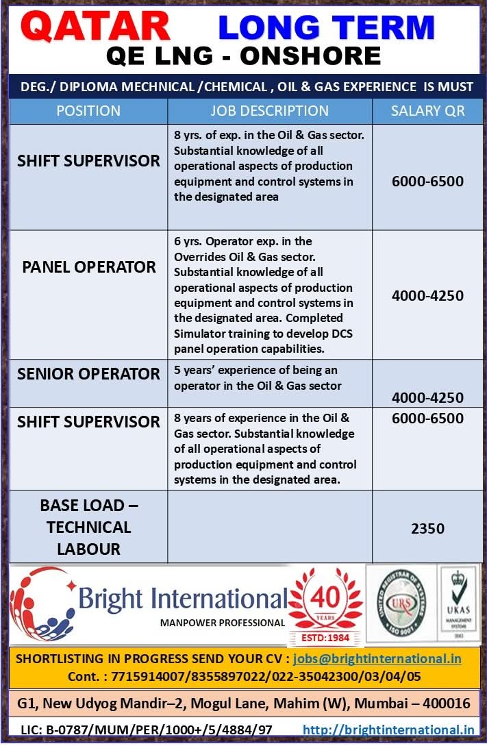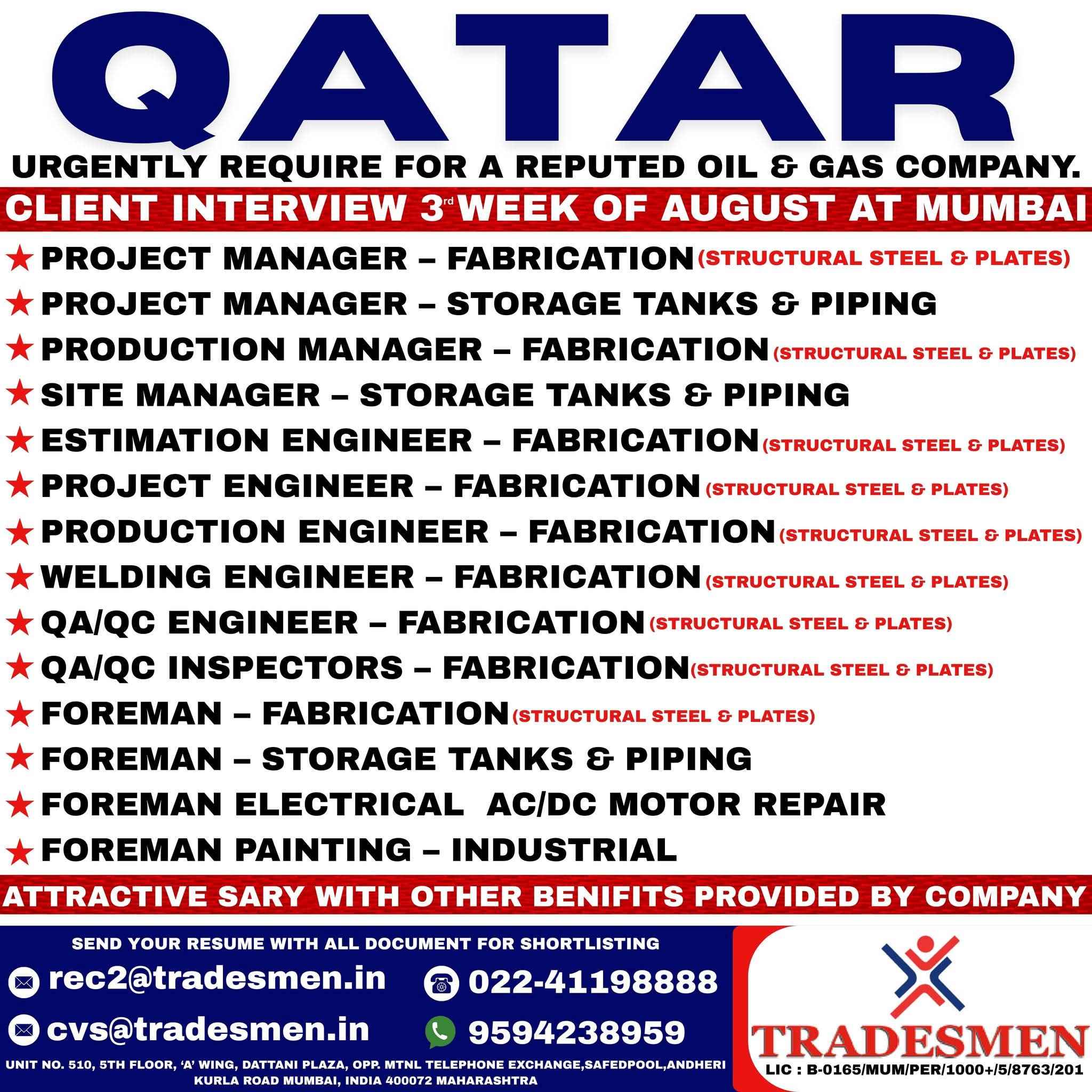 QATAR JOB'S An International Company requires for their oil & gas Long Term Project.