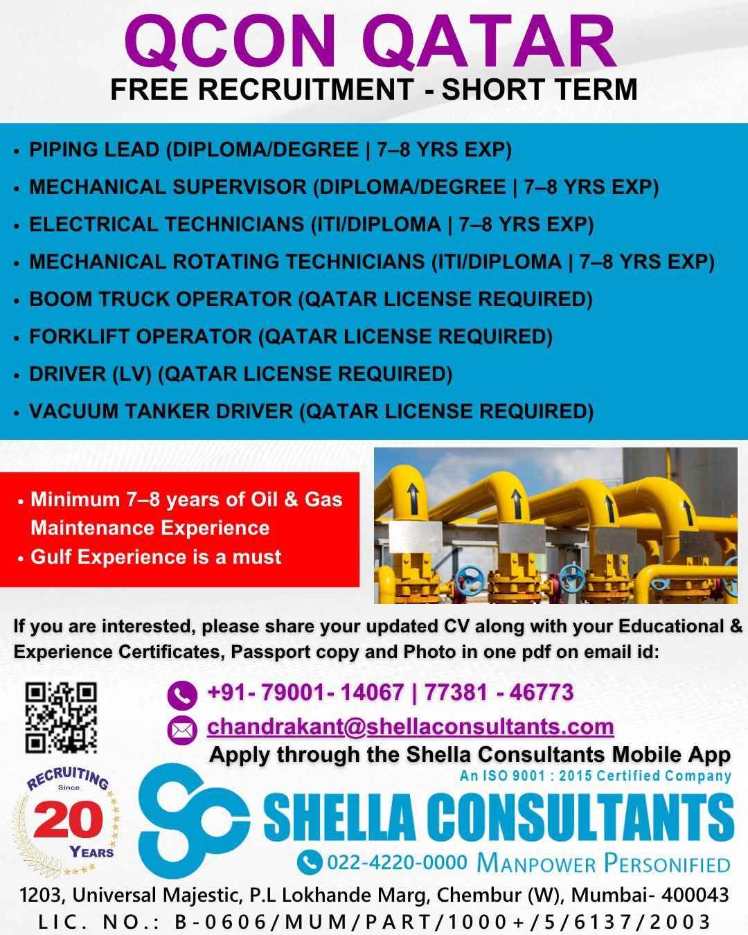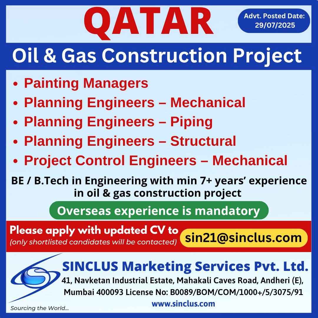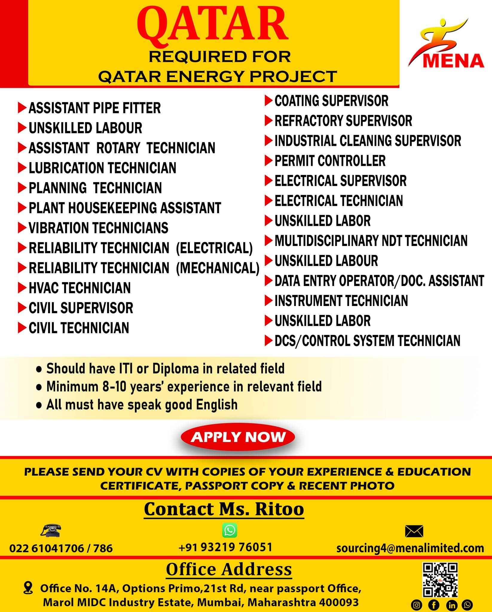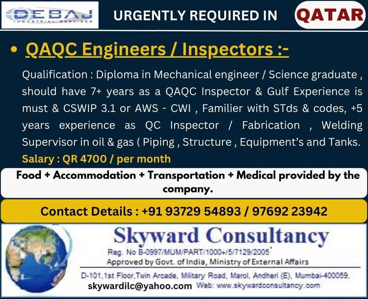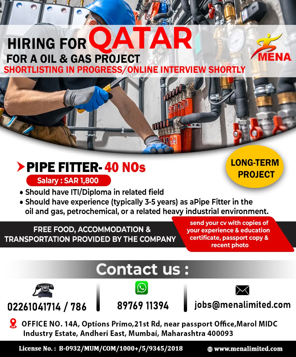 QATAR JOB'S An International Company requires for their oil & gas Long Term Project.