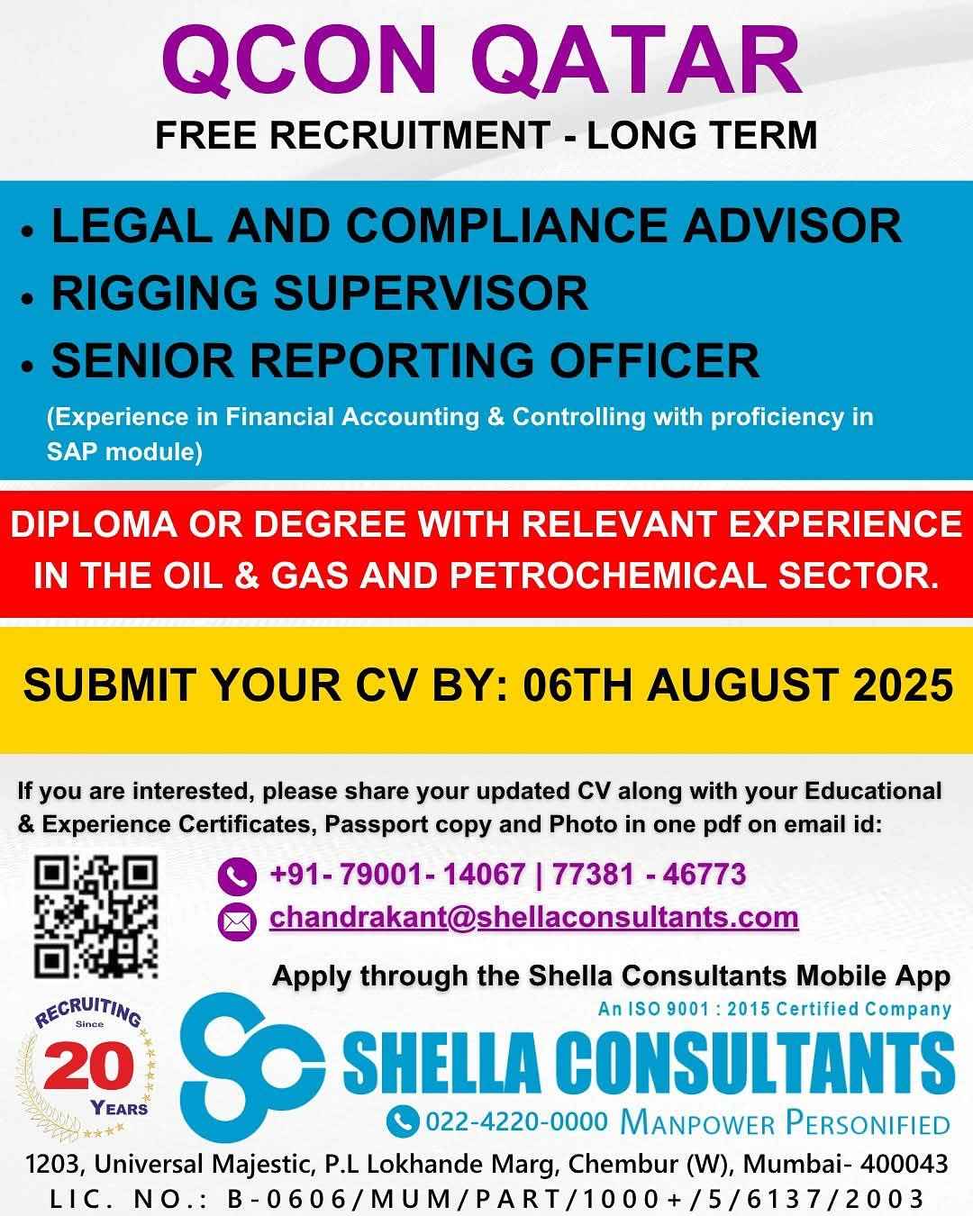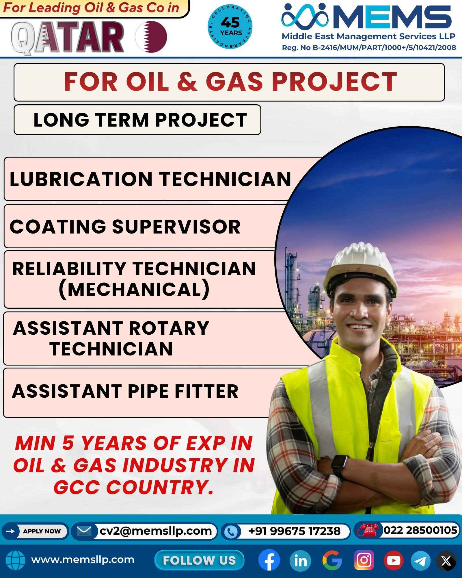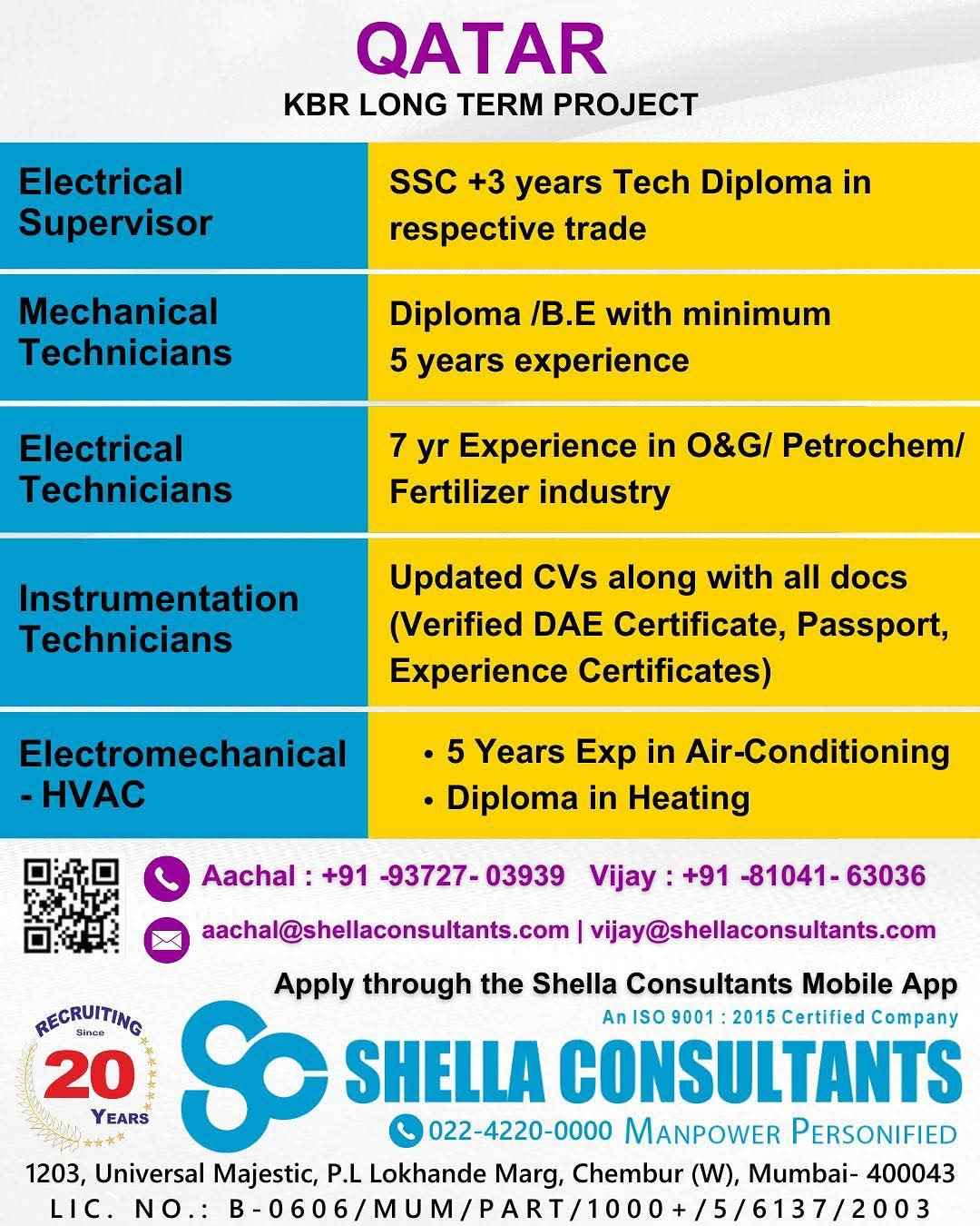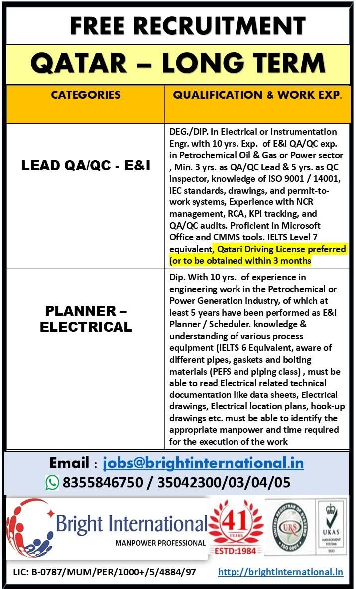 QATAR JOB'S An International Company requires for their oil & gas Long Term Project.