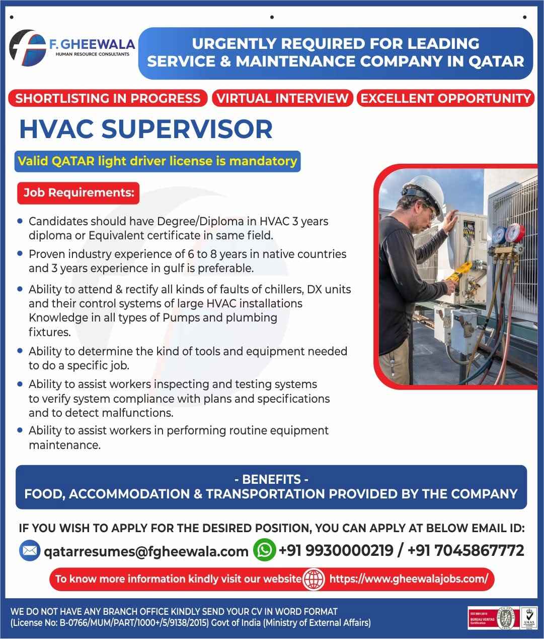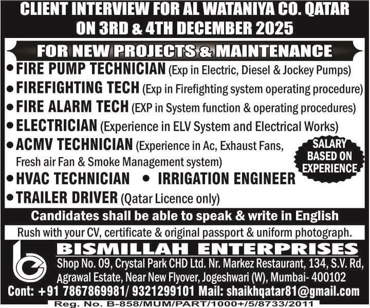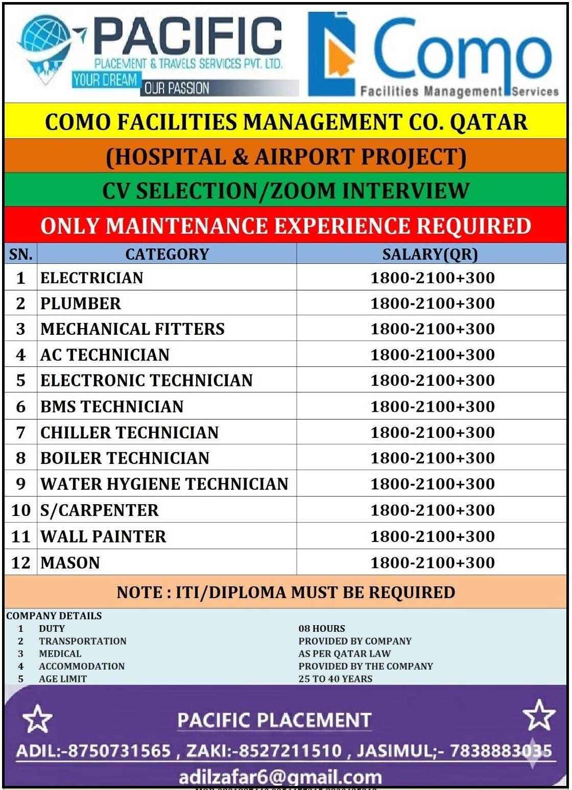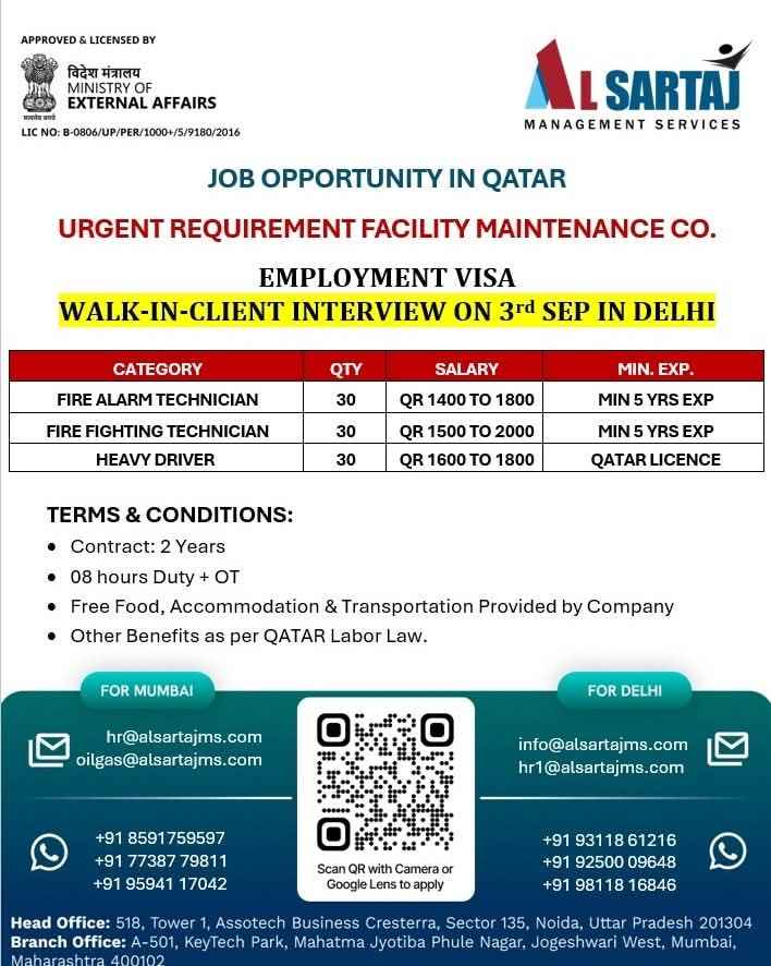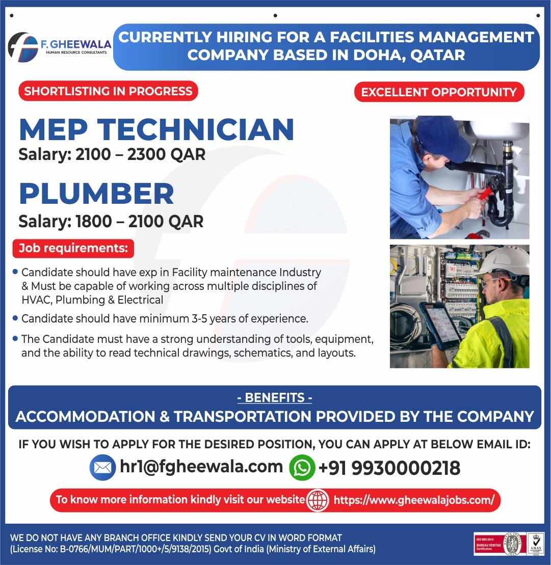 URGENT REQUIREMENT For a Leading Facility Maintenance Company in Qatar