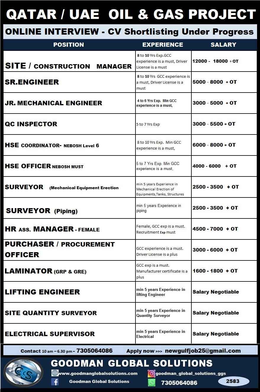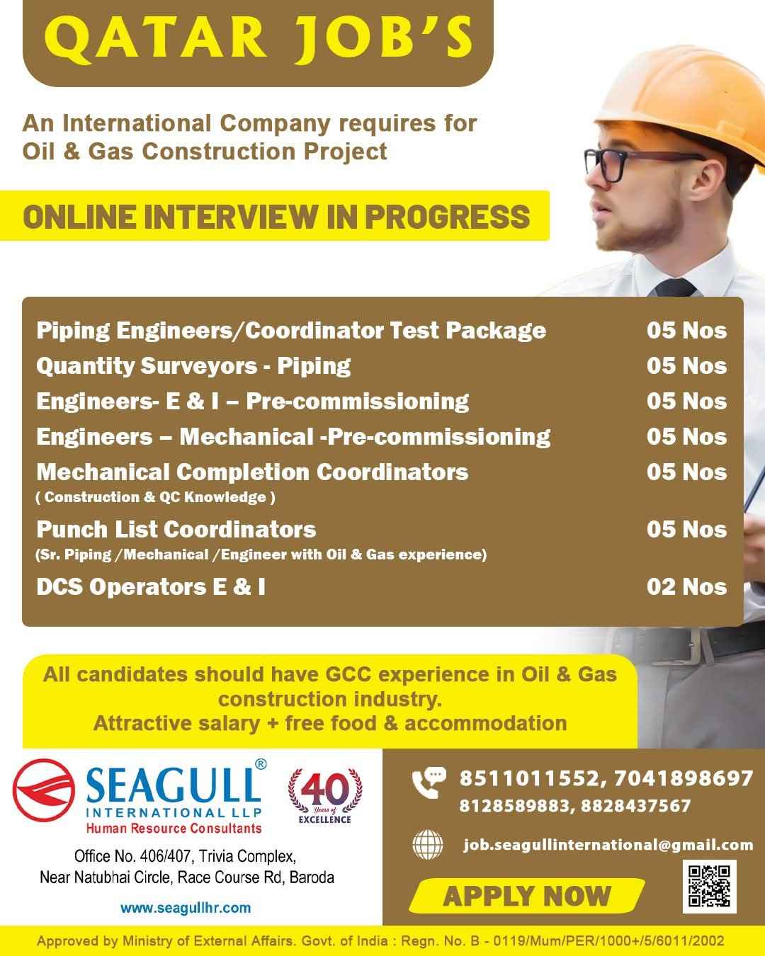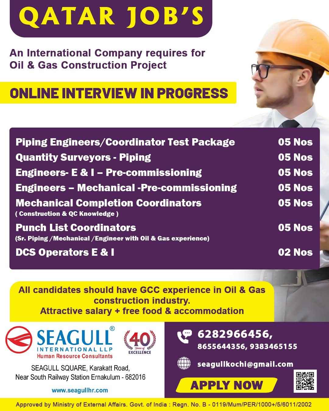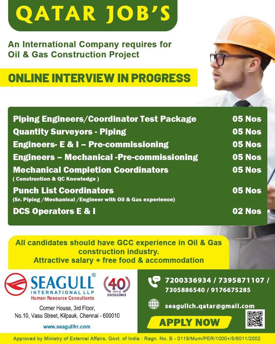 QATAR JOB'S Hiring for an international Company Oil & Gas Construction Project