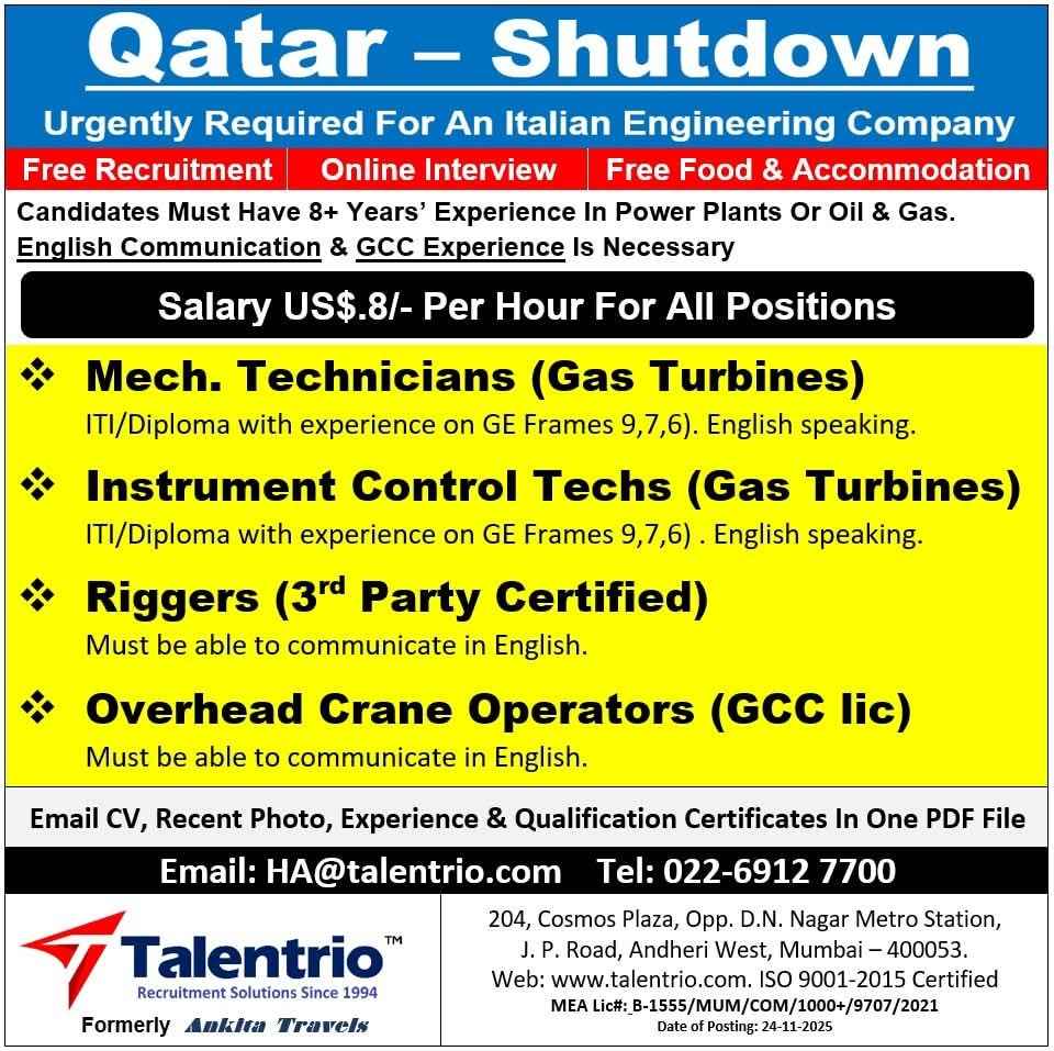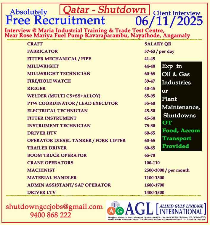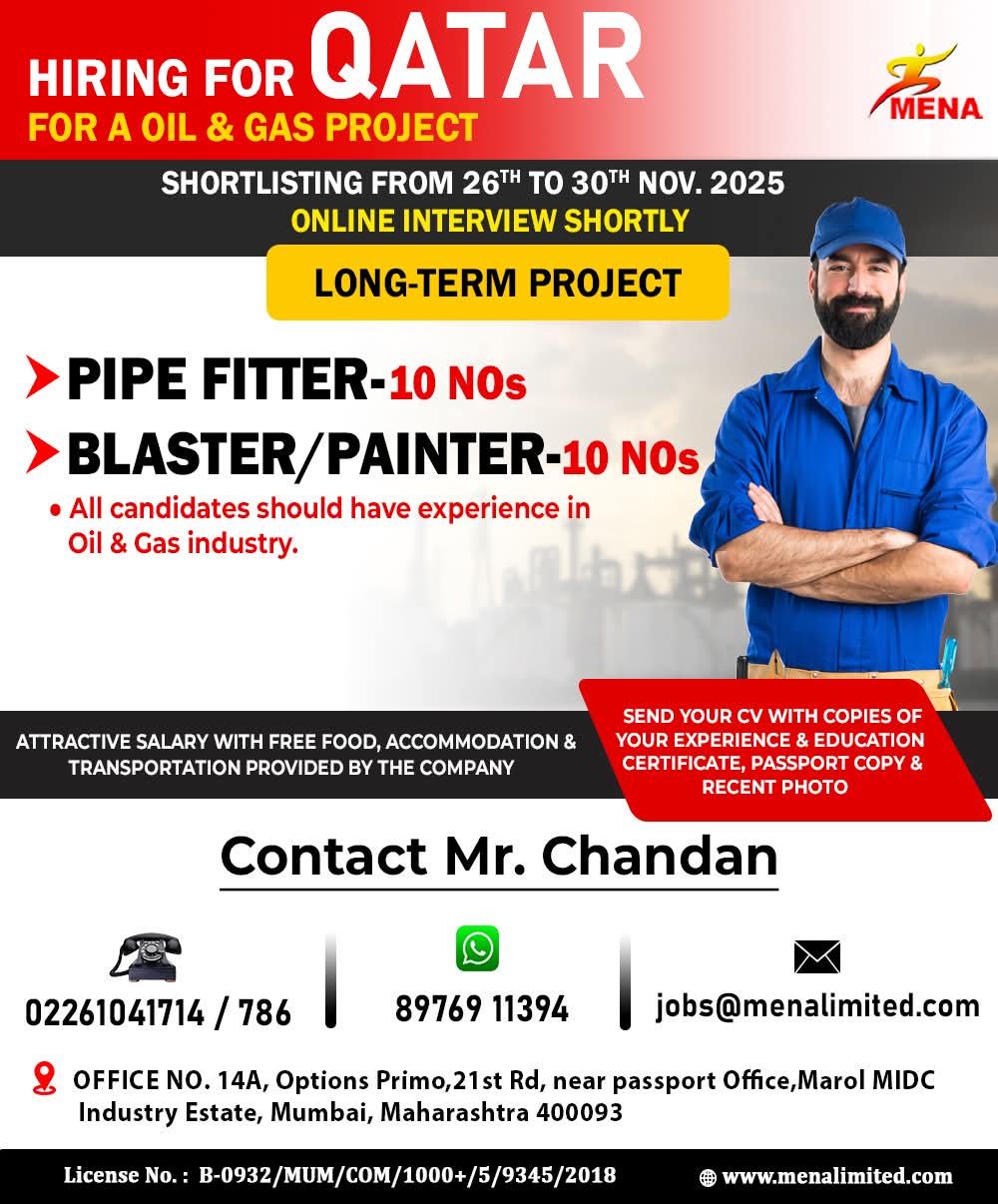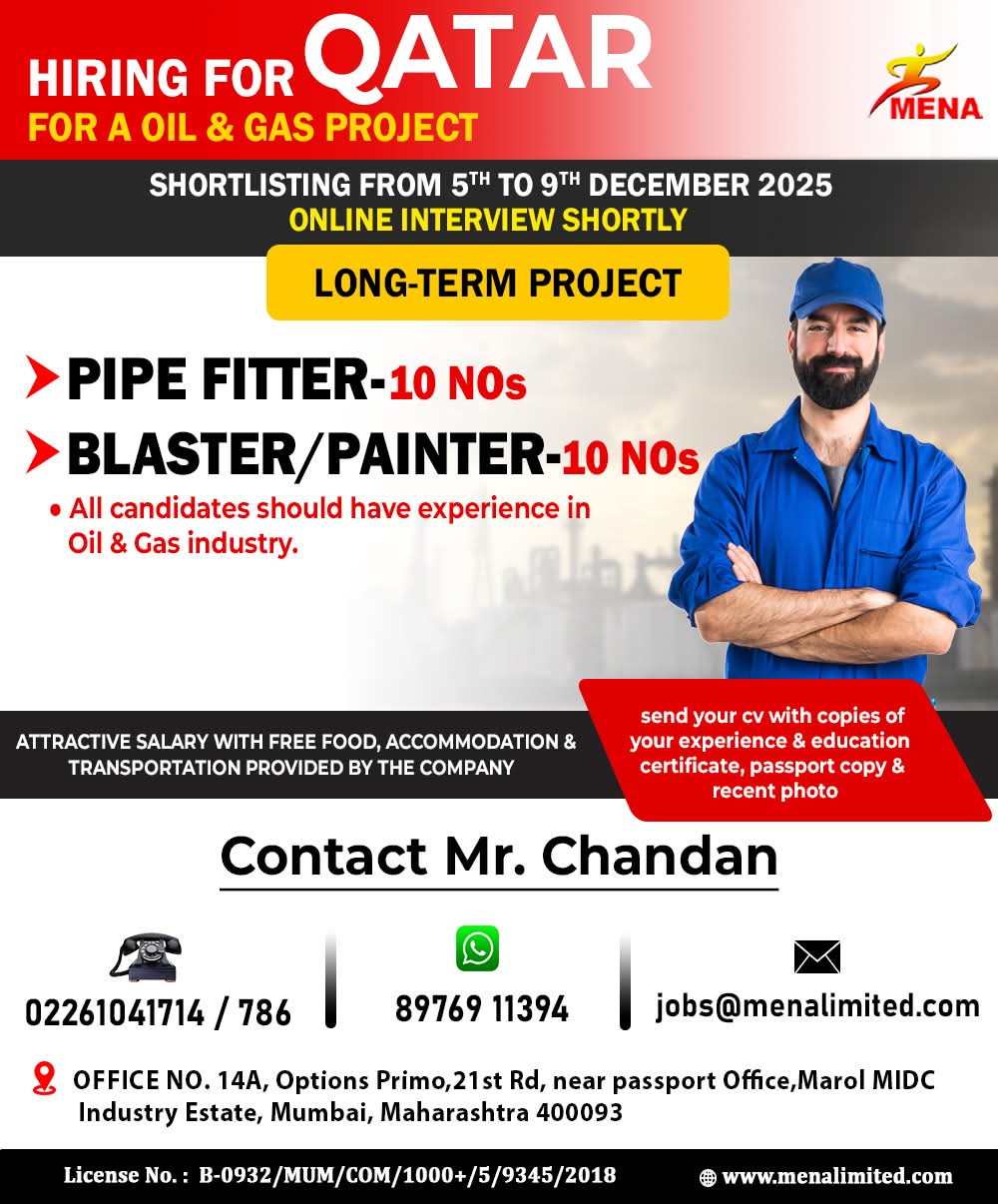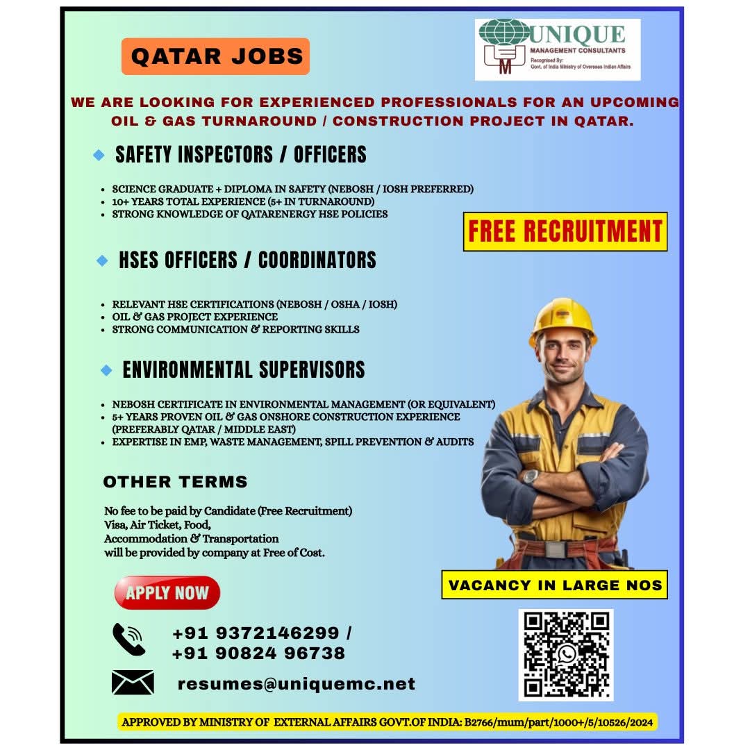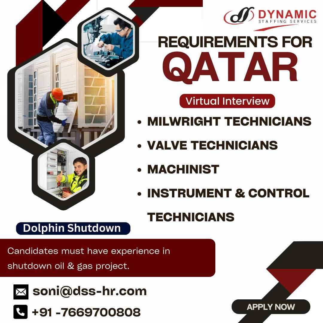 WE ARE HIRING FOR OIL & GAS WORKSHOP & MAINTENANCE PROJECTS IN QATAR