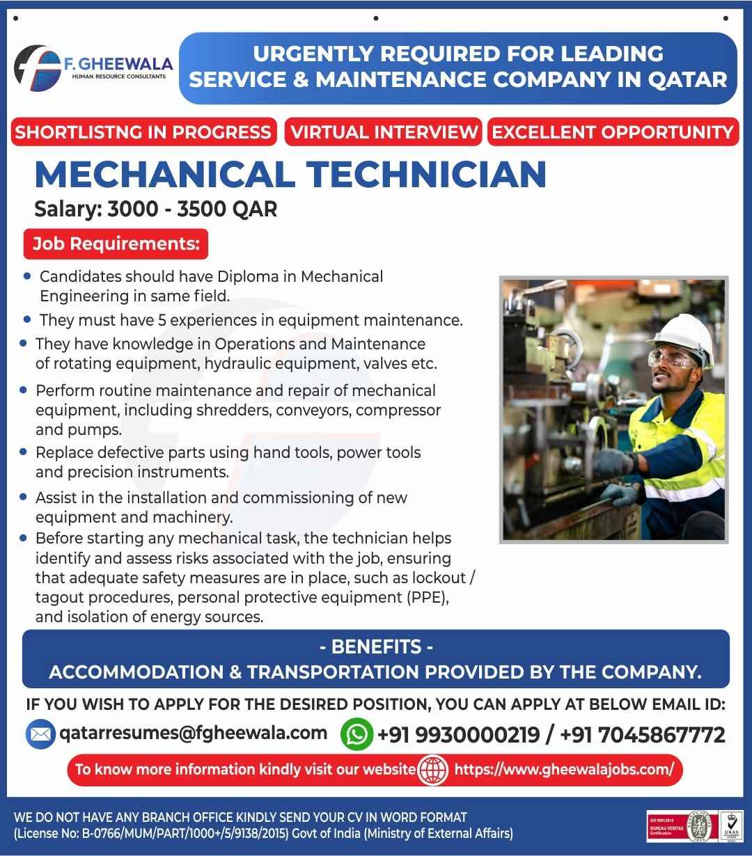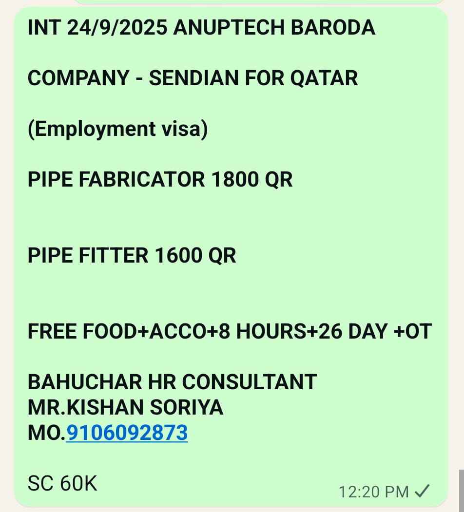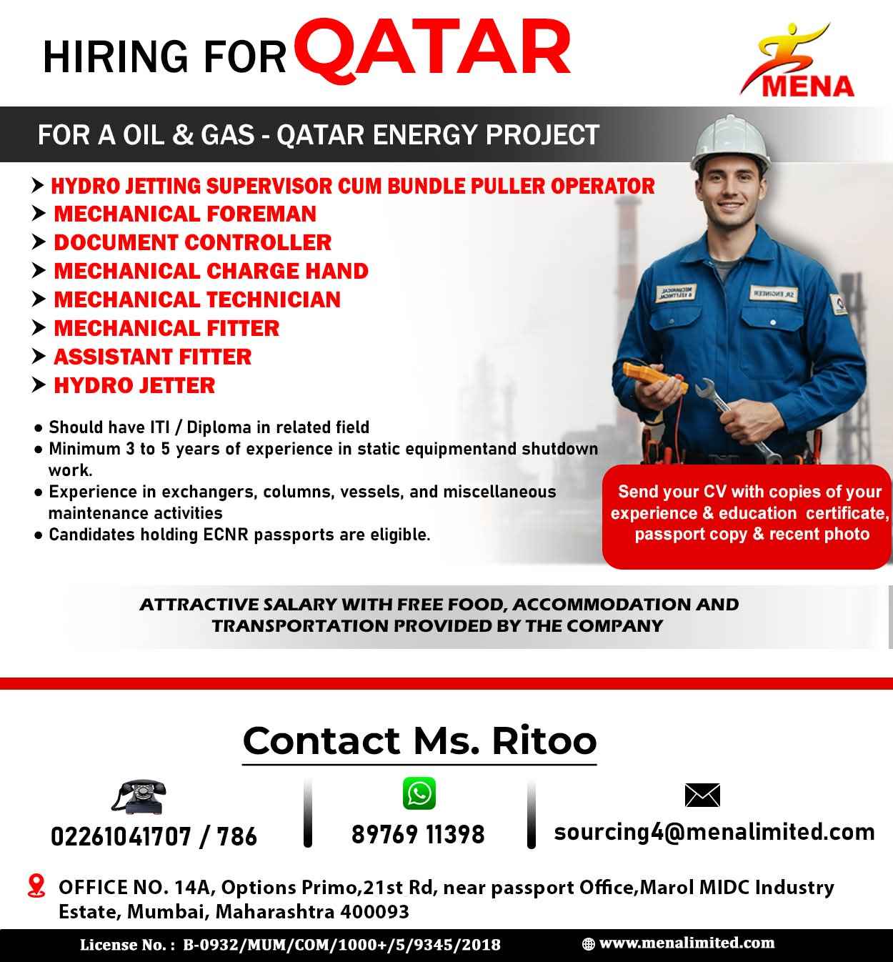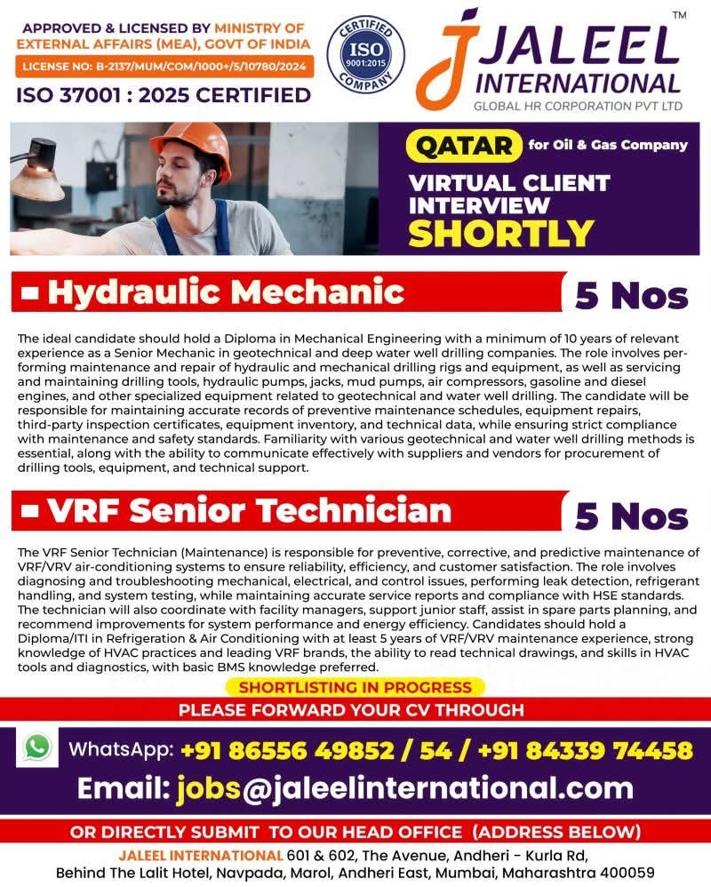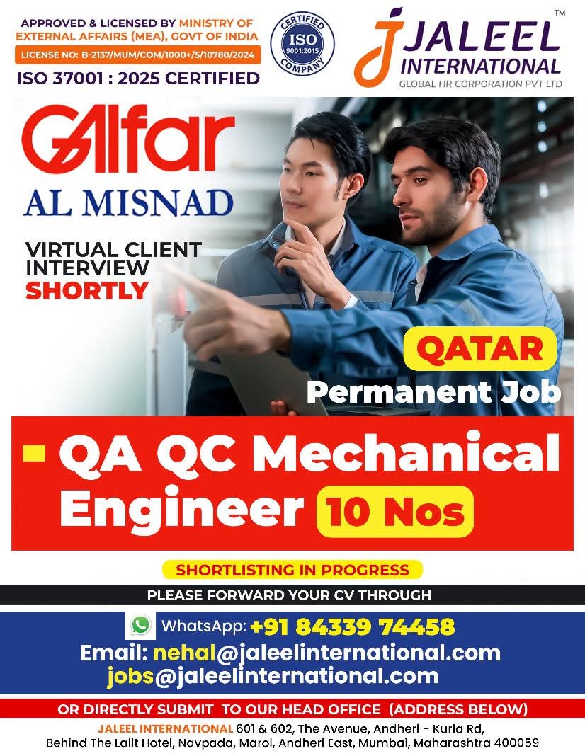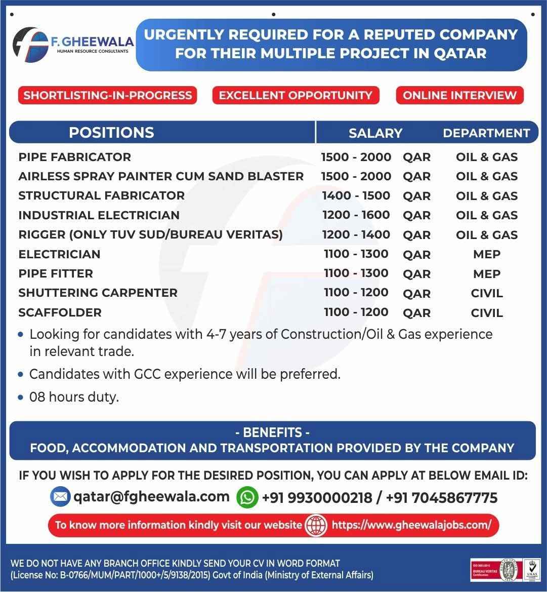 WE ARE HIRING FOR OIL & GAS WORKSHOP & MAINTENANCE PROJECTS IN QATAR