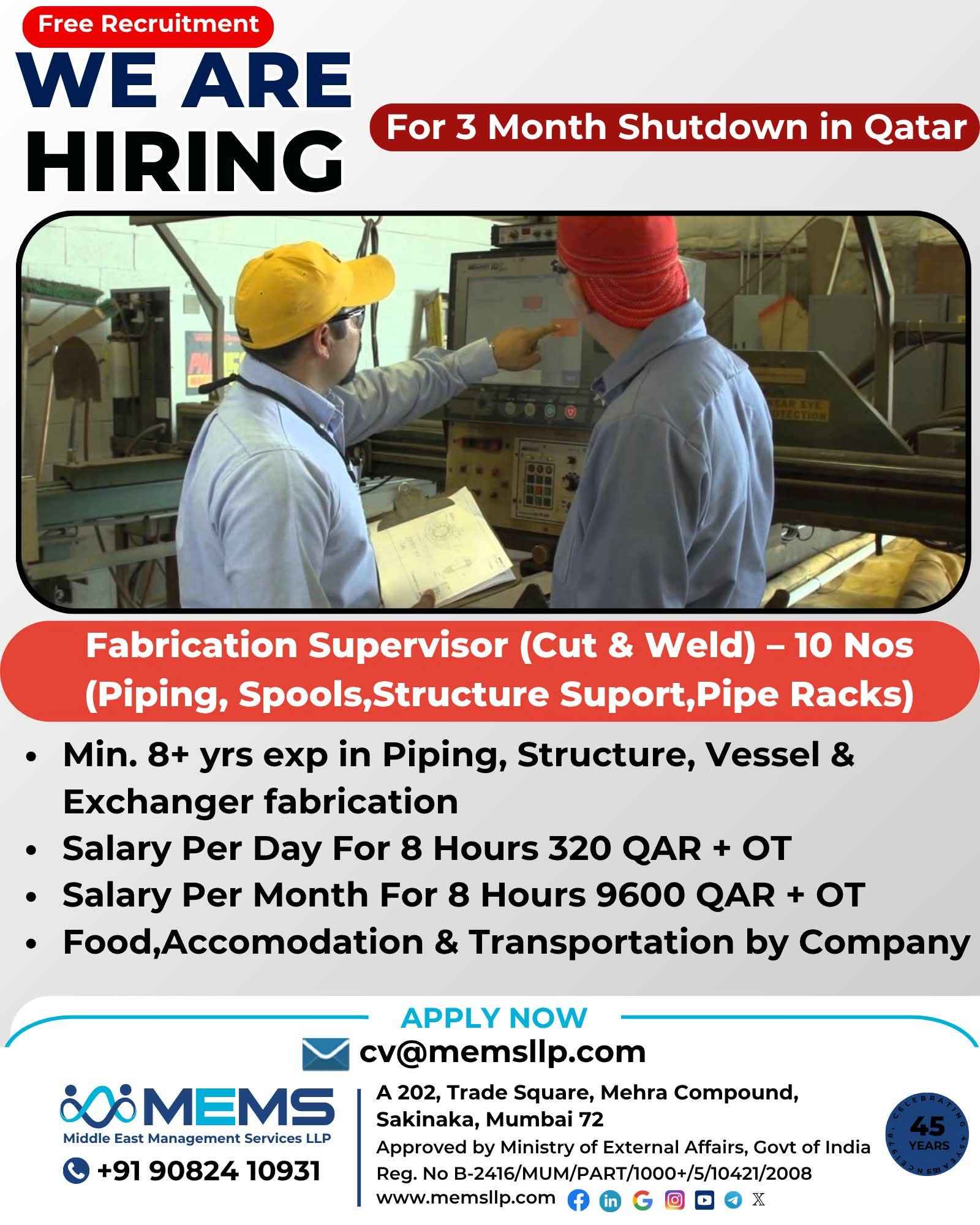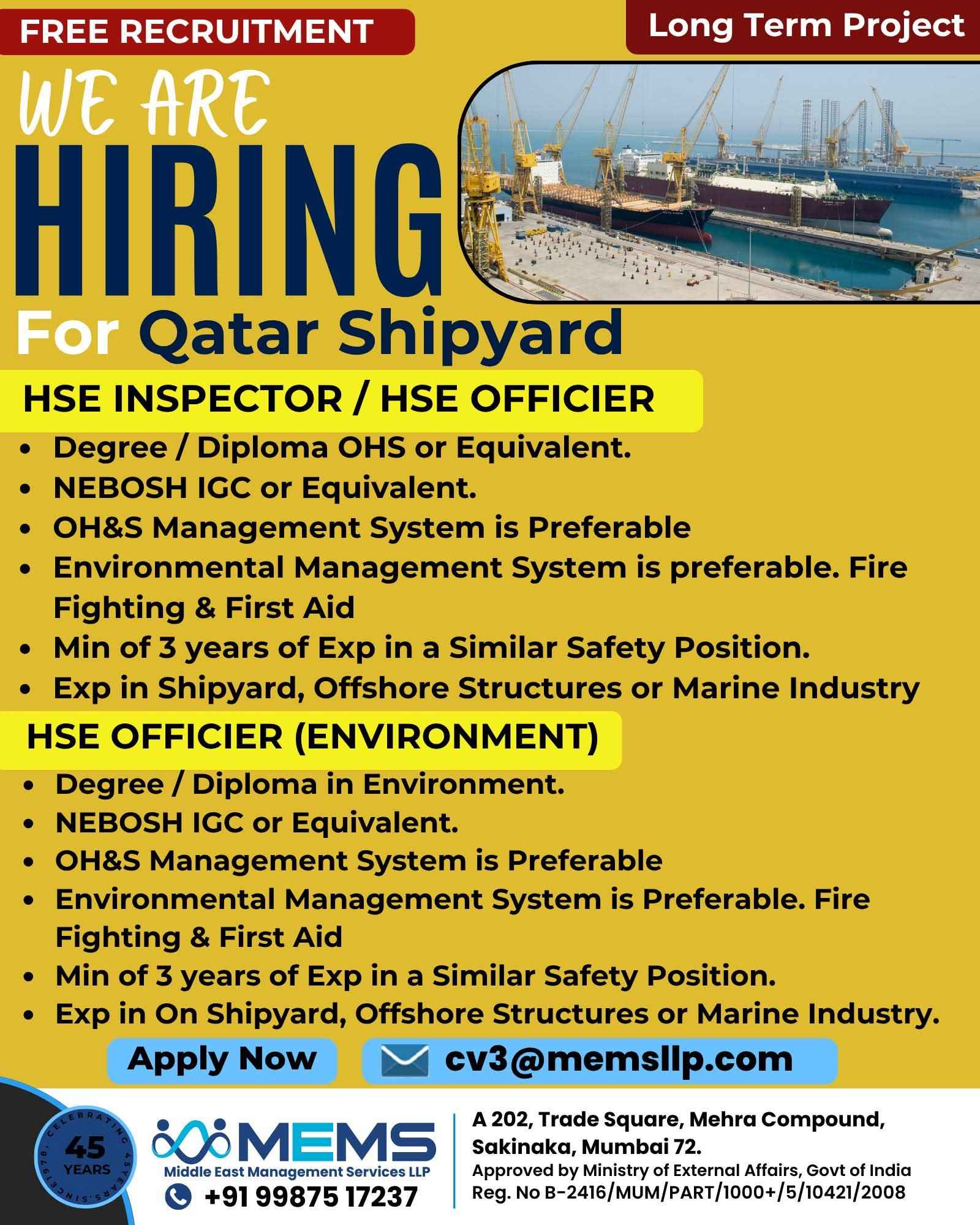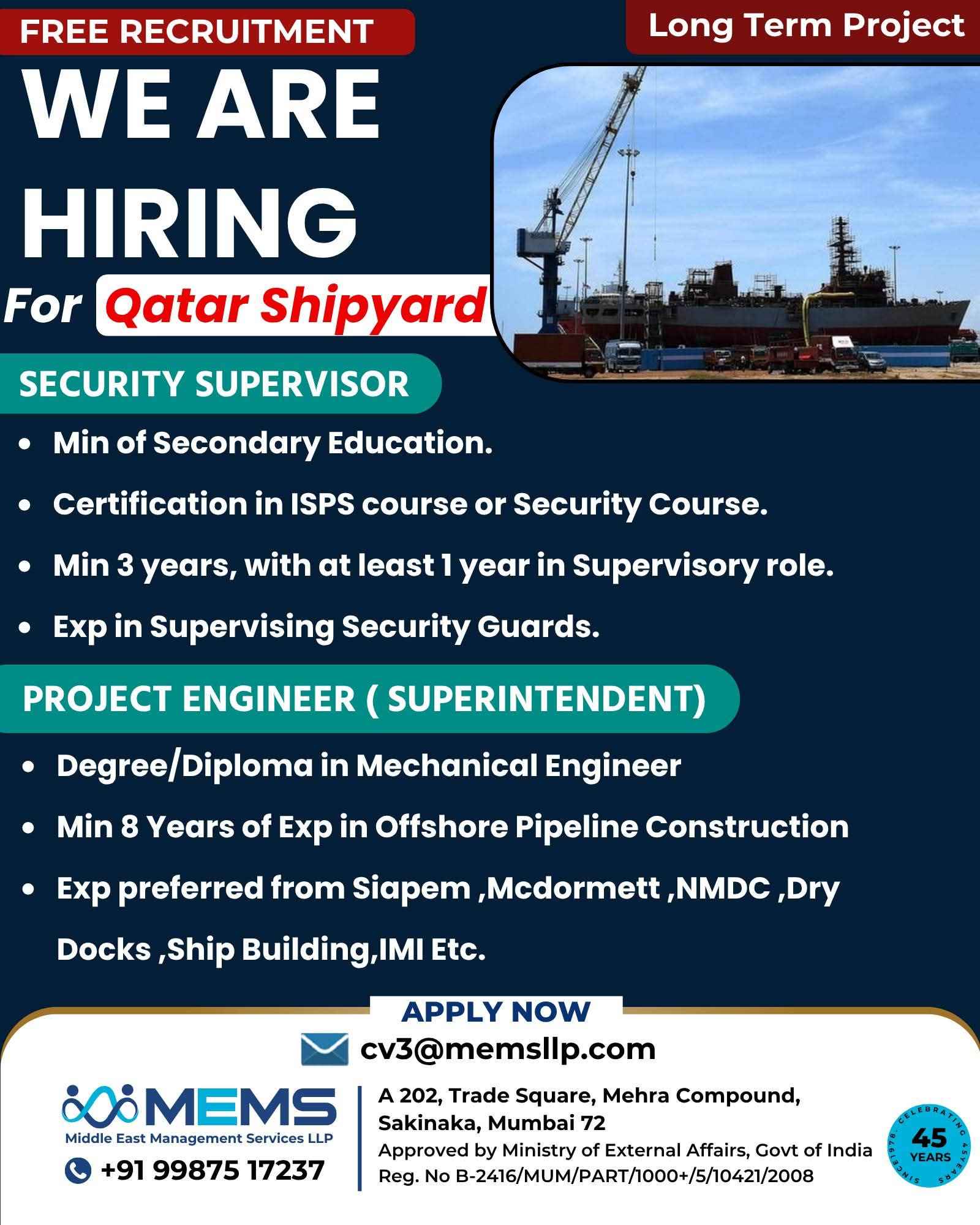 Free Recruitment WE ARE HIRING MEMS Middle East Management Services LLP QATAR SHIPYARD TECHNOLOGY SOLUTIONS For Qatar Shipyard