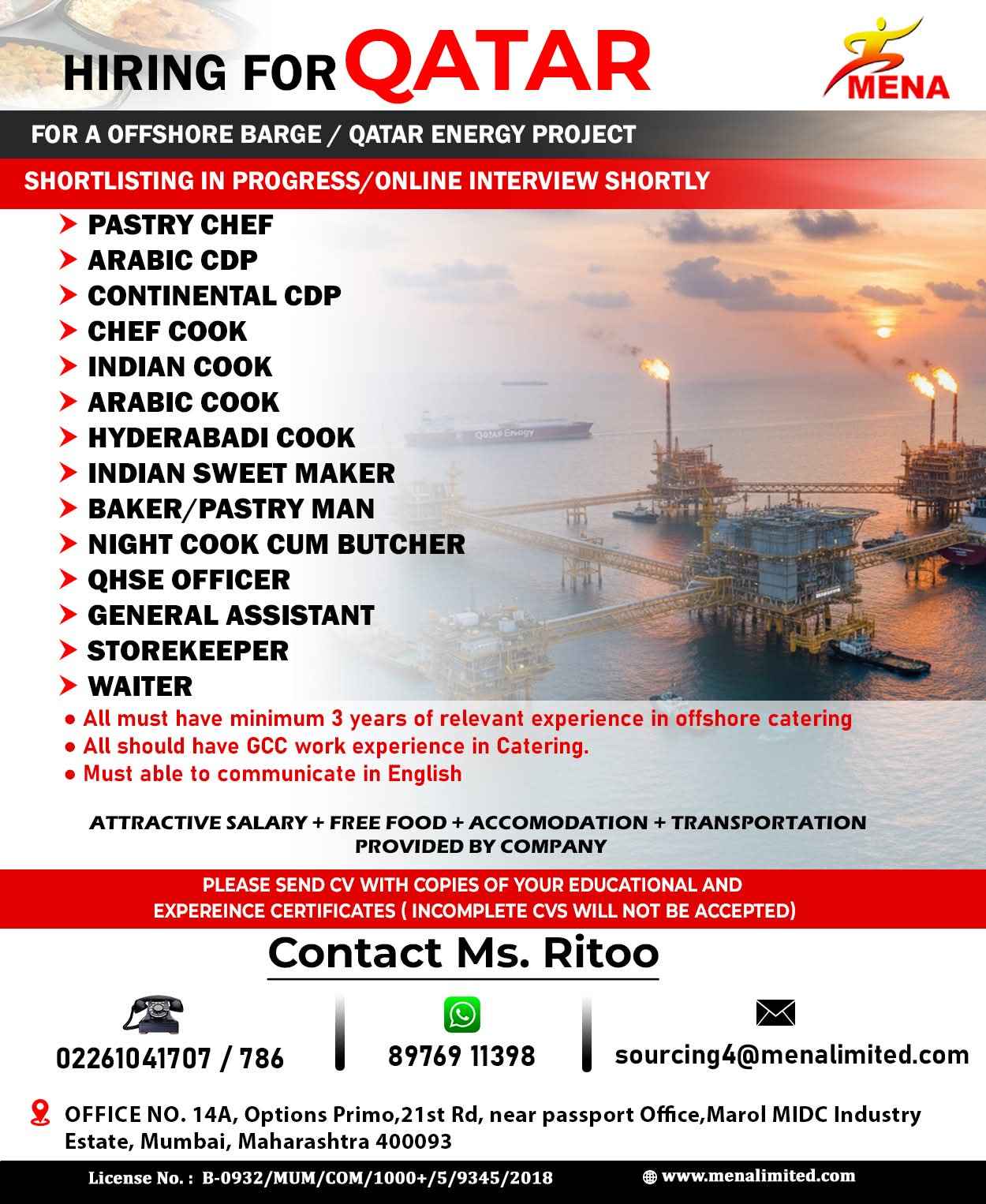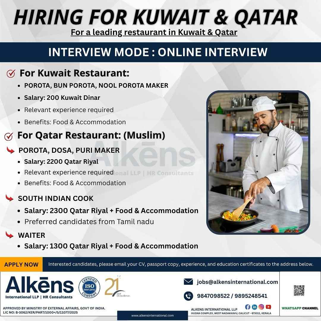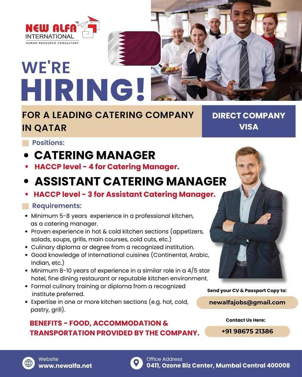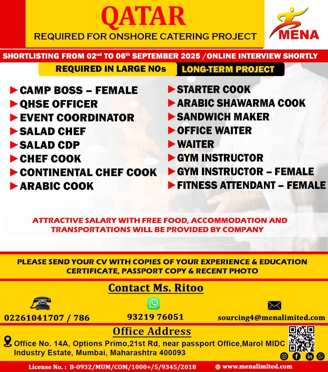URGENT REQUIREMENT For a Leading Hospitality Company for their University Catering Projects in Doha, Qatar