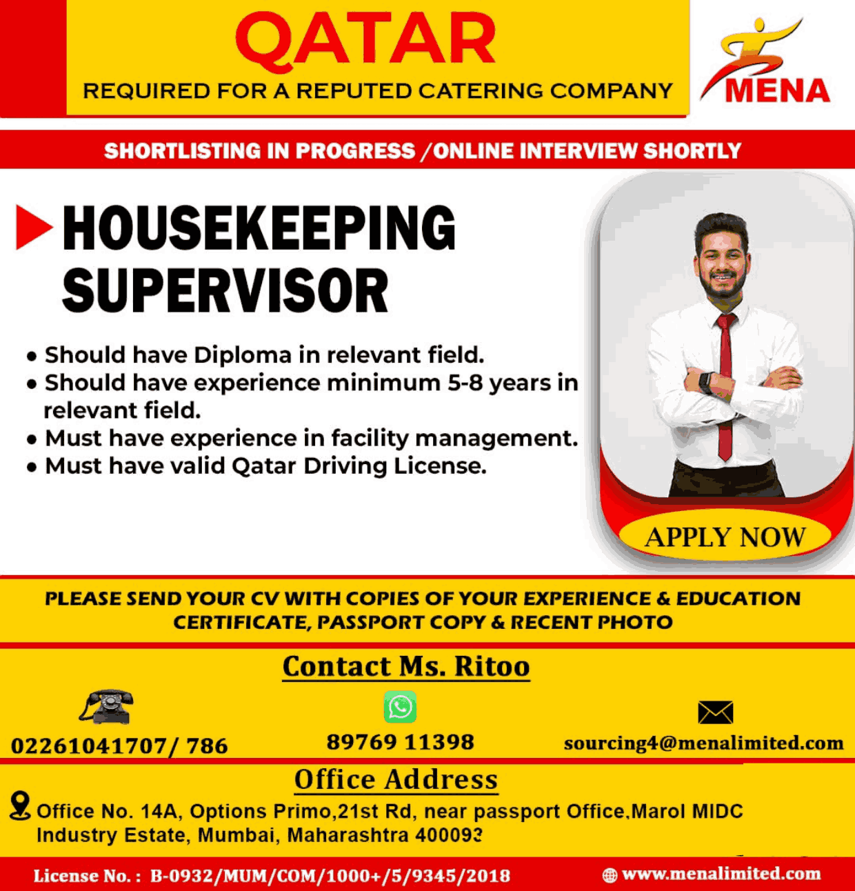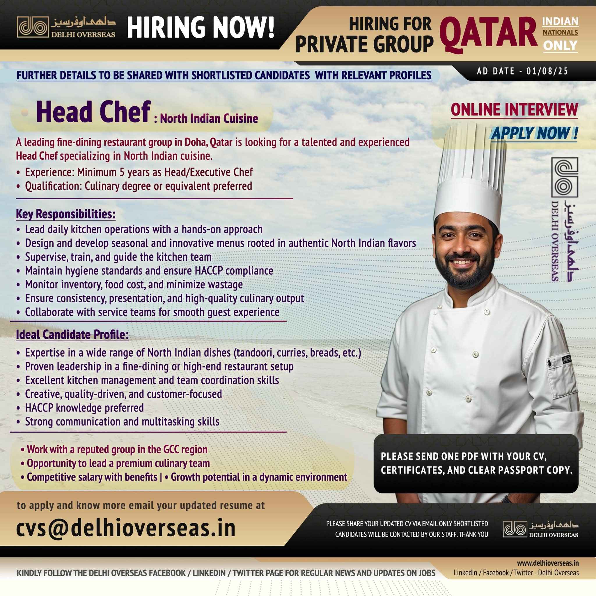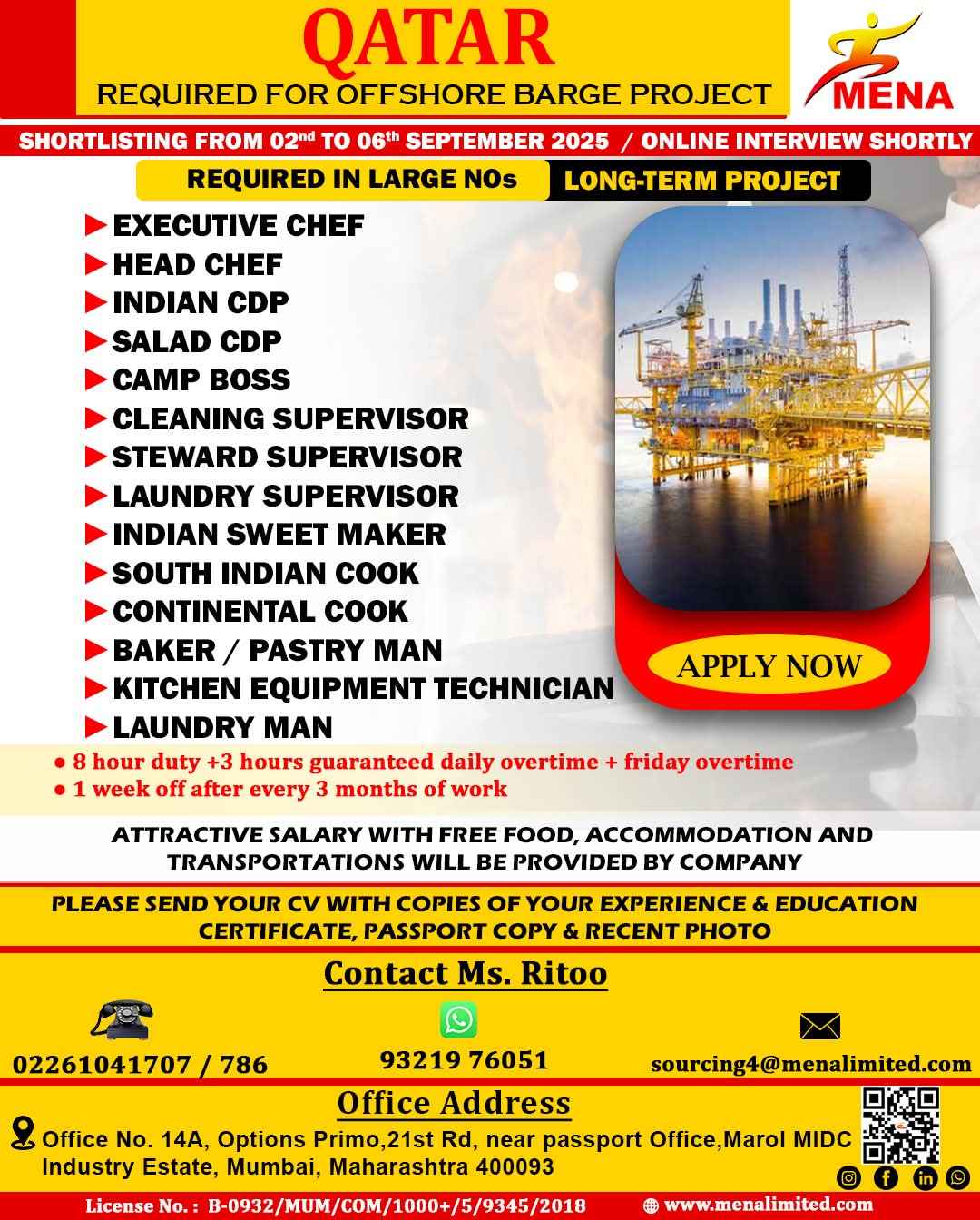 URGENT REQUIREMENT For a Leading Hospitality Company for their University Catering Projects in Doha, Qatar