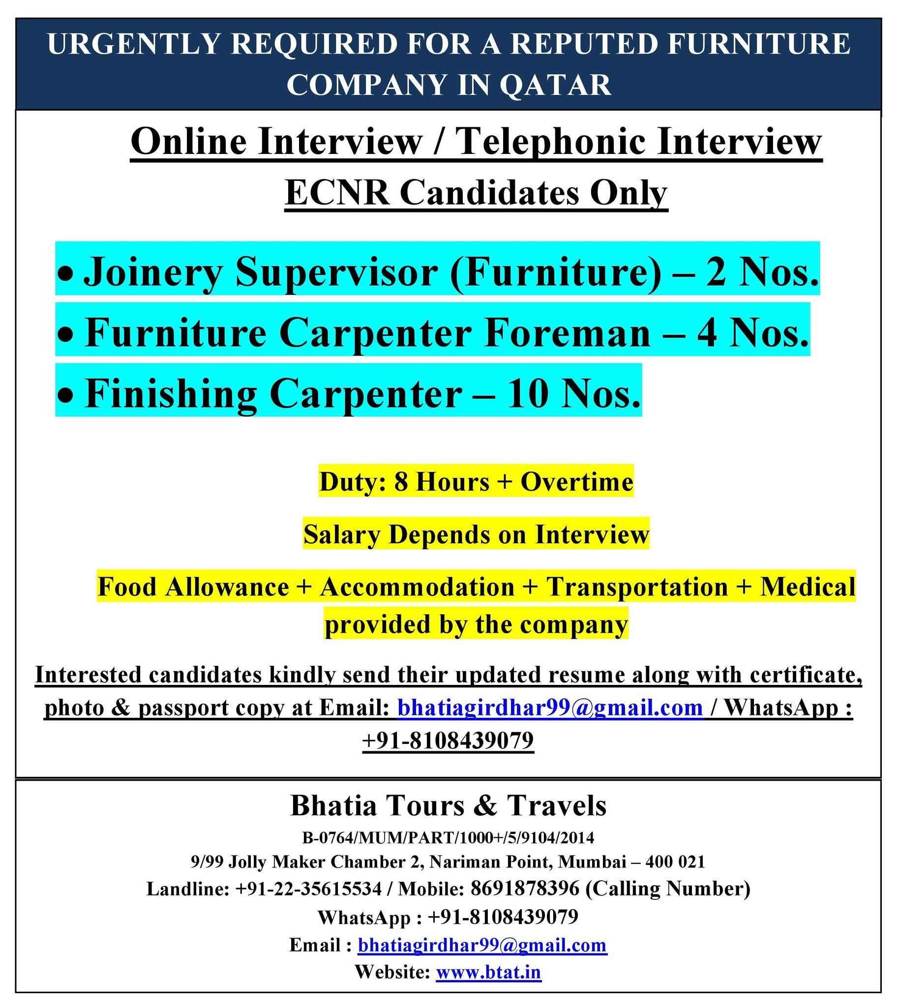 Urgently Required for QATAR