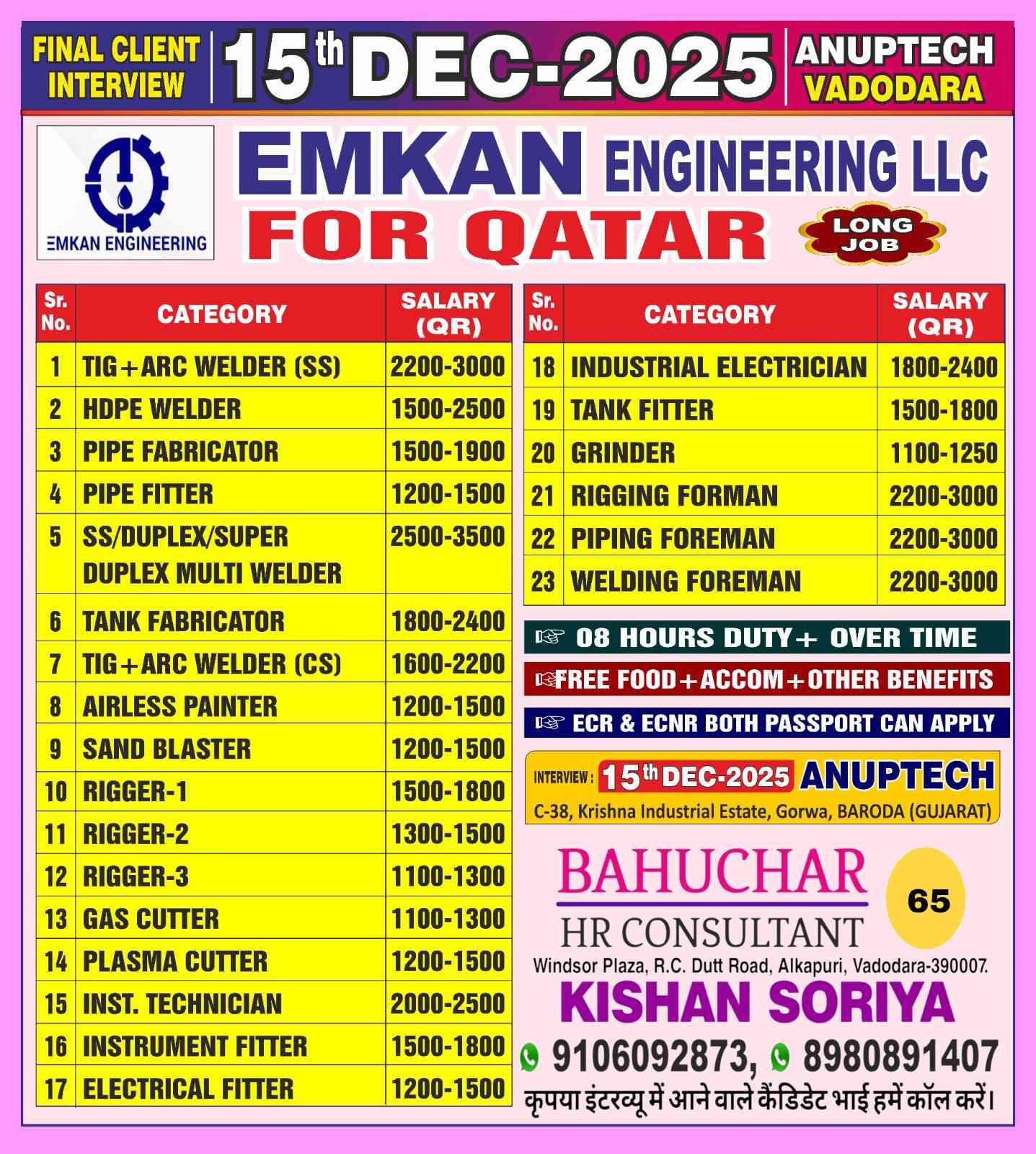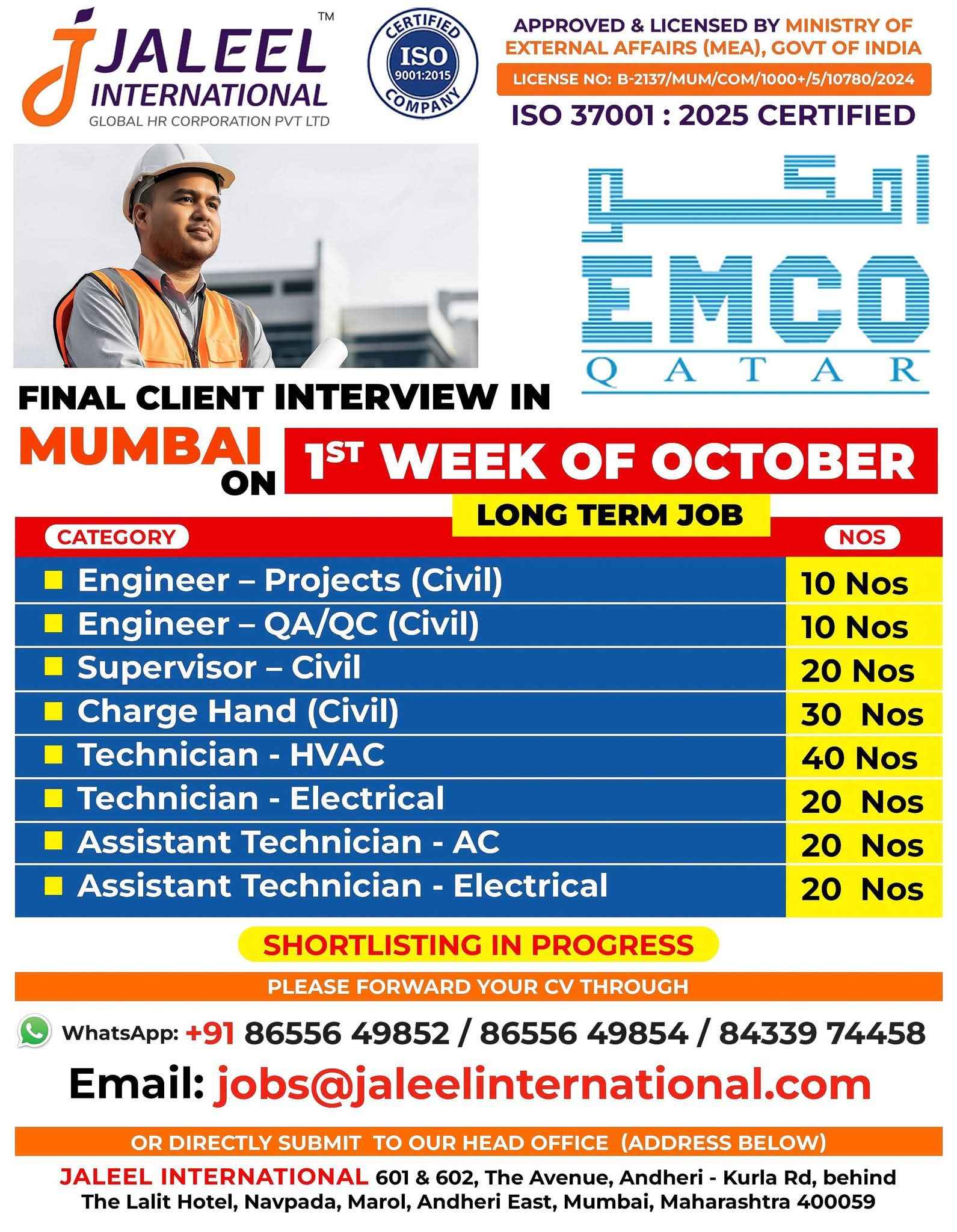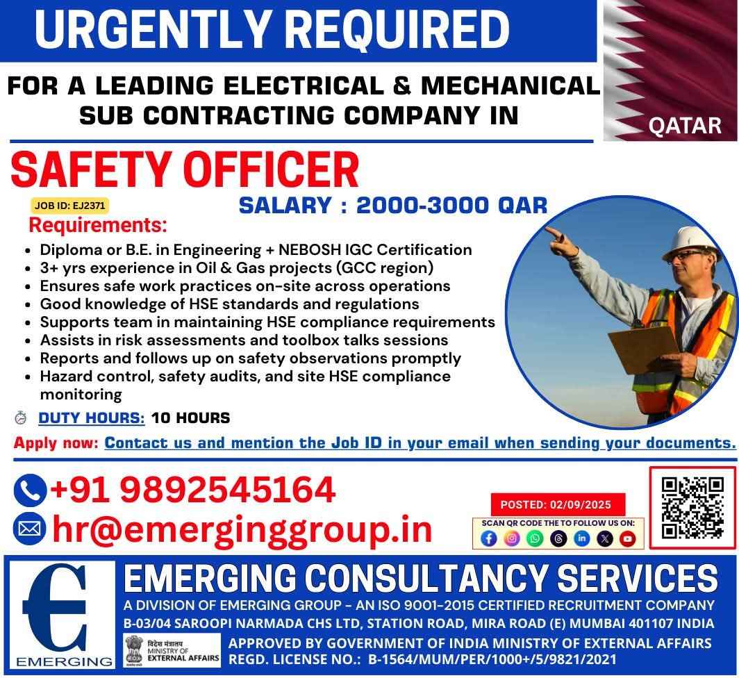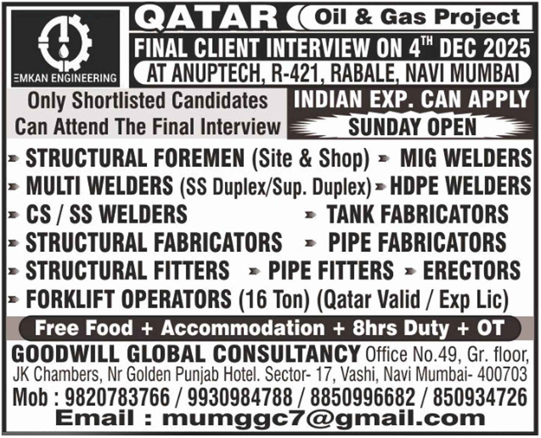 URGENT REQUIREMENT FOR EMKAN ENGG QATAR