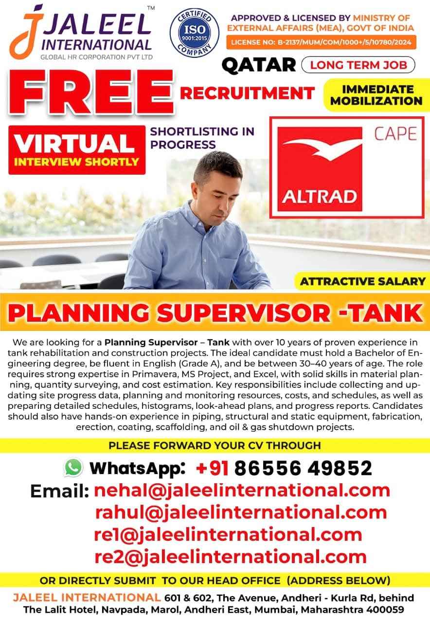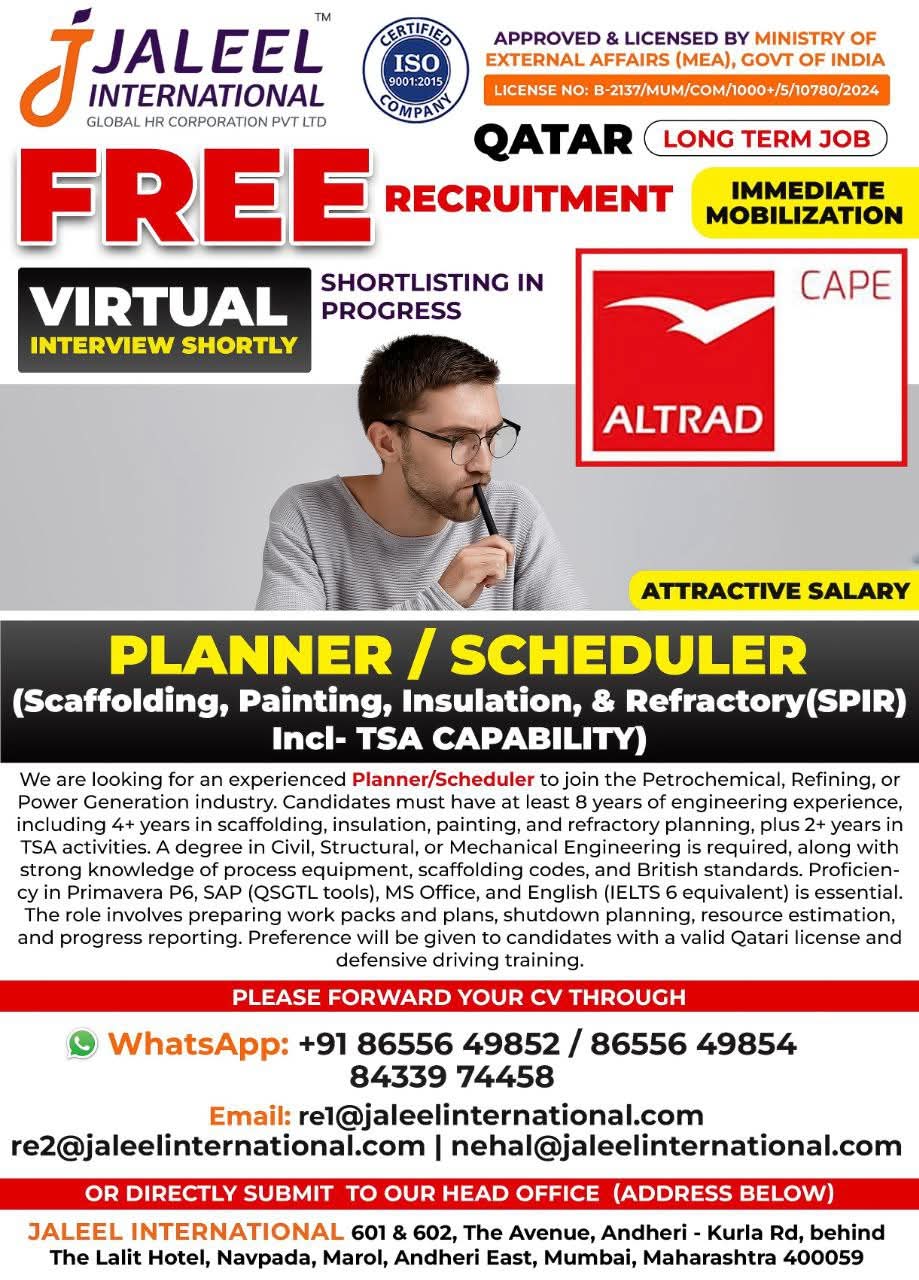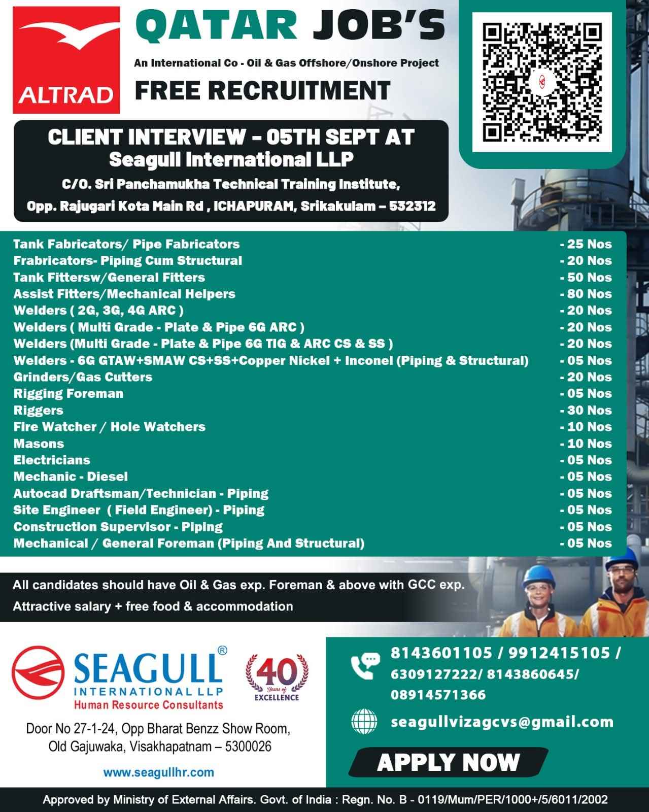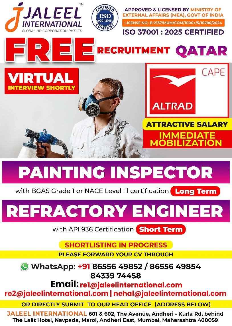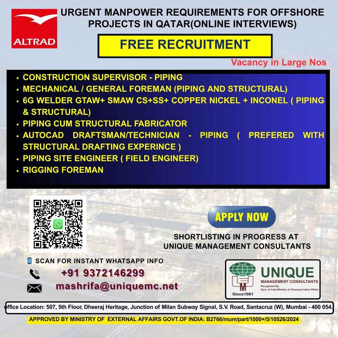QATAR JOB'S An International Company requires for their oil & gas Long Term Project. FREE RECRUITMENT ALTRAD