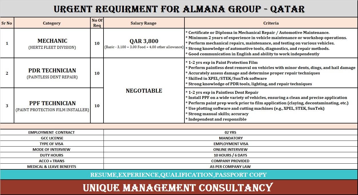 URGENT REQUIRMENT FOR ALMANA GROUP - QATAR
