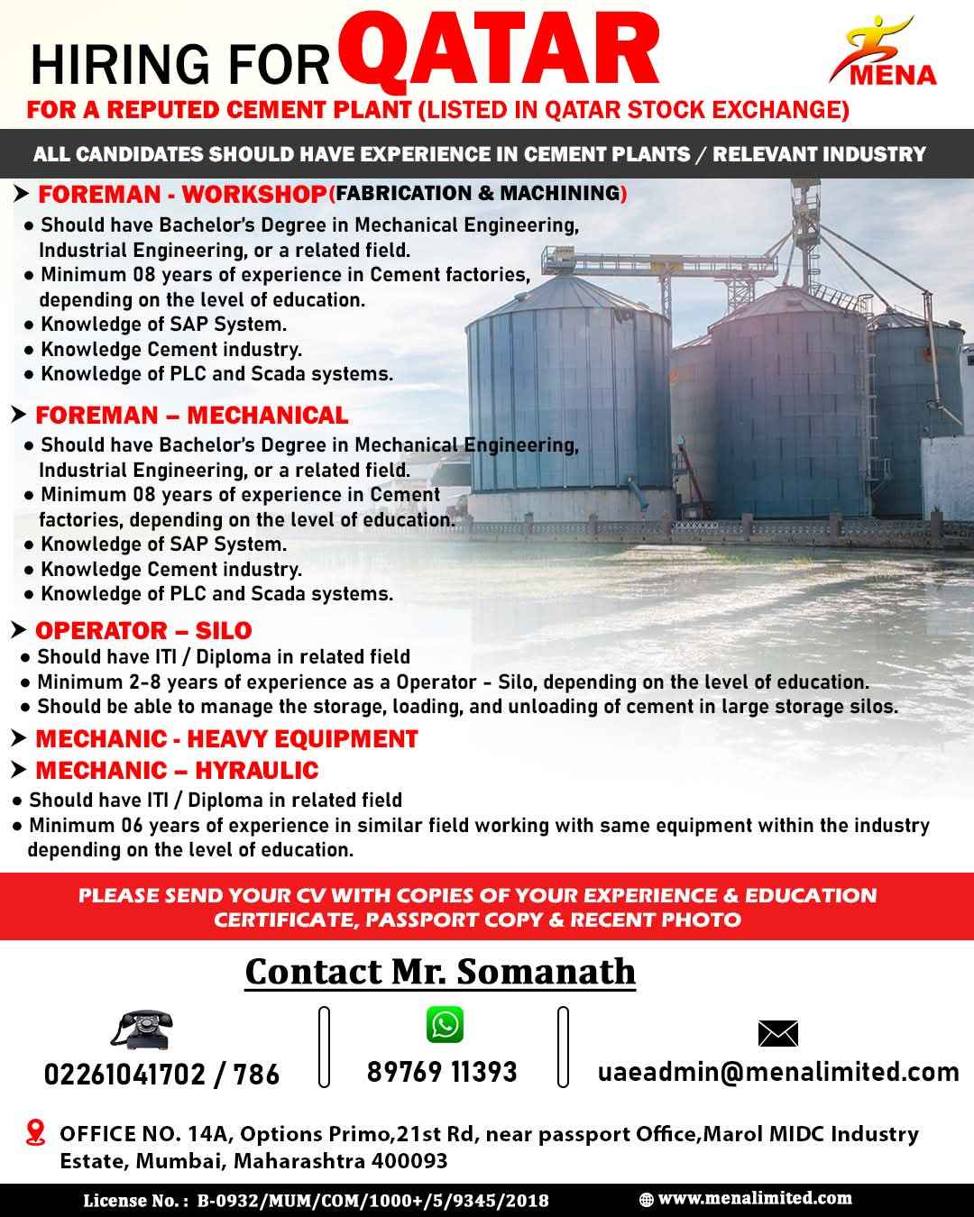 HIRING FOR QATAR MENA FOR A REPUTED CEMENT PLANT