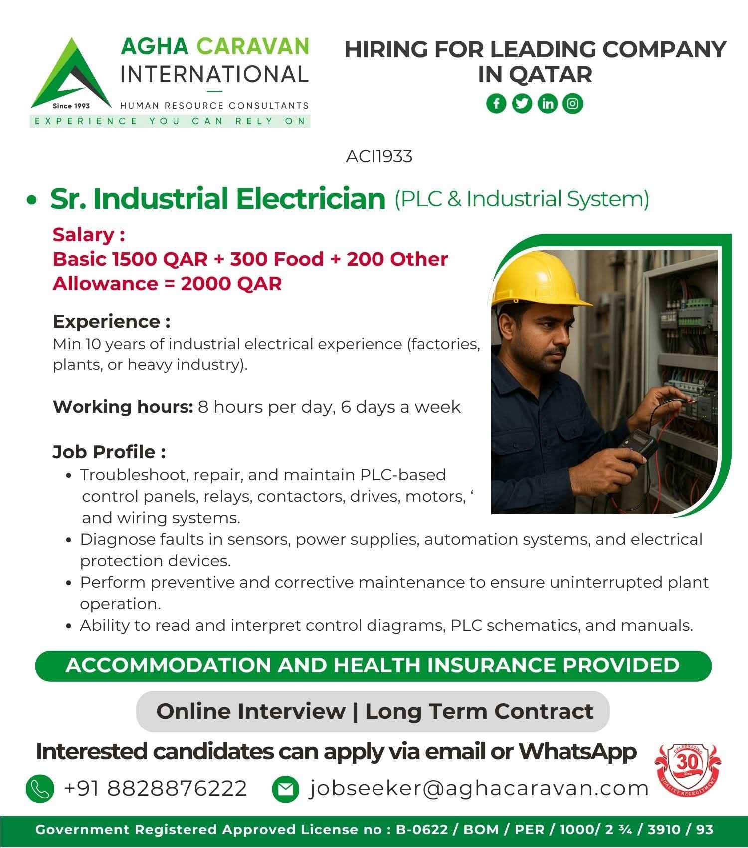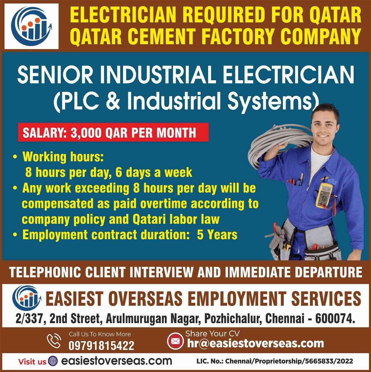 ELECTRICIAN REQUIRED FOR QATAR OATAR CEMENT FACTORY COMPANY