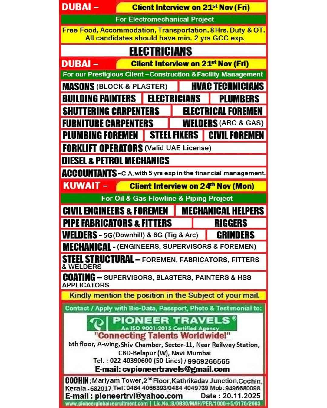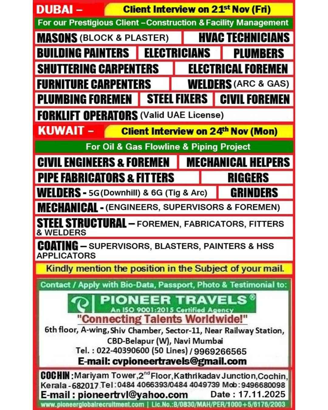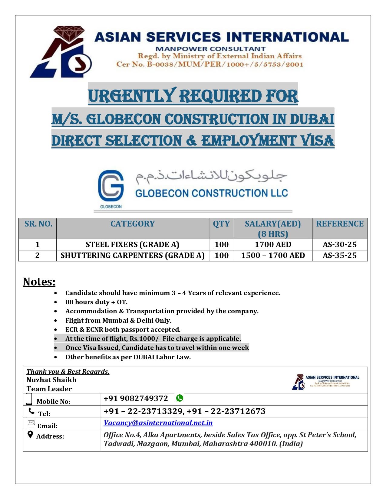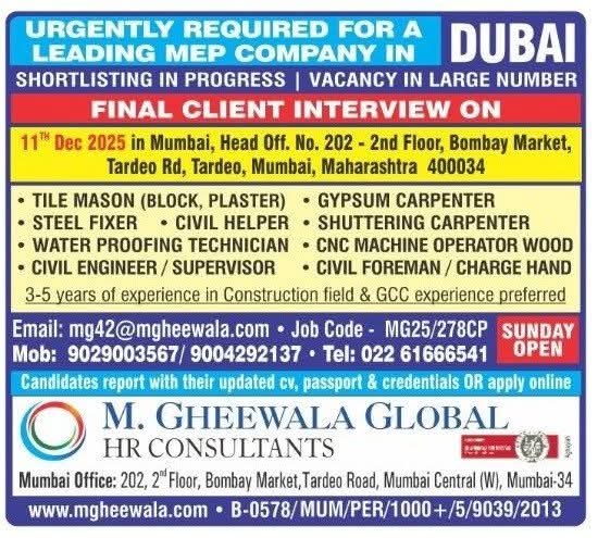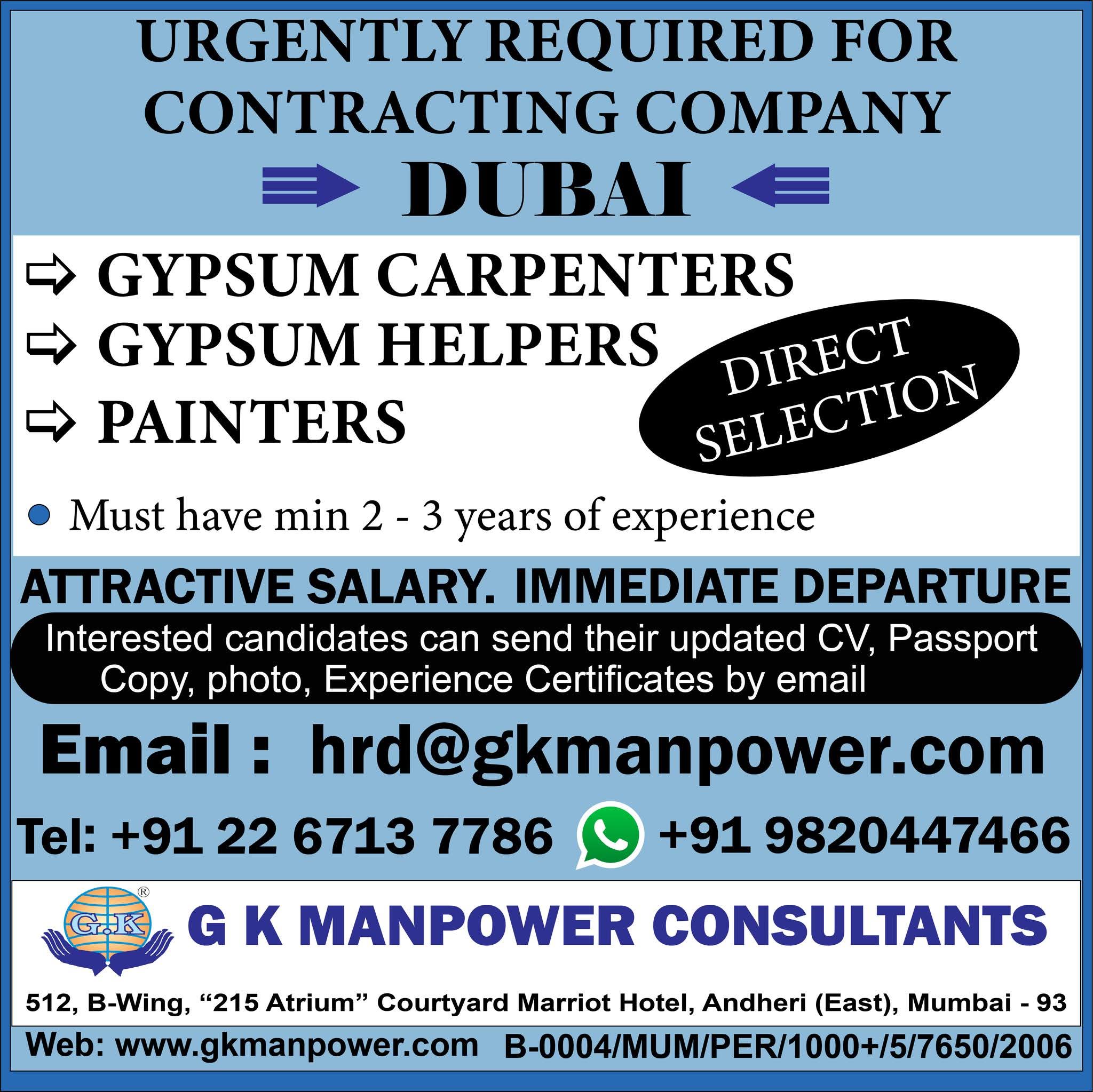 URGENTLY REQUIRED FOR M/S. GLOBECON CONSTRUCTION IN DUBAI