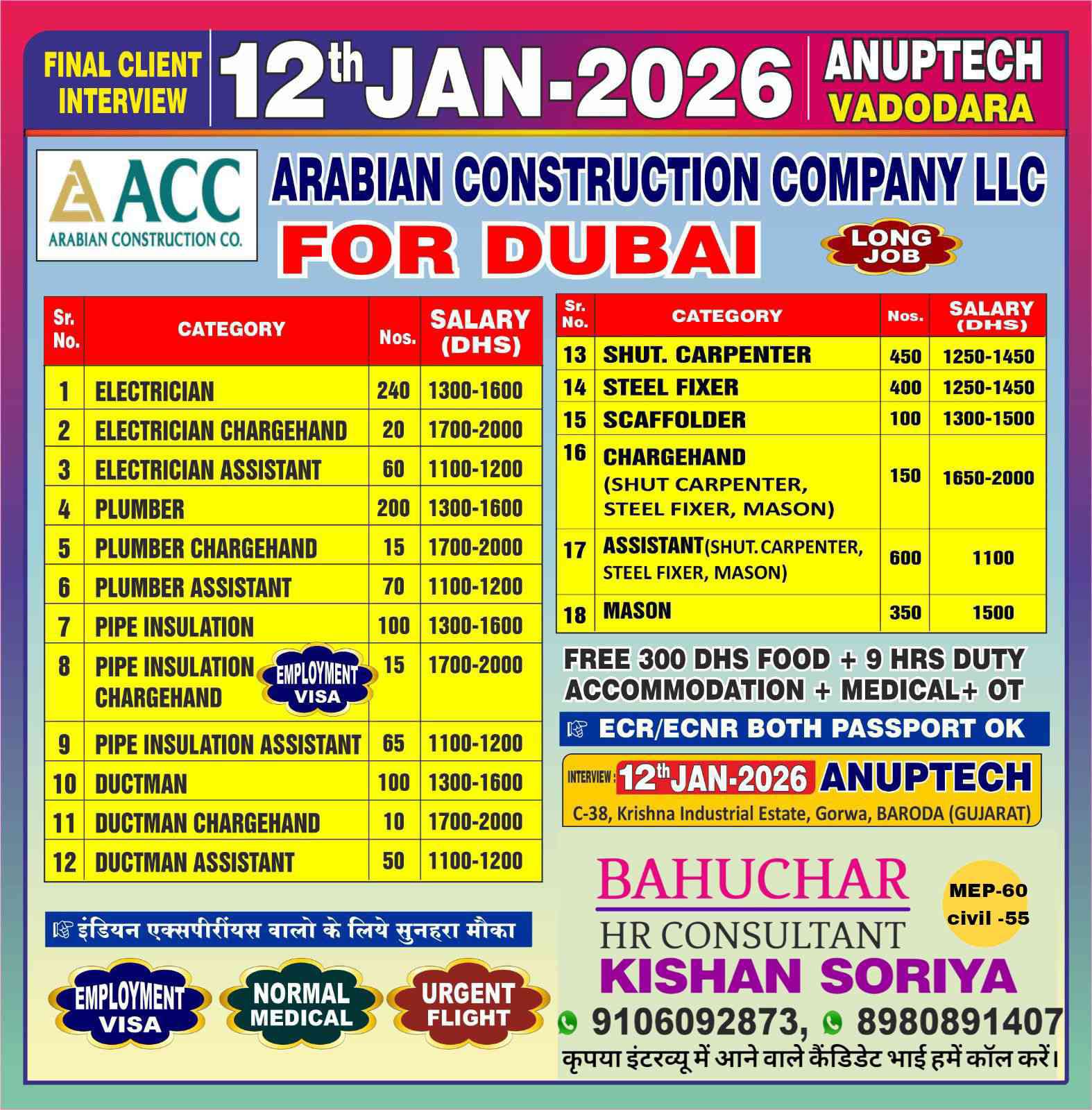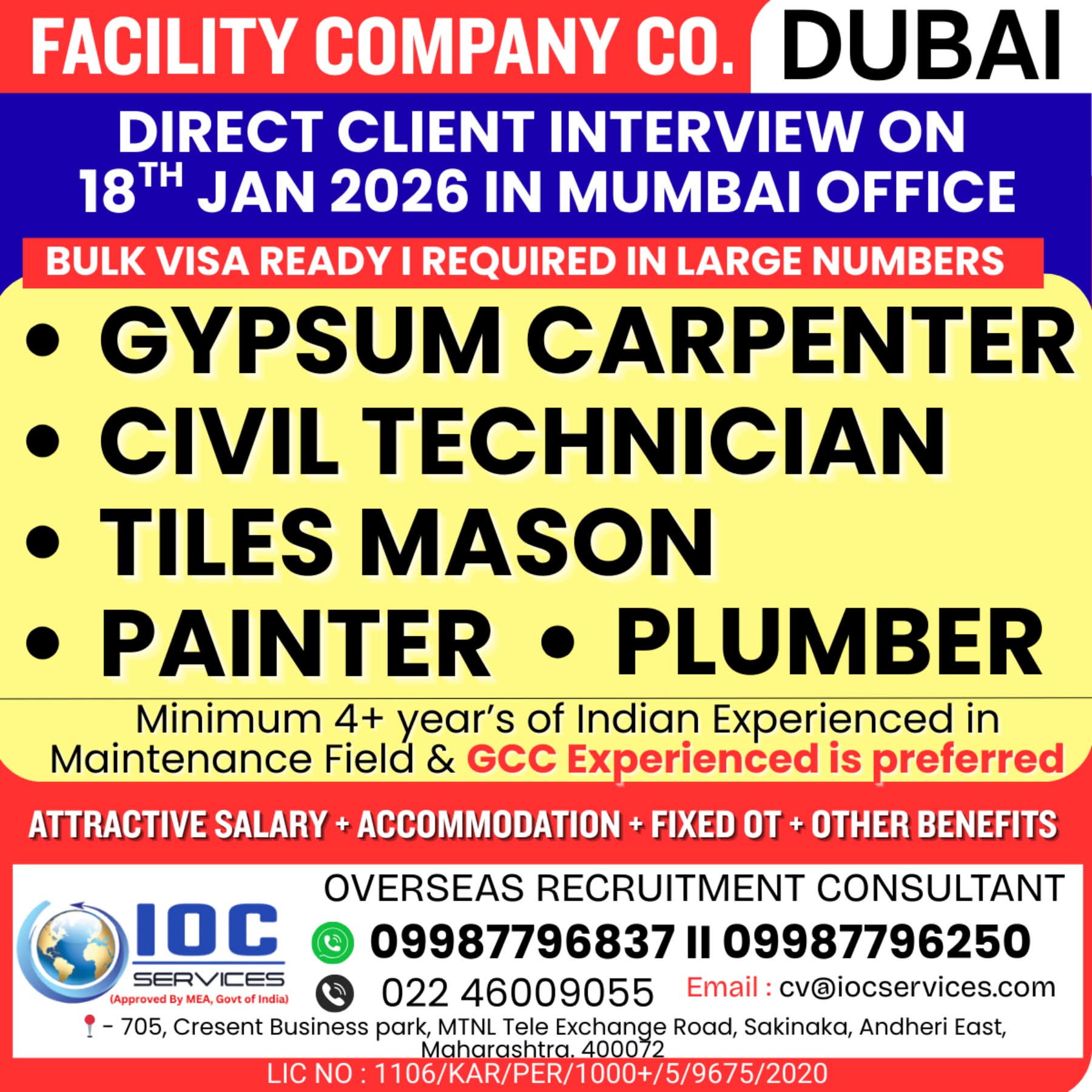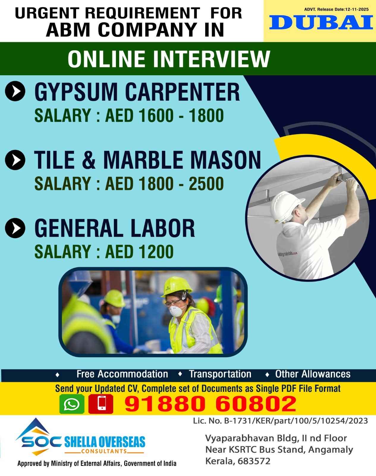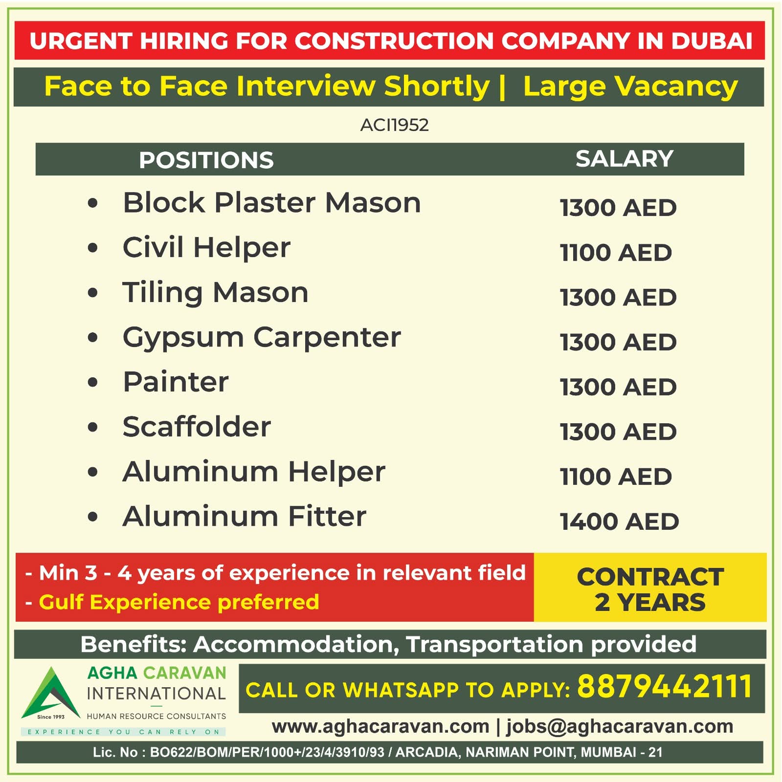 URGENTLY REQUIRED FOR M/S. GLOBECON CONSTRUCTION IN DUBAI
