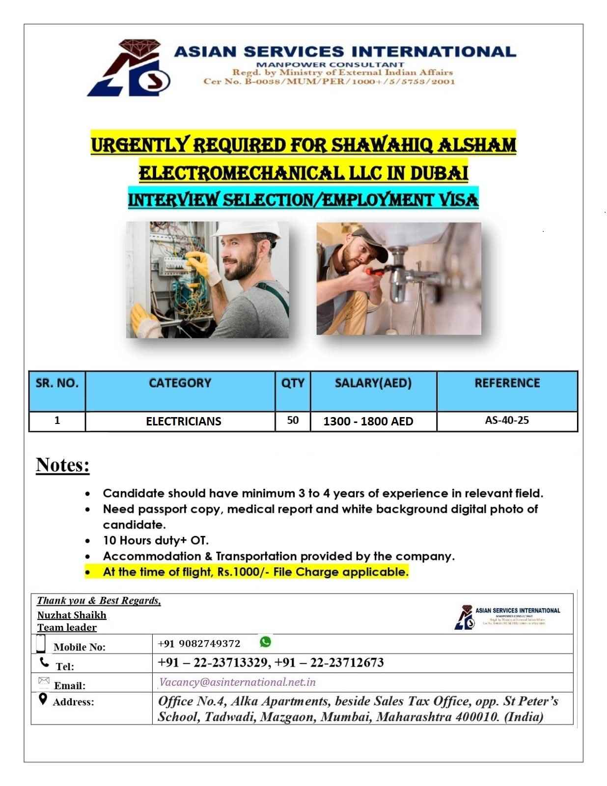 URGENTLY REQUIRED FOR SHAWAHIQ ALSHAM ELECTROMECHANICAL LLC IN DUBAI