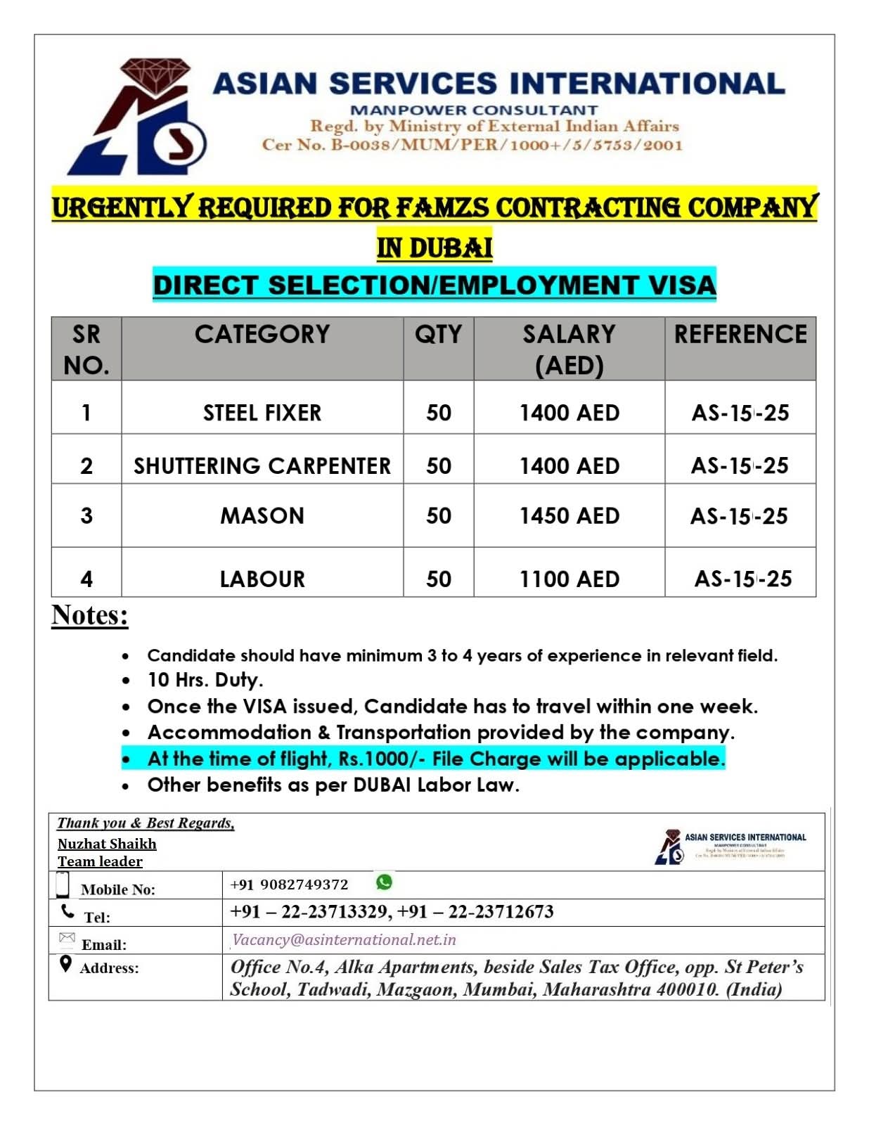 URGENTLY REQUIRED FOR FAMZS CONTRACTING COMPANY IN DUBAI