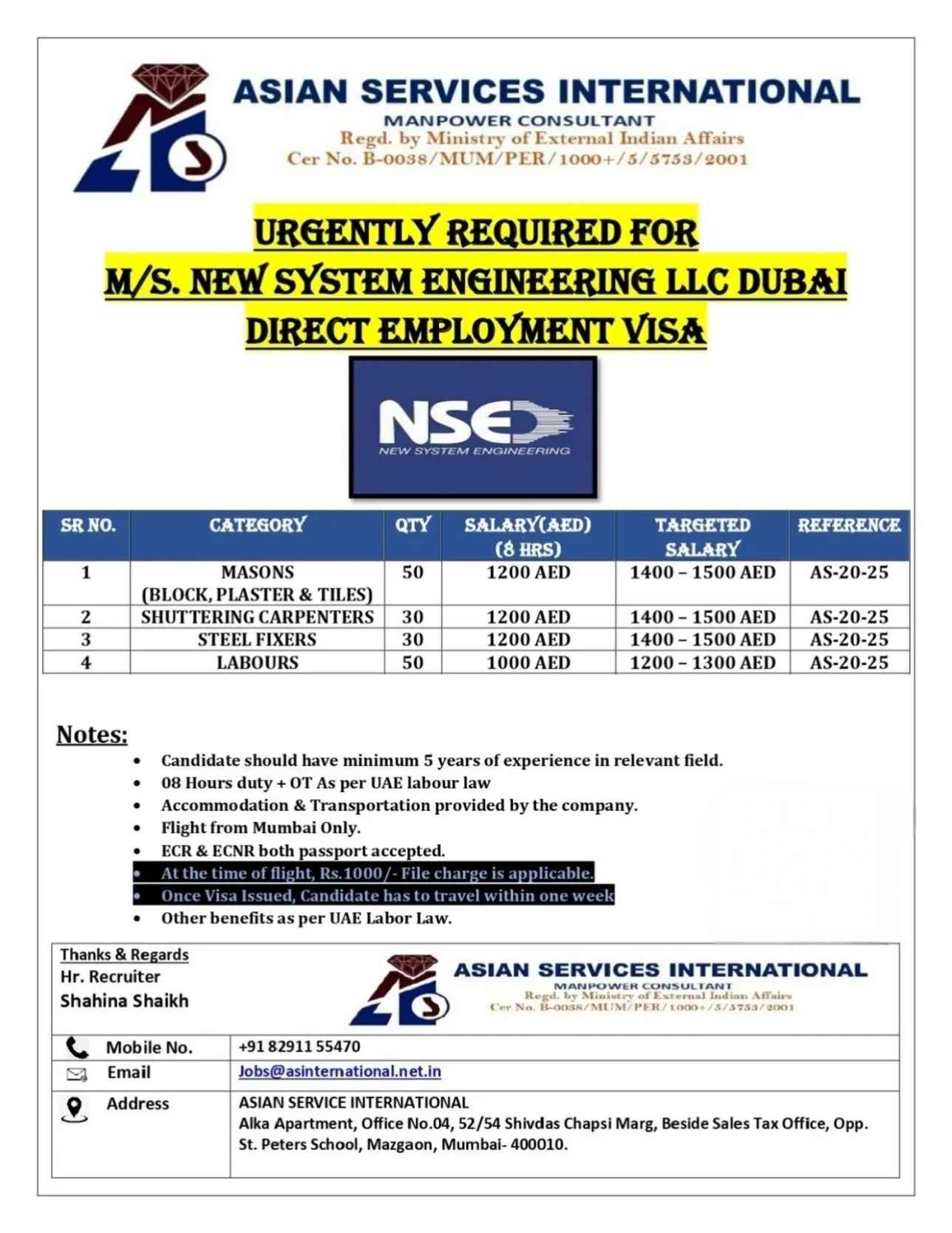 URGENTLY REQUIRED FOR M/S. NEW SYSTEM ENGINEERING LLC DUBAI