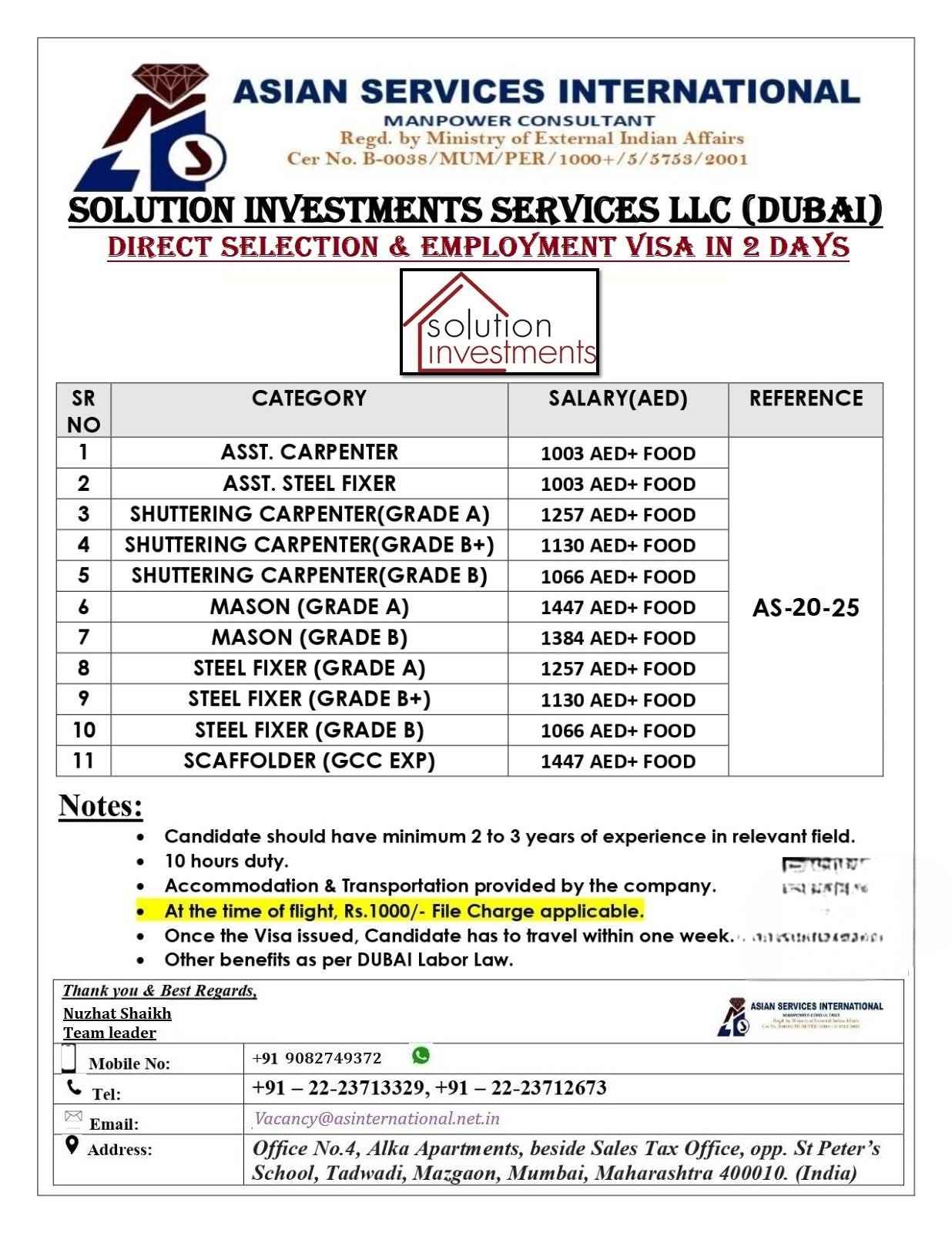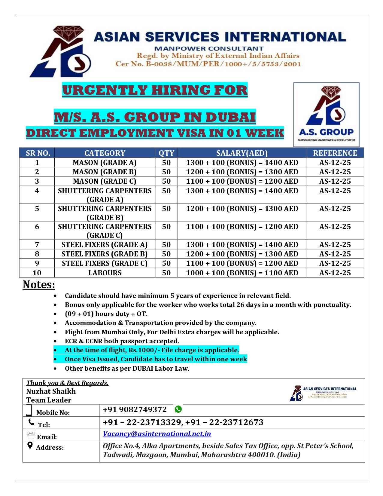 URGENTLY HIRING FOR M/S. A.S. GROUP IN DUBAI