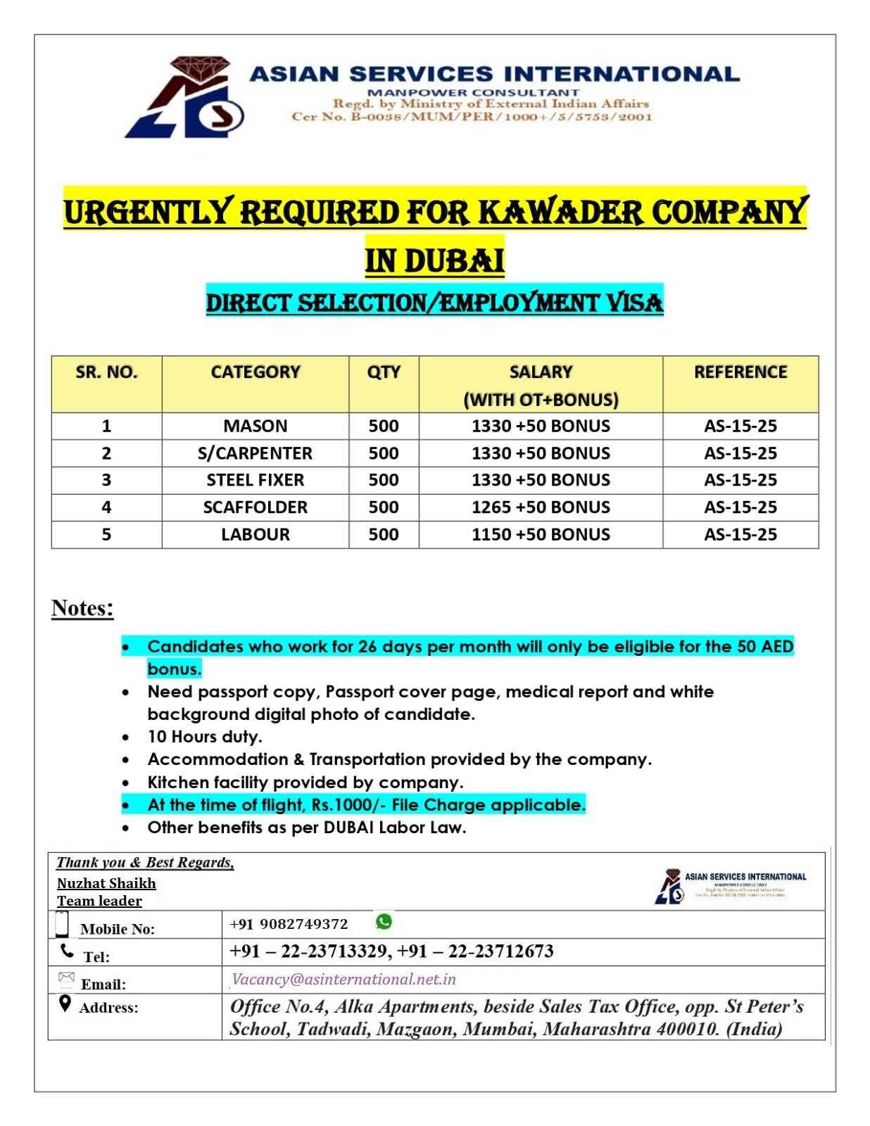 URGENTLY REQUIRED FOR KAWADER COMPANY IN DUBAI