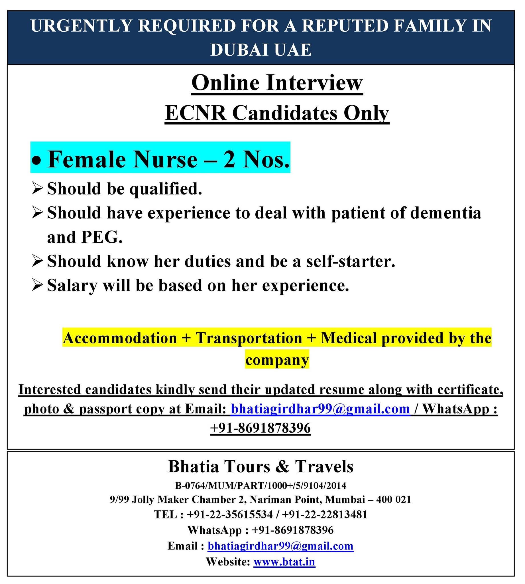 URGENT! HOME CARE NURSES FOR Dubai