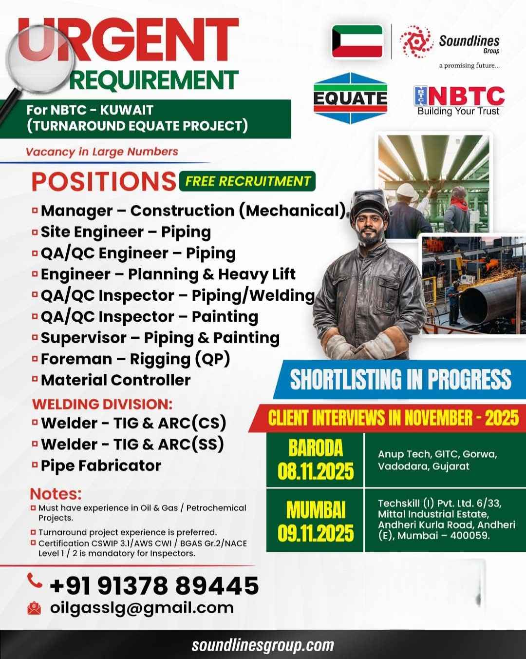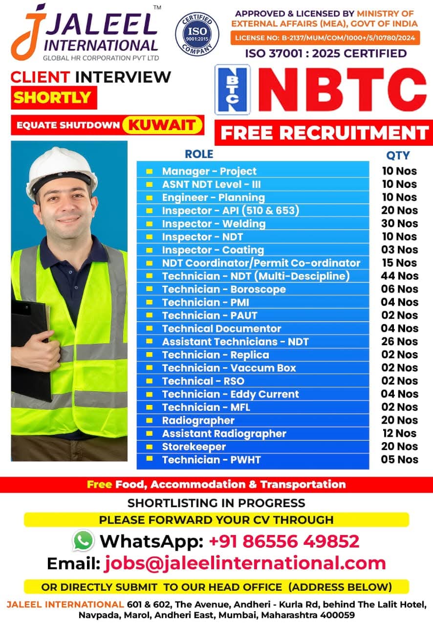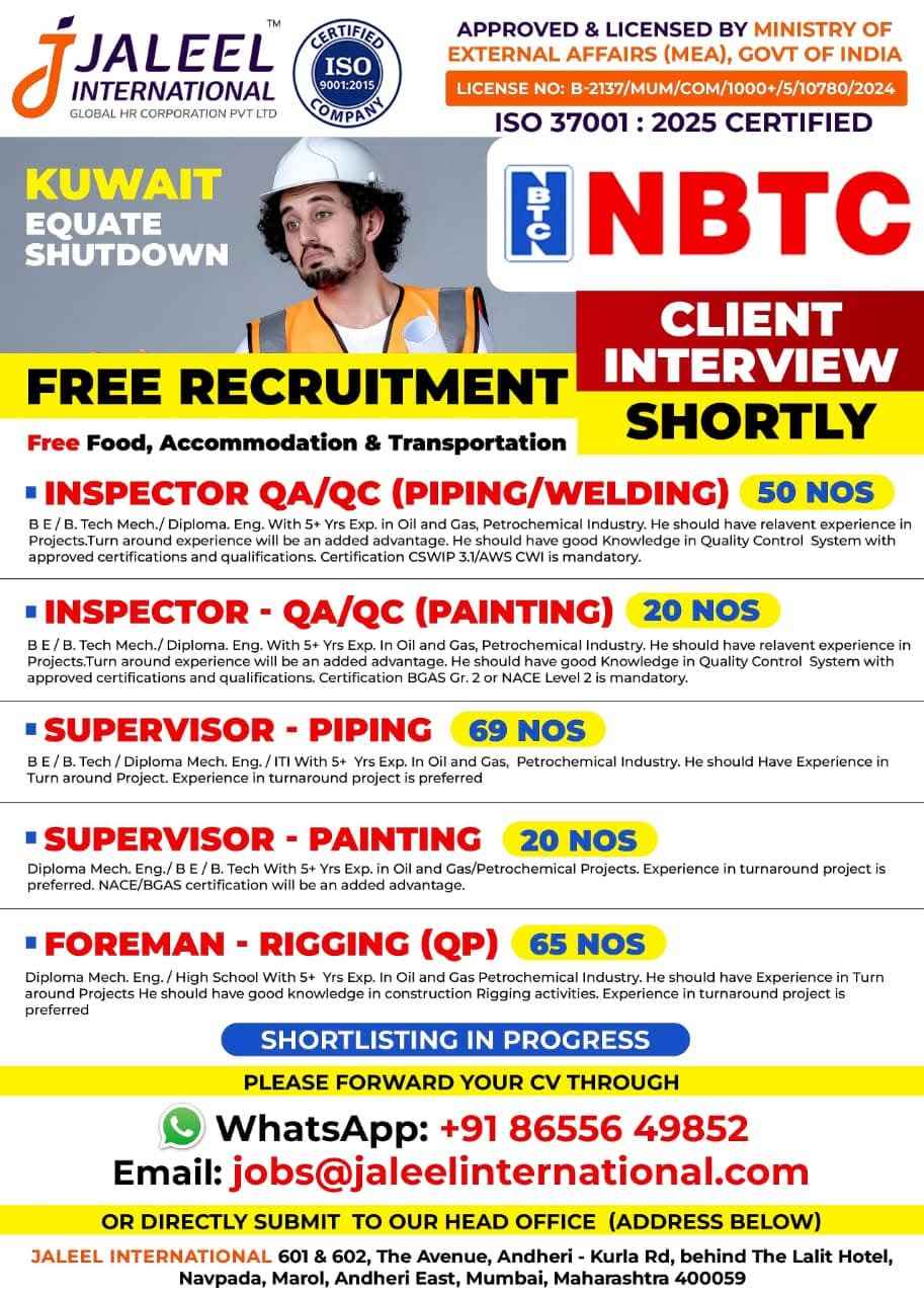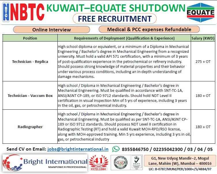 We are Hiring for NBTC EQUATE 6-7 Months Shutdown