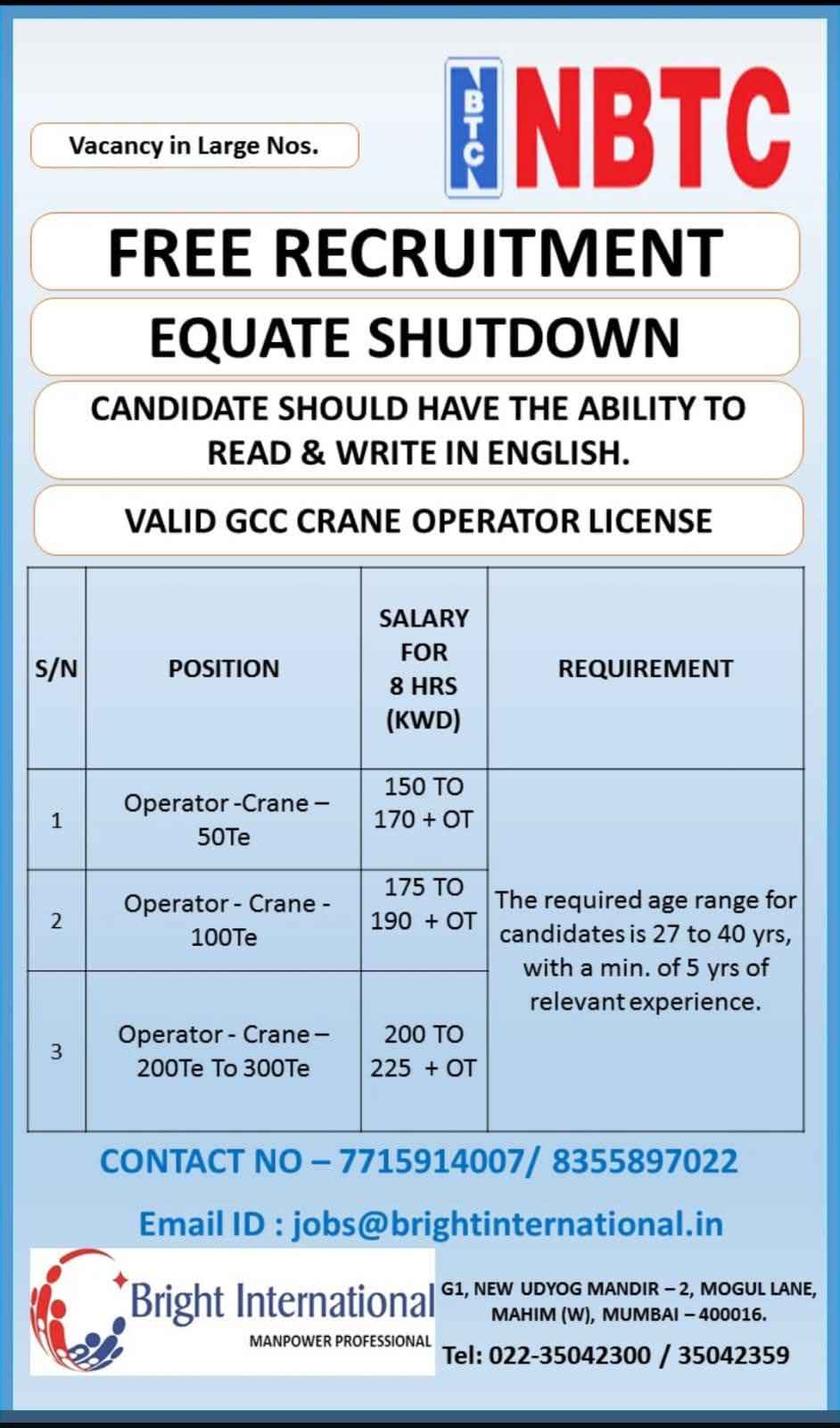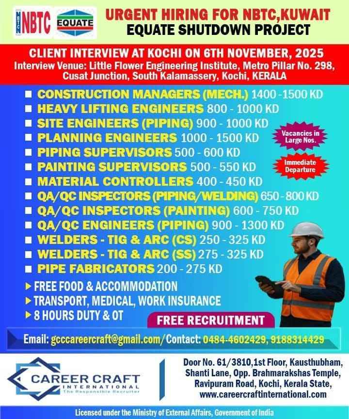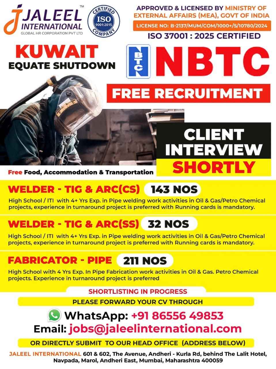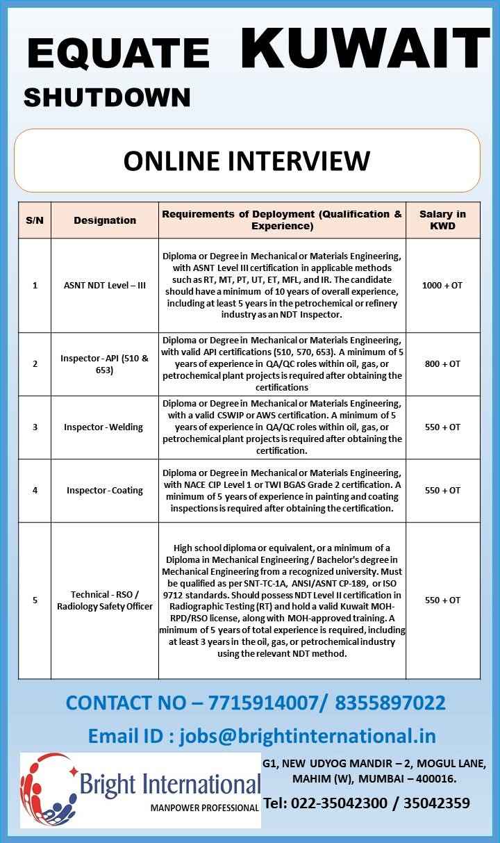 We are Hiring for NBTC EQUATE 6-7 Months Shutdown