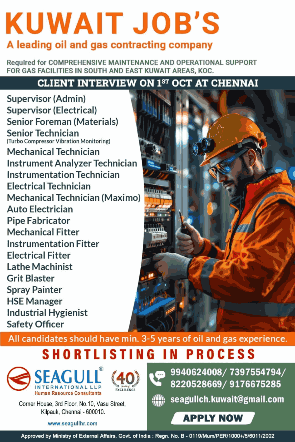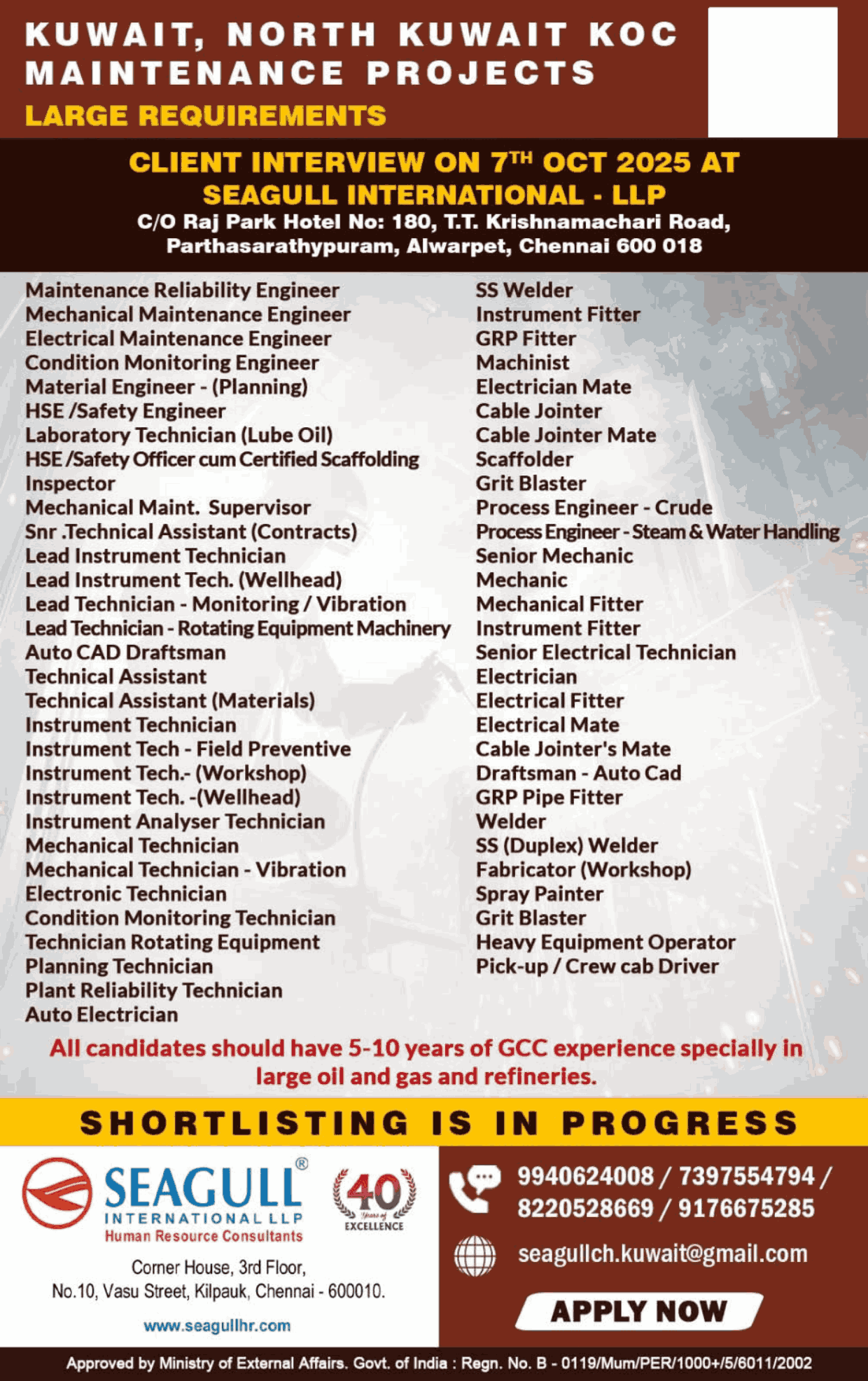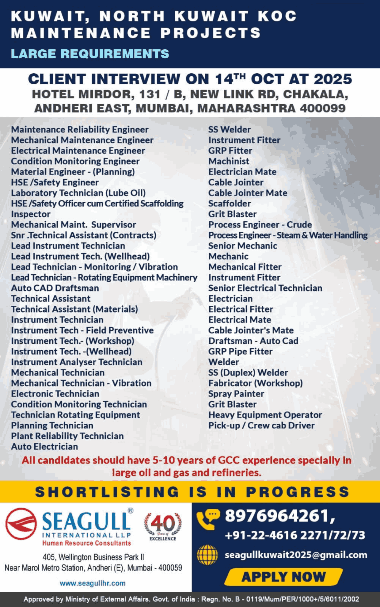 URGENTLY REQUIRED FOR ONE OF THE LEADING COMPANY FOR THEIR MAINTENANCE PROJECT IN KUWAIT